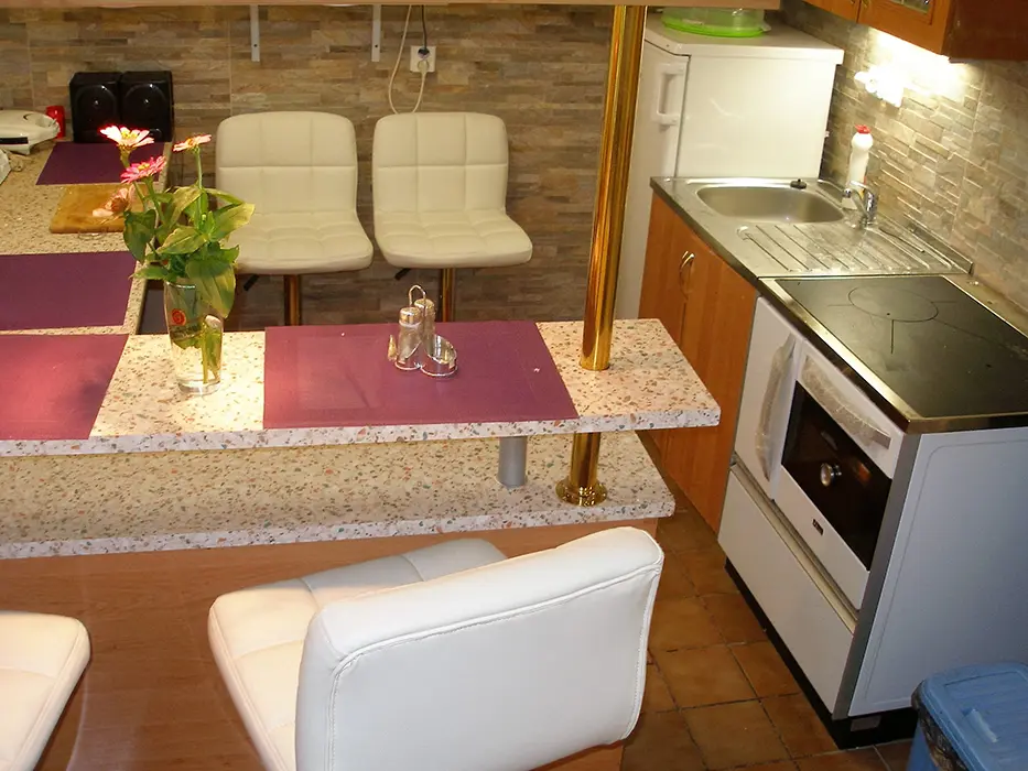 Obývací pokoj se sedací soupravou, 2x BTV,CD, DVD, krbová kamna, samostatná kuchyně - mikrovlnná trouba, el.vařič, varná konvice, toastovač, topinkovač, lednice, překapávač, stůl, židle. 1 ložnice 1x2 lůžka + 2 rozkládací křesla. Sociální zařízení - WC, sprchový kout, umyvadlo, teplá voda. Topení - tuhá paliva, el.přímotopy.