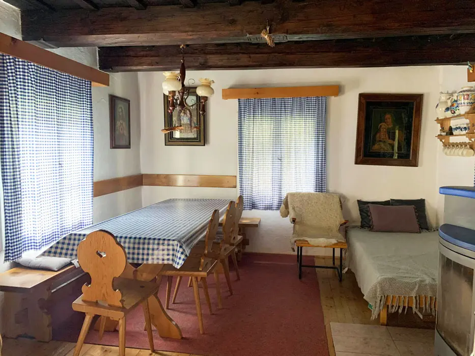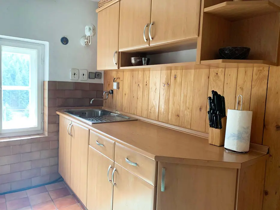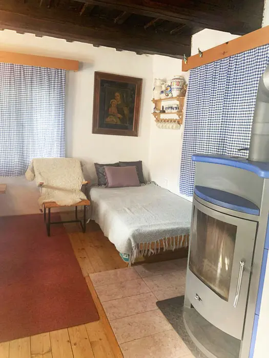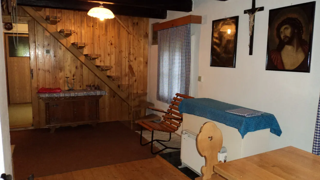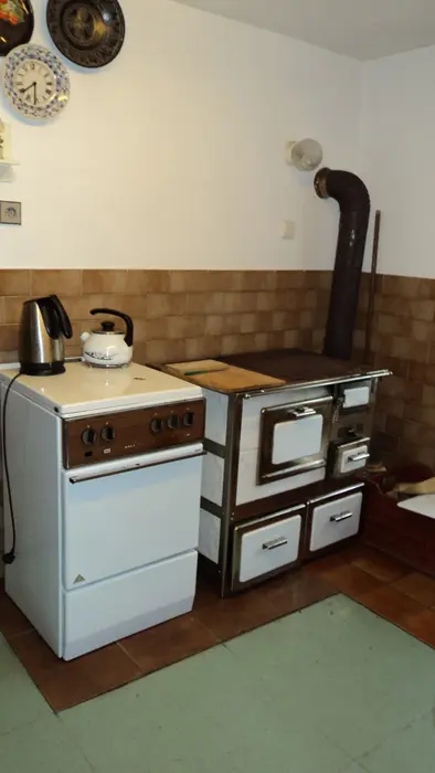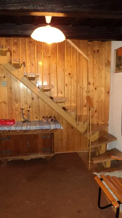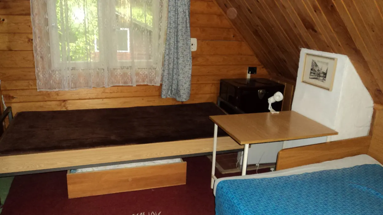 Obývací pokoj - stůl a židle, postel, kamna. Kuchyně - el. vařič, trouba, lednice, mrazák, varná konvice, kávovar, nádobí. 2 ložnice - 1x3, 1x4 lůžka. Sociální zařízení - vana, samostatné WC. Topení - 2x kamna, el. přímotopy. PITNÁ VODA Z VLASTNÍHO VRTU