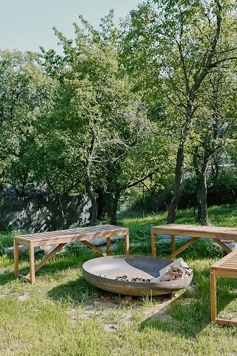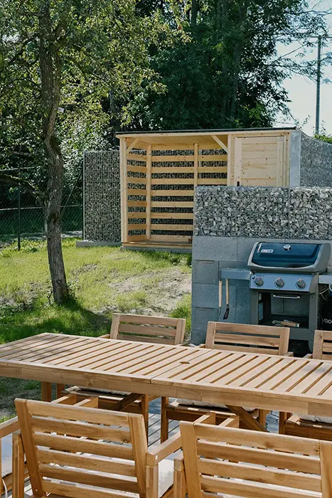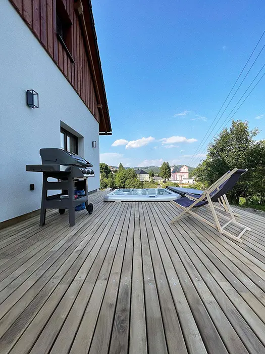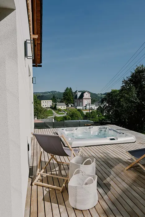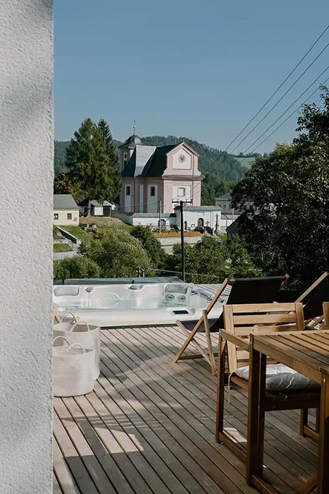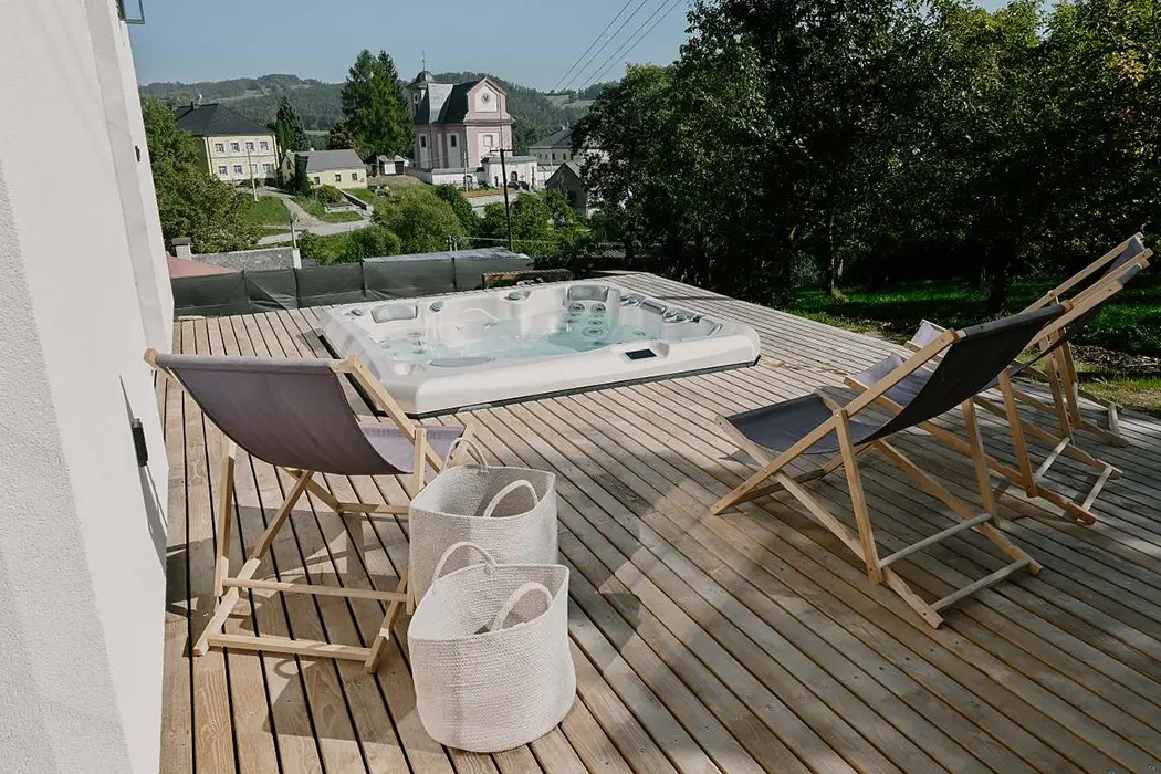 Venkovní posezení na terase s výhledem na místní kostel, vířivka, lehátka, plynový gril, otevřené ohniště