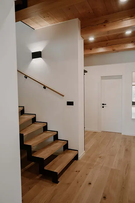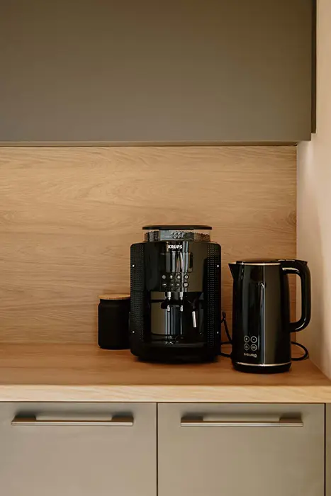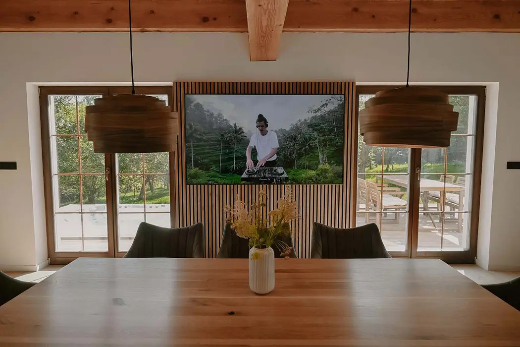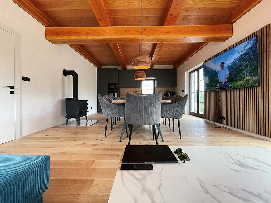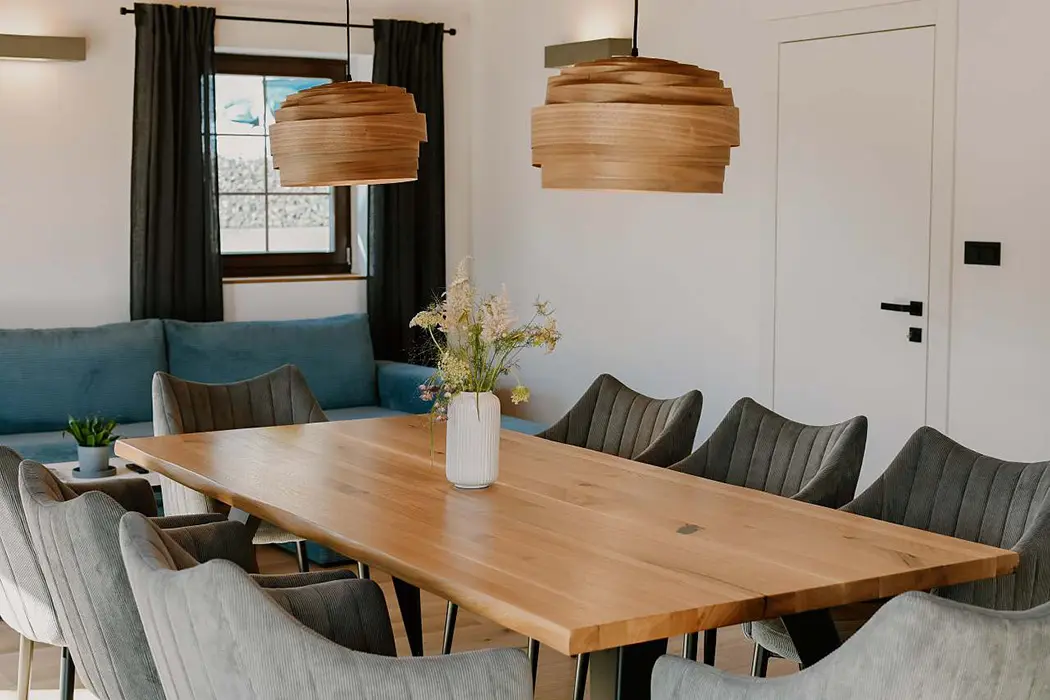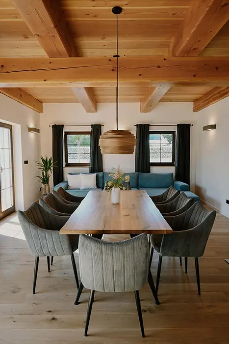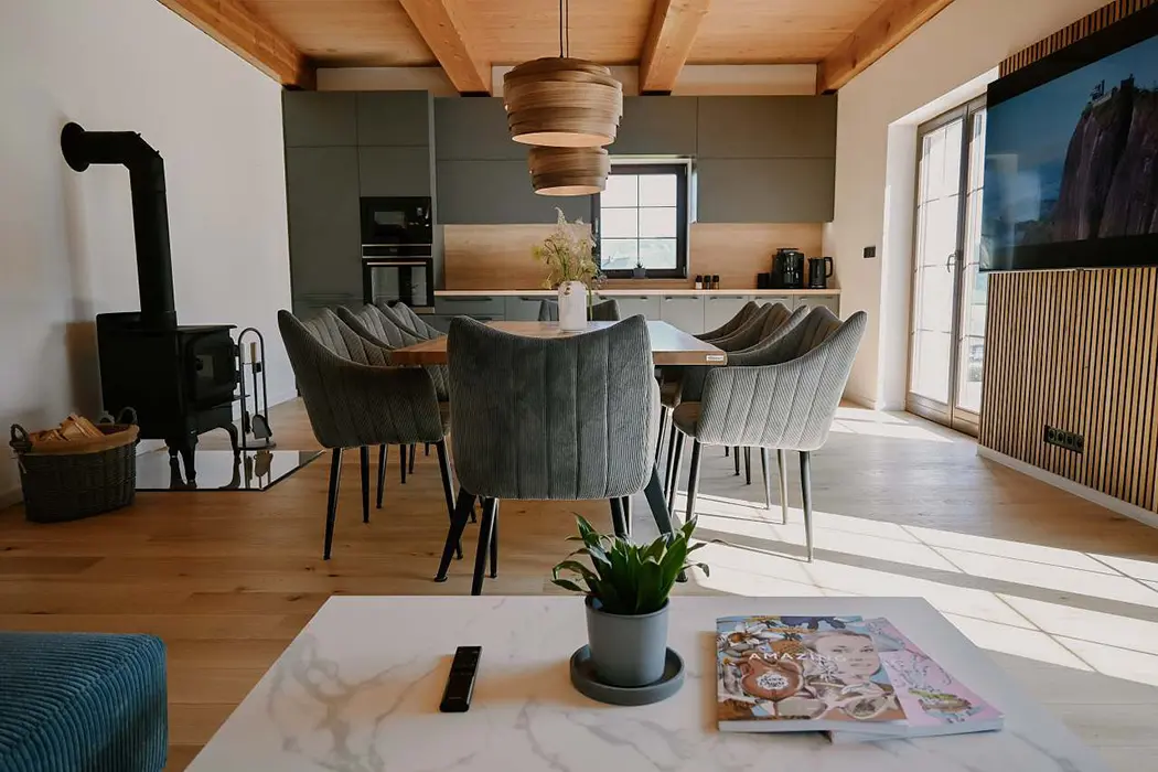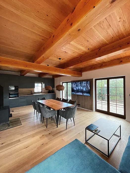 V přízemí - prostorná obytná část spojená s kuchyní - sedací souprava, LCDTV, velký jídelní stůl a židle, krbová kamna, vybavení kuchyně - el. trouba, mikrovlnka, varná deska, myčka, lednice, nádobí. 5 ložnic - 5x2 lůžka. Soc. zařízení - 5x - každá ložnice má svoje - sprchu + WC. Topení - podlahové vytápění v celém objektu, krbová kamna, klimatizace