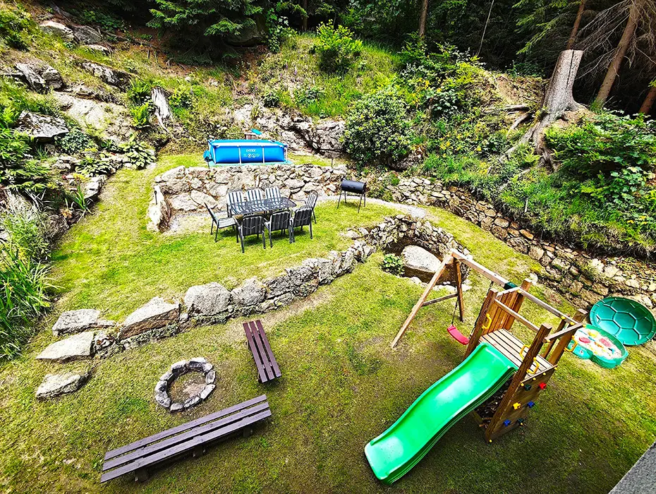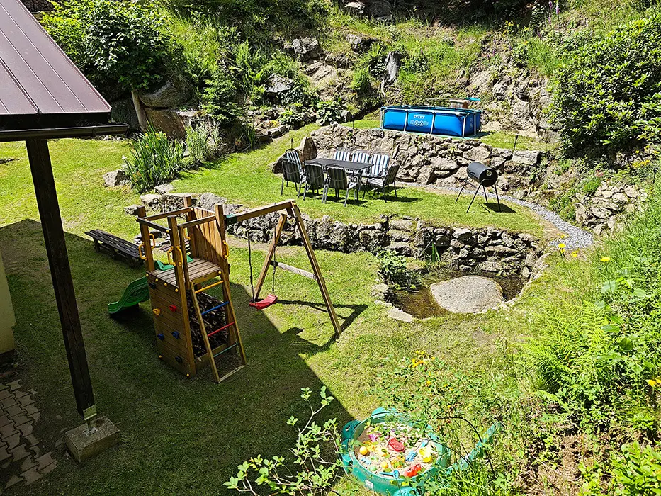 Zahradní nábytek, ohniště, dětská stěna s houpačkou, šplhacím lanem a lezeckou stěnou, v letních měsících bazén 2,6 x 1,6 m, gril