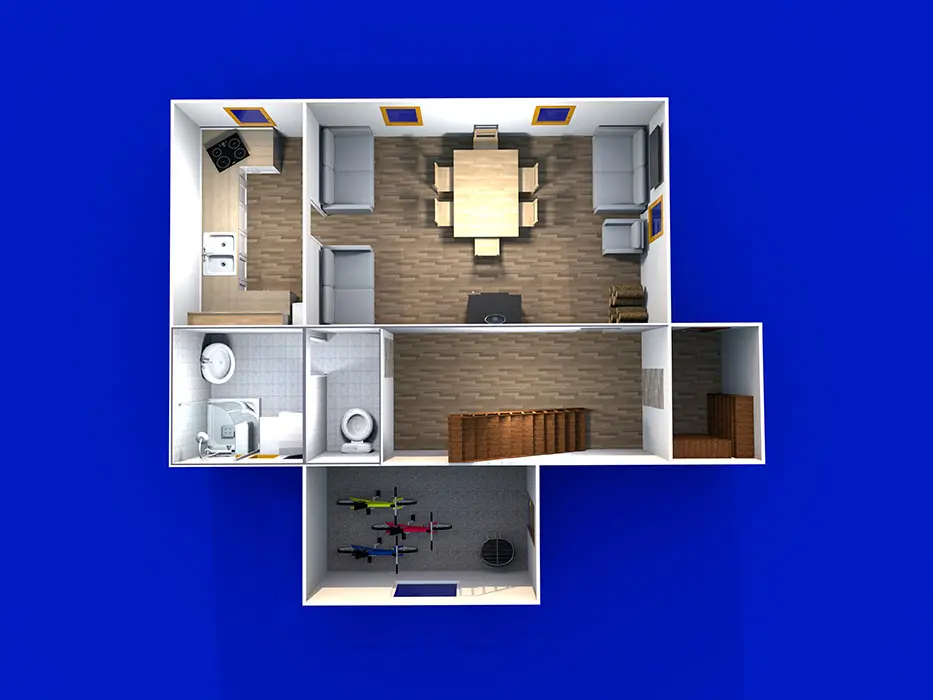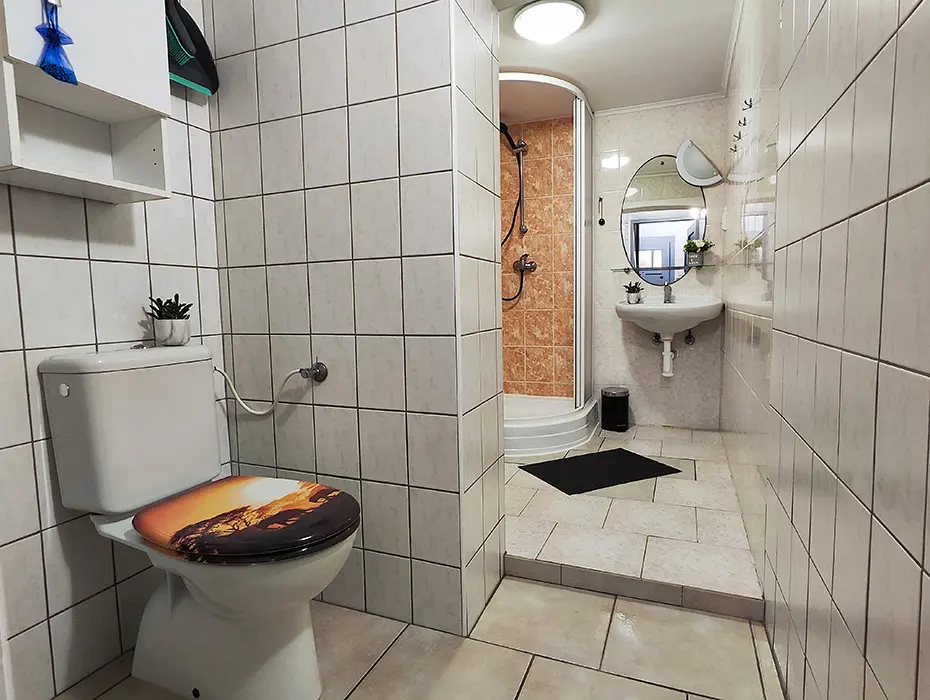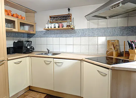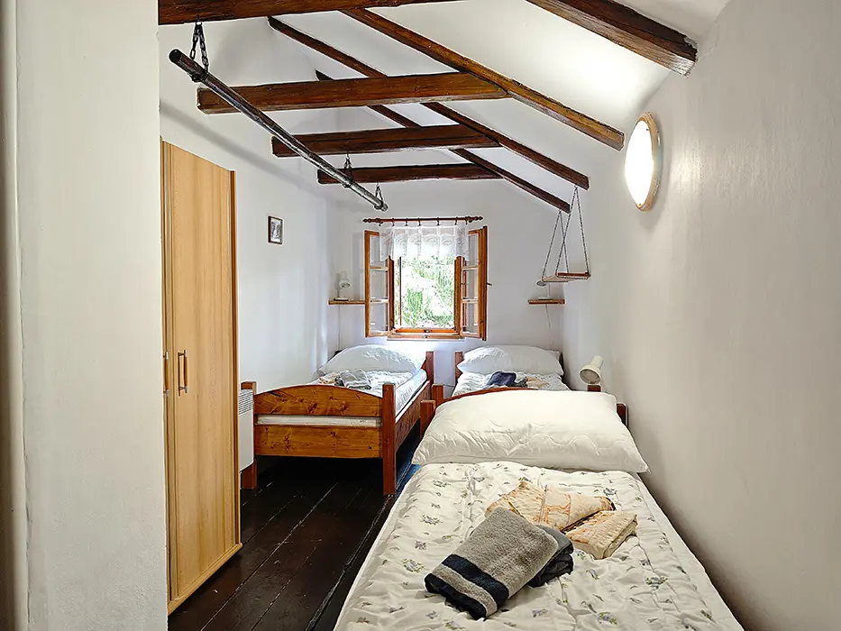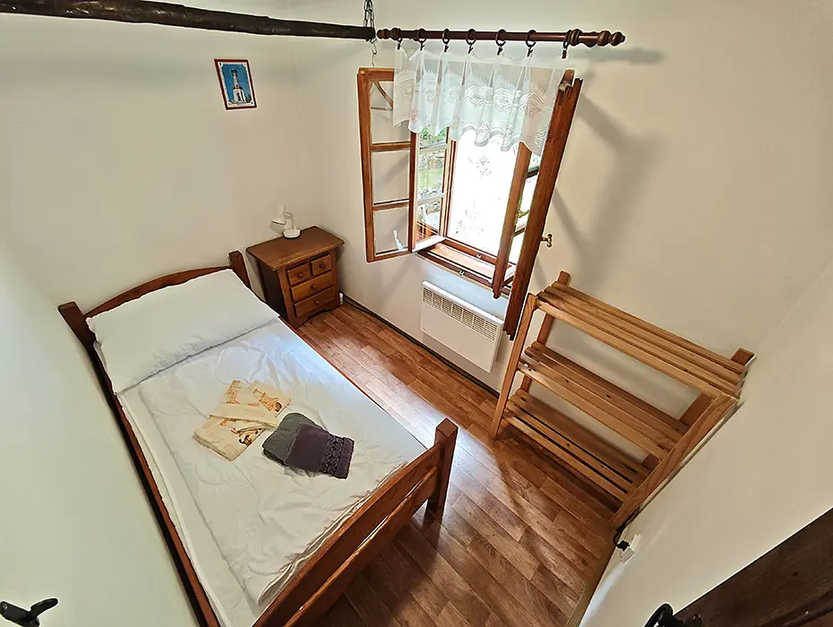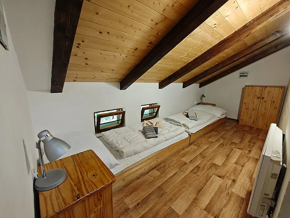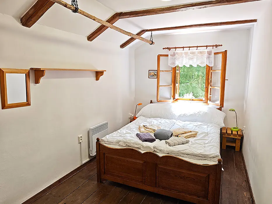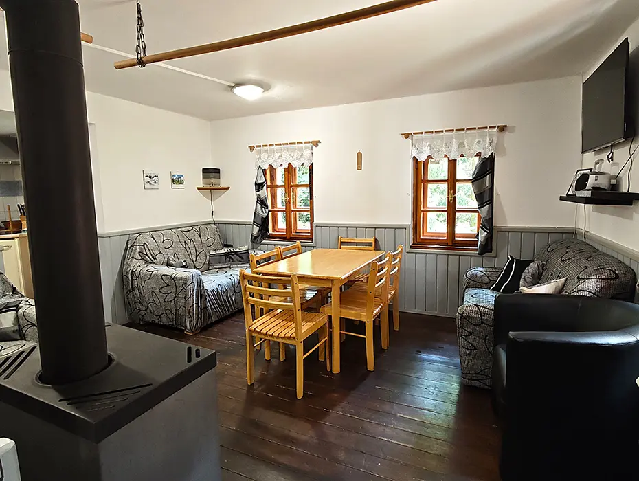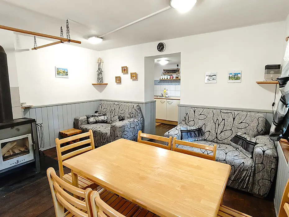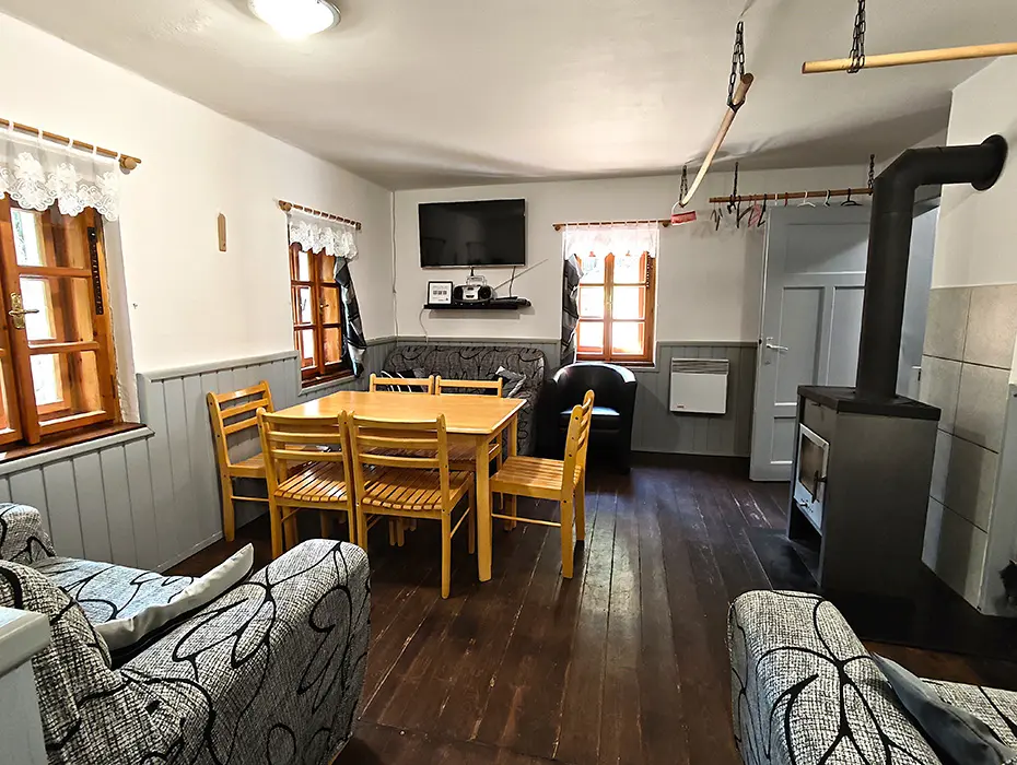 Obývací pokoj s posezením u krbových kamen, samostatná kuchyně - linka s vestavěnou lednicí, další lednice s mrazákem, myčka a sklokeramická deska, dále trouba, kávovar, mikrovlnná trouba, varná konvice, topinkovač, nádobí. 4 samostatné ložnice - 1x1, 2x2, 1x3 lůžka. Sociální zařízení - oddělené WC, koupelna se sprchovým koutem. Topení - krbová kamna v obývacím pokoji, el.přímotopy ve všech místnostech.