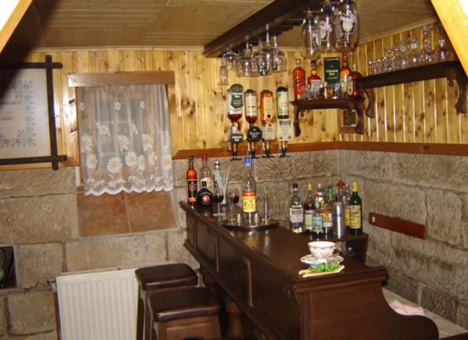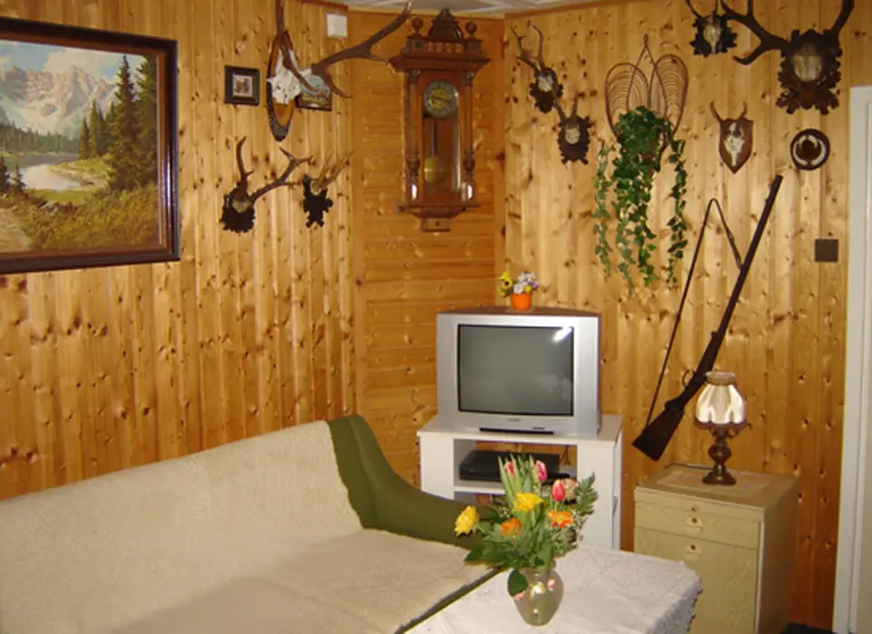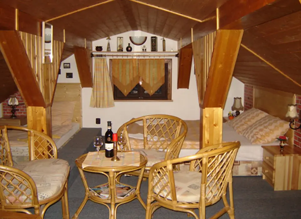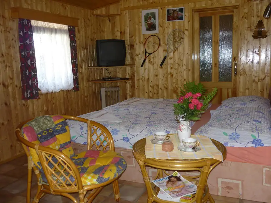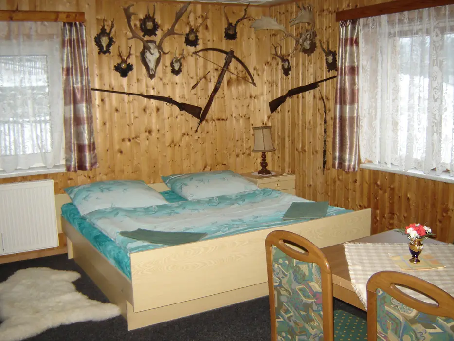 Restaurace s obsluhou – pouze pro ubytované klienty s domácí kuchyní, společenská místnost s posezením, krbová kamna, BTV. 4 pokoje 1x3, 1x4 lůžka - vlastní soc. zařízení ( sprcha + WC ), 2x3 lůžka - soc. zařízení společné ( sprcha + WC ). Topení elektrické + krbová kamna. Další možnost ubytování v bungalovu - je součástí penzionu - 1x2 lůžka + vl. soc. zař.