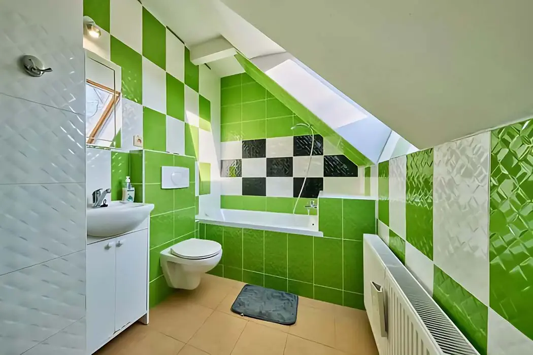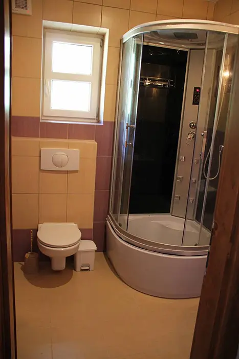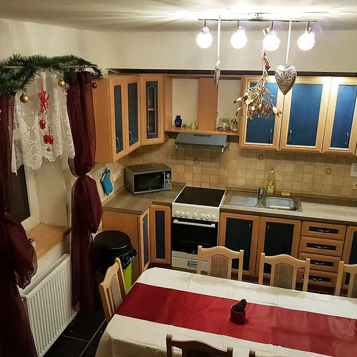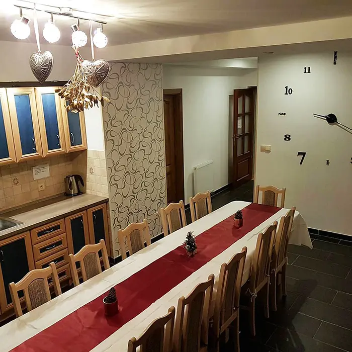 V přízemí - obývací pokoj spojený s kuchyňským koutem - stoly a židle, el.sporák, sklokeramická varná deska, lednice, mrazák, varná konvice, mikrovlnná trouba, toastovač, myčka. K dispozici dětská postýlka. 6 ložnic: přízemí - 2 pokoje 1x2,1x3, koupelna - masážní sprchový kout, WC. 2 průchozí pokoje 1x2,1x3, koupelna masážní sprchový kout, WC. Patro: 1x4, 1x3 lůžka. Koupelna s vanou, WC. Topení - centrální - tepelné čerpadlo.