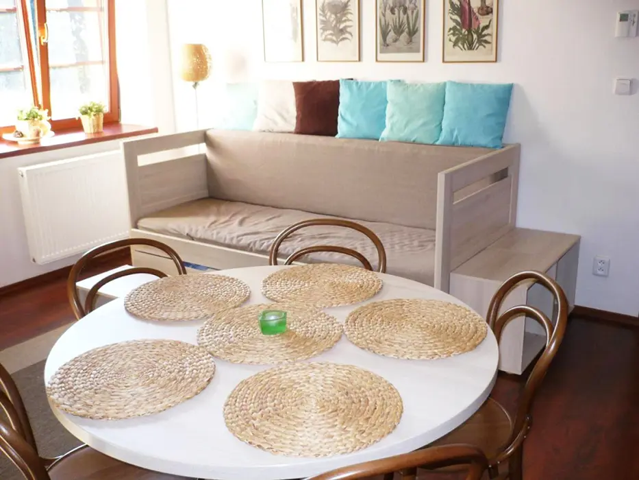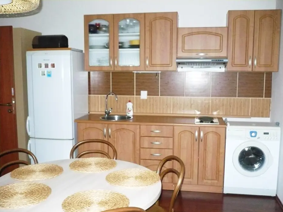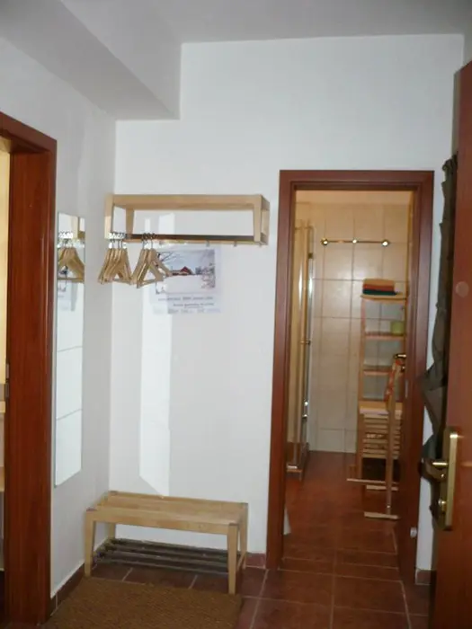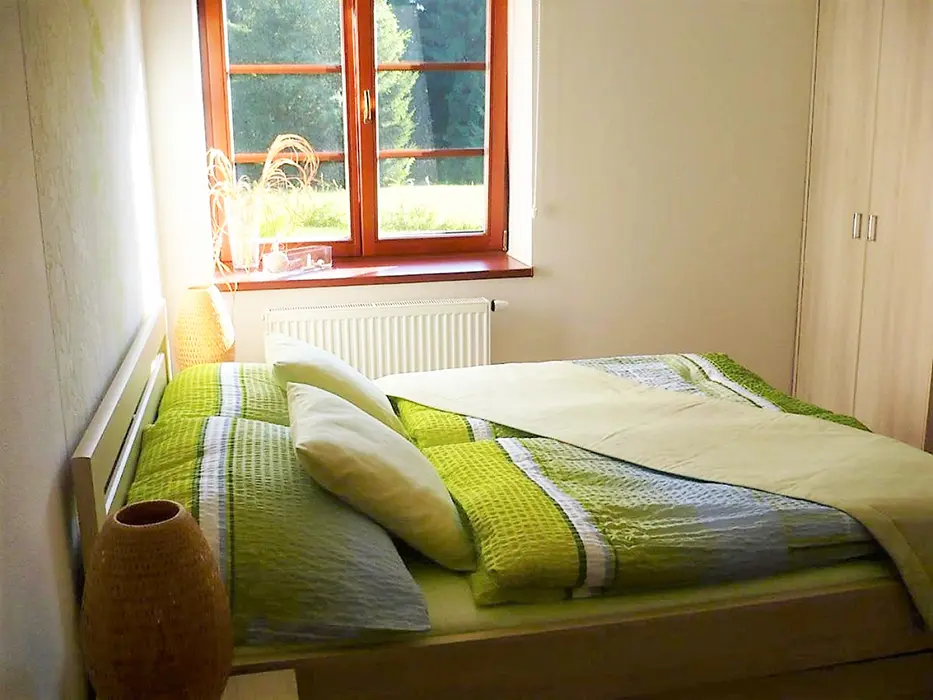 Apartmán je v přízemí: vstupní chodbička, obývací část s možností 1 přistýlky spojená s kuchyňským koutem - remoska, el. pánev, lednice, mikrovlnka, varná konvice, 2 plotýnková varná deska, topinkovač, nádobí, TV, DVD a CD přehrávač a rádio. 1 ložnice 1x4 lůžka. Soc. zařízení - koupelna se sprchou, fén, pračka, WC. Topení - centrální