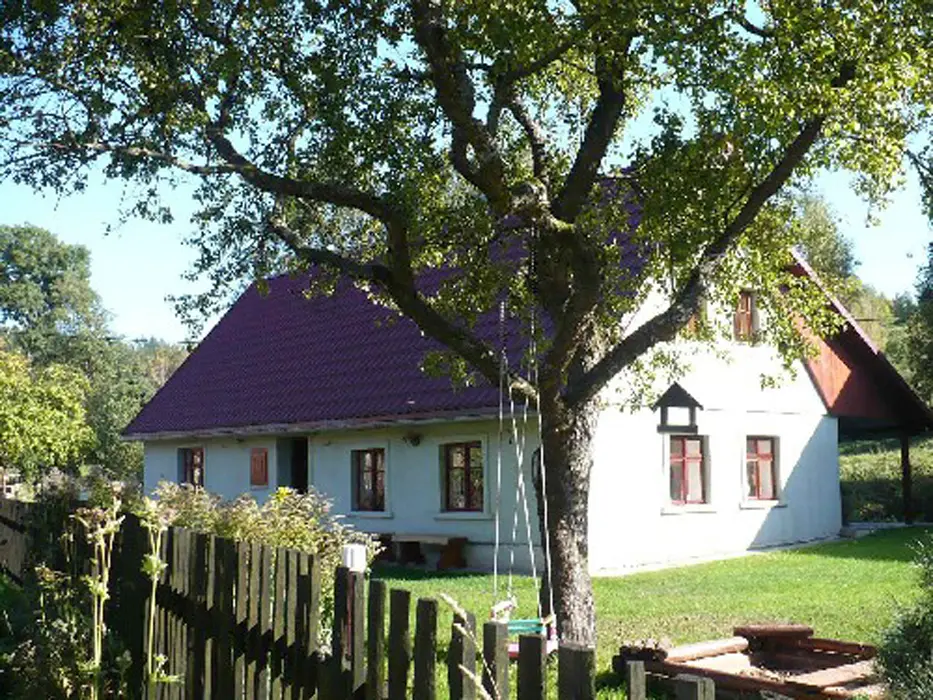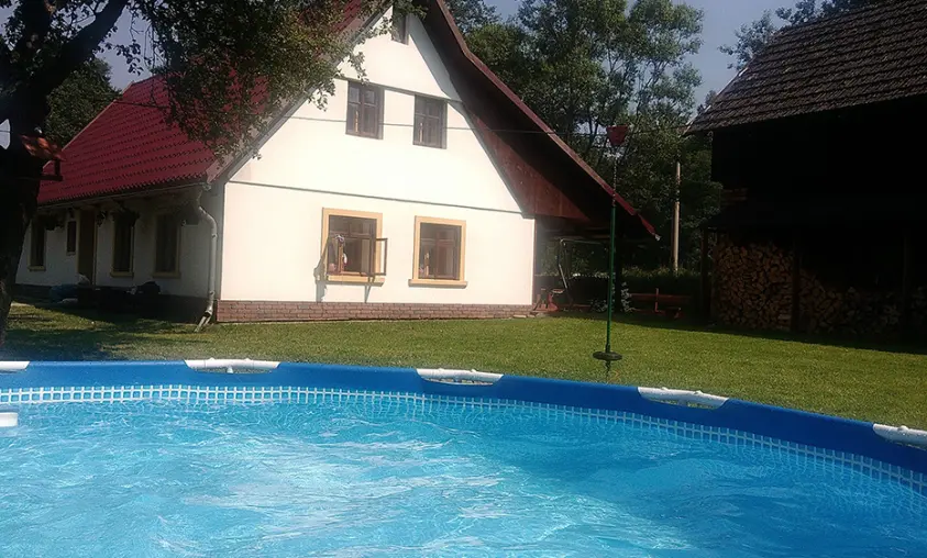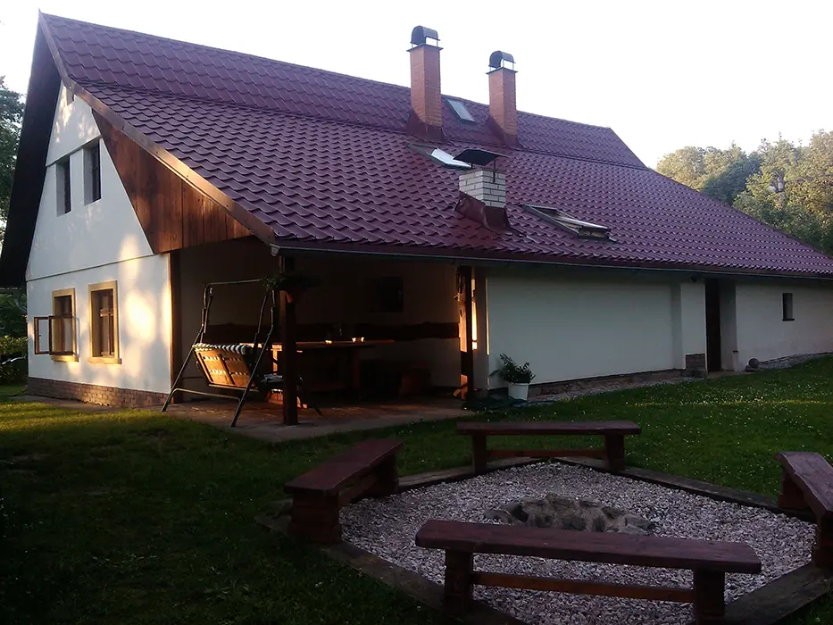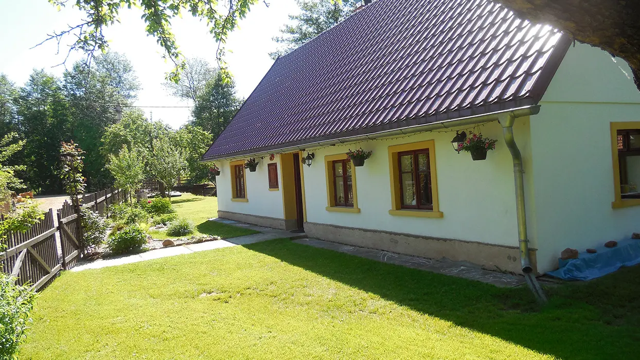 Zahradní kryté posezení, dětské pískoviště, houpačka, přenosný gril, nadzemní kruhový bazén 4,5 m, podél chalupy protéká potůček