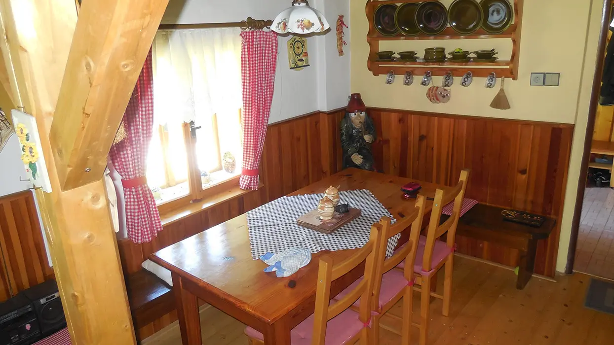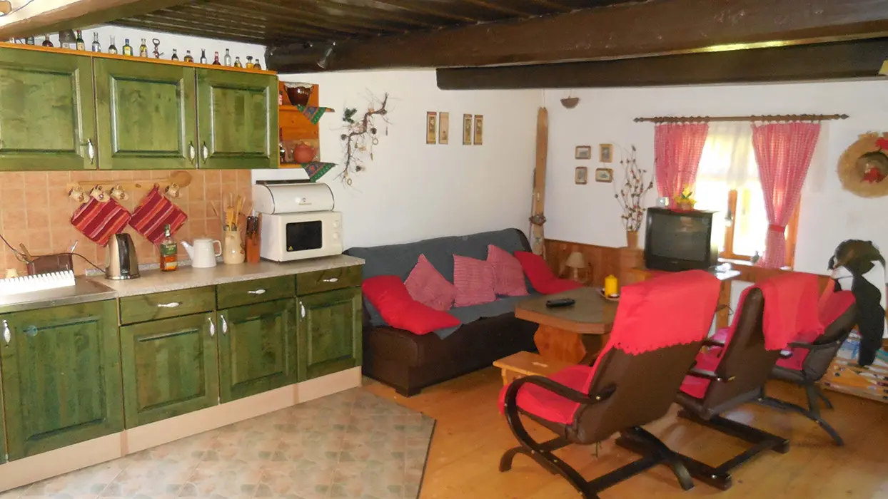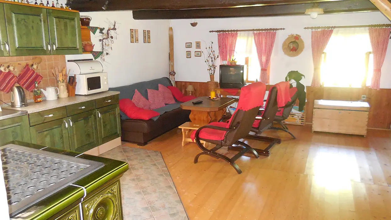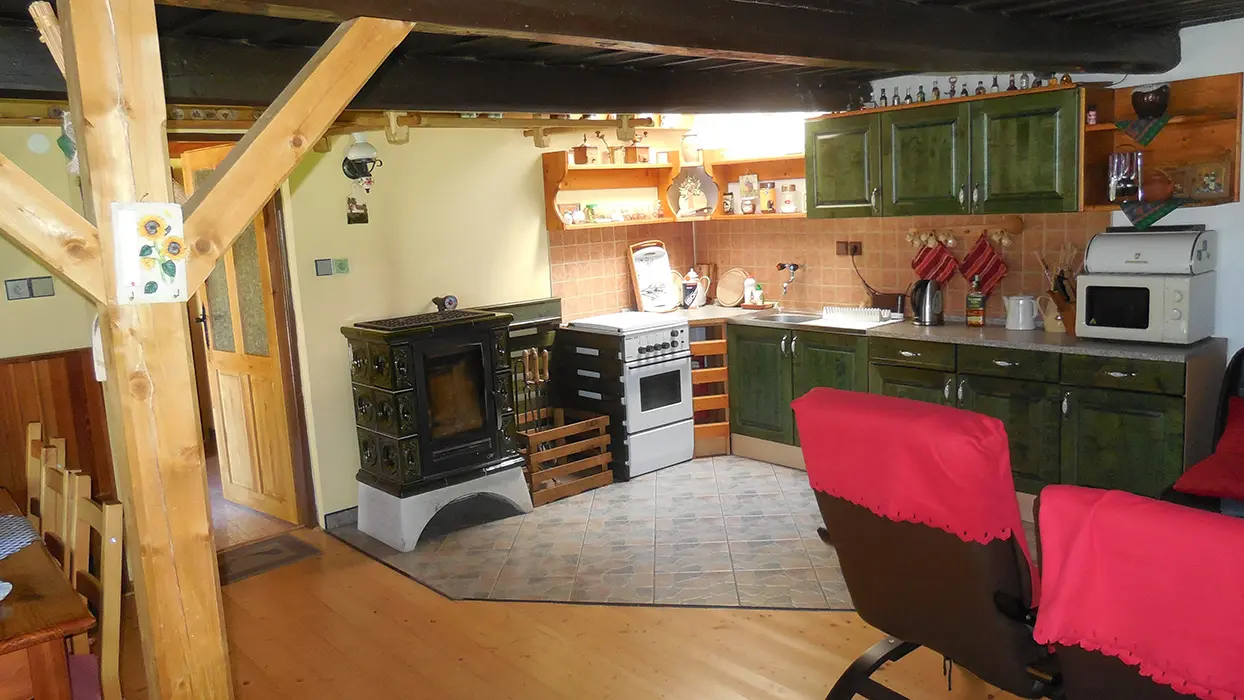 Velký obývací pokoj se sedací soupravou, BTV, rádio, jídelní stůl pro 8 osob, kuchyňský kout - plyn. sporák s el. troubou, varná konvice, lednice s malým mrazákem, mikrovlnka, krbová kamna, dětský koutek s hračkami. 2 ložnice 1x4, 1x3 + 1 přistýlka. Koupelna s vanou, umyvadlem, WC, autom. pračka. Topení - centrální krbovými kamny nebo v každé místnosti kamna na tuhá paliva