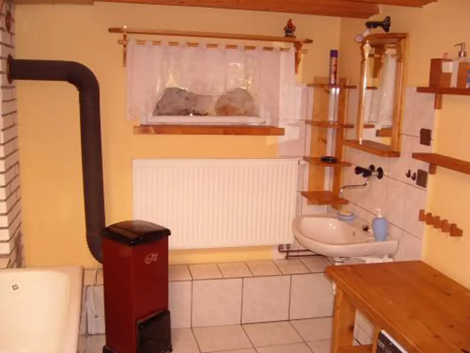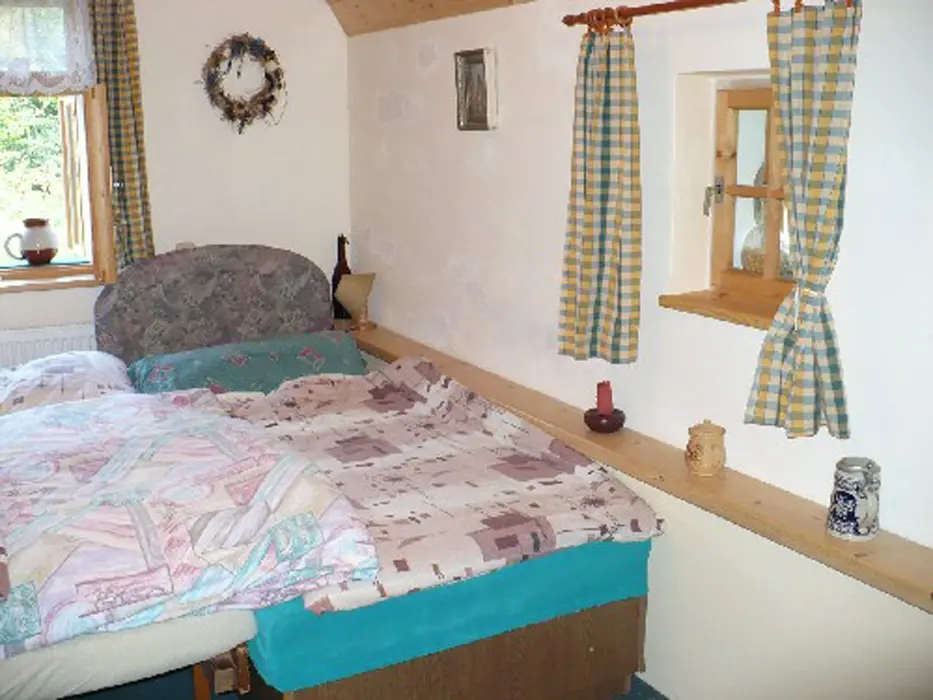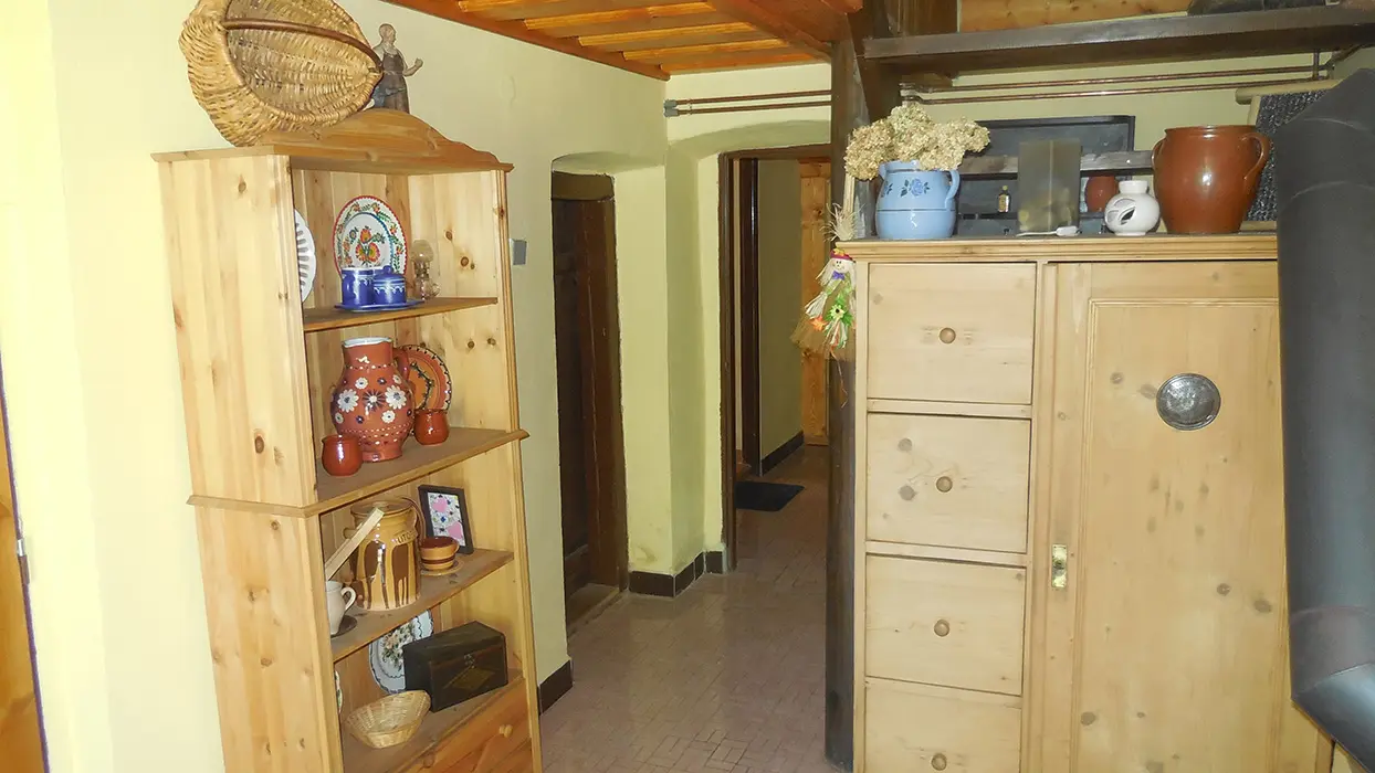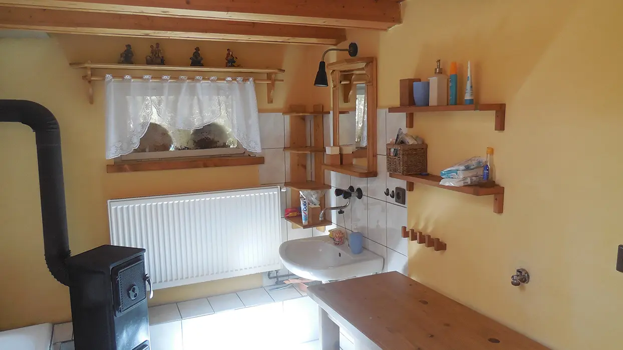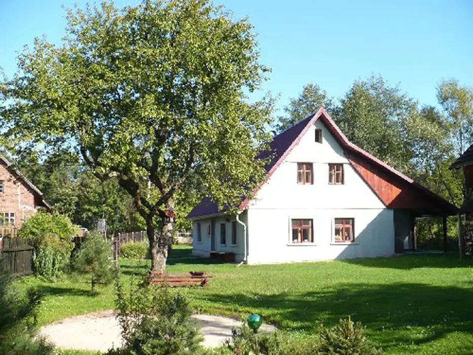 Velký obývací pokoj se sedací soupravou, BTV, rádio, jídelní stůl pro 8 osob, kuchyňský kout - plyn. sporák s el. troubou, varná konvice, lednice s malým mrazákem, mikrovlnka, krbová kamna, dětský koutek s hračkami. 2 ložnice 1x4, 1x3 + 1 přistýlka. Koupelna s vanou, umyvadlem, WC, autom. pračka. Topení - centrální krbovými kamny nebo v každé místnosti kamna na tuhá paliva