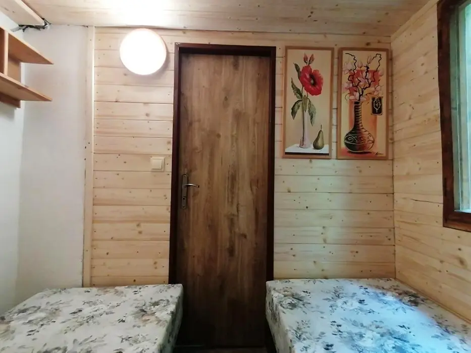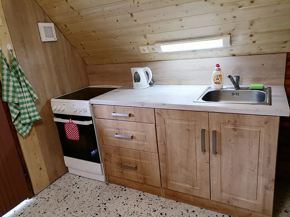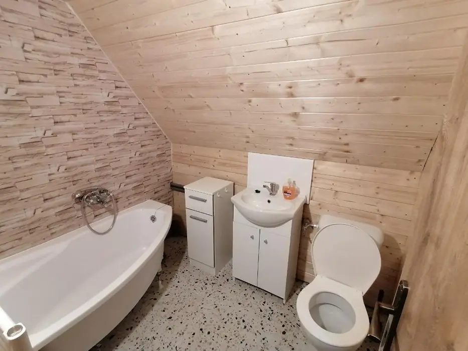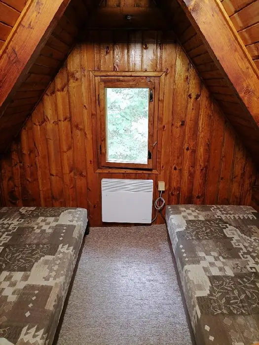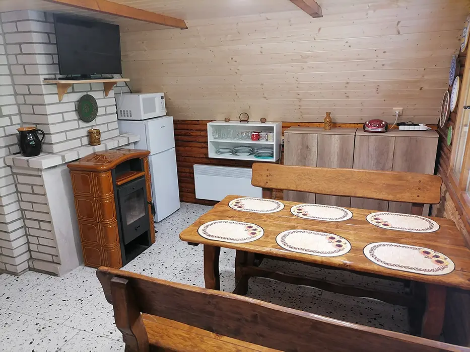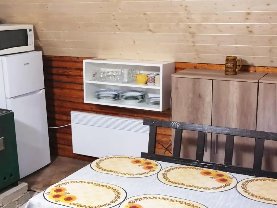 Obývací pokoj s posezením, TV, krbová kamna - spojený s kuchyní - el. sporák, mikrovlnka, varná konvice, lednice s mrazákem, nádobí, jídelní stůl a židle. 3 ložnice - 3x2 lůžka ( 1 ložnice v přízemí, 2 v patře ). Soc. zařízení - vana, umyvadlo, WC v koupelně. Topení - el. přímotopy, krbová kamna