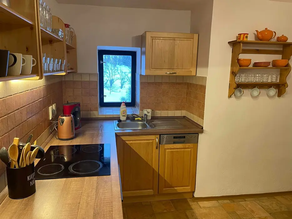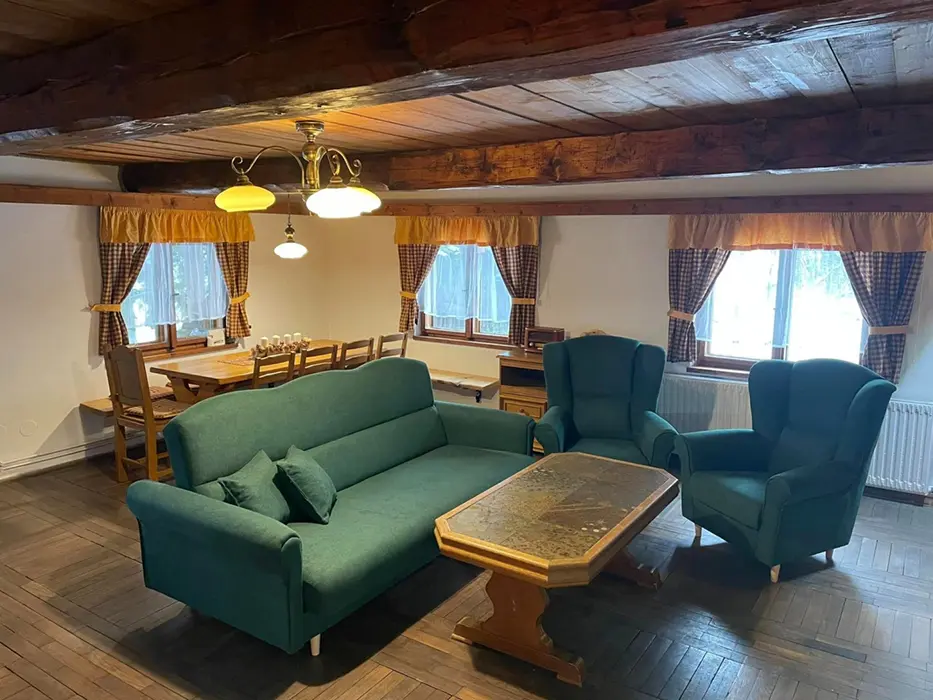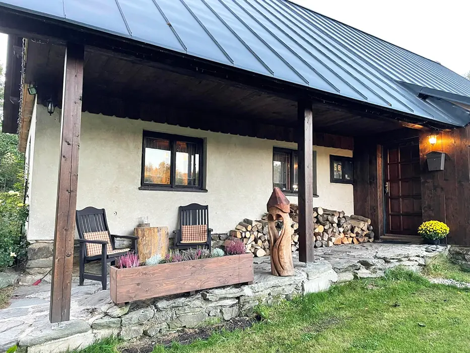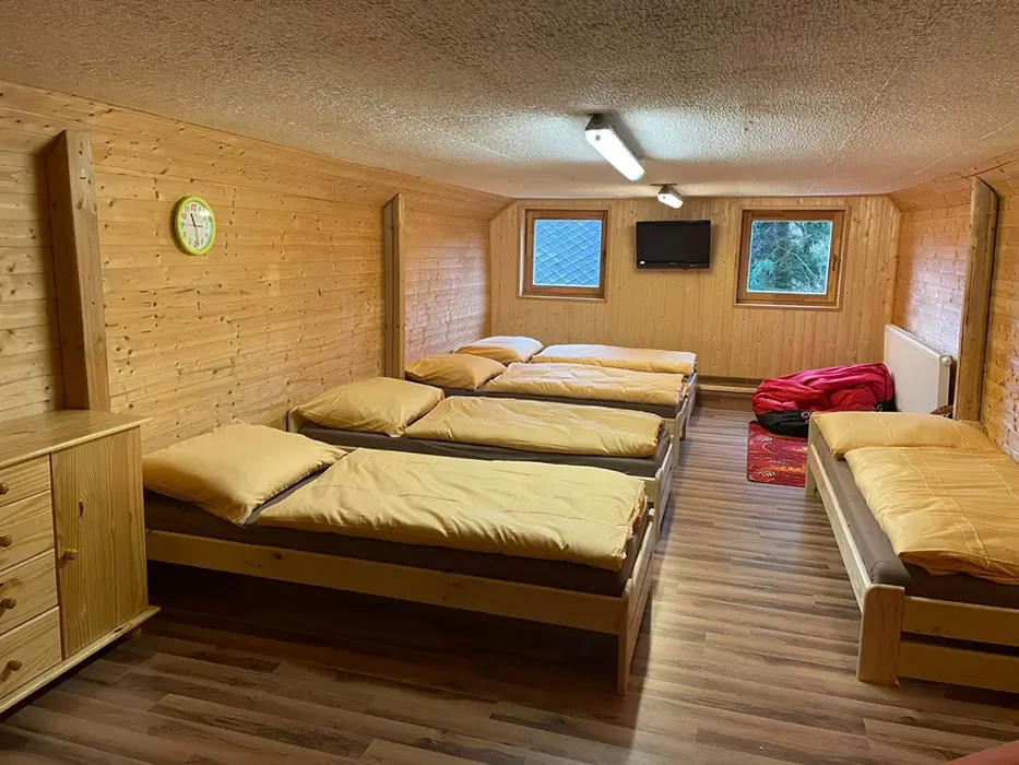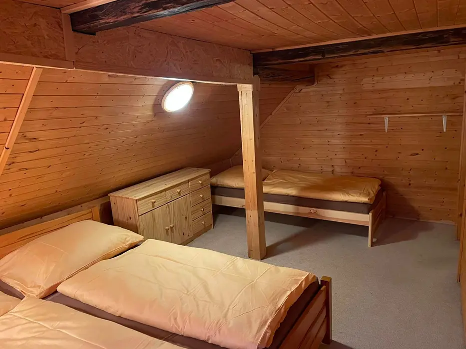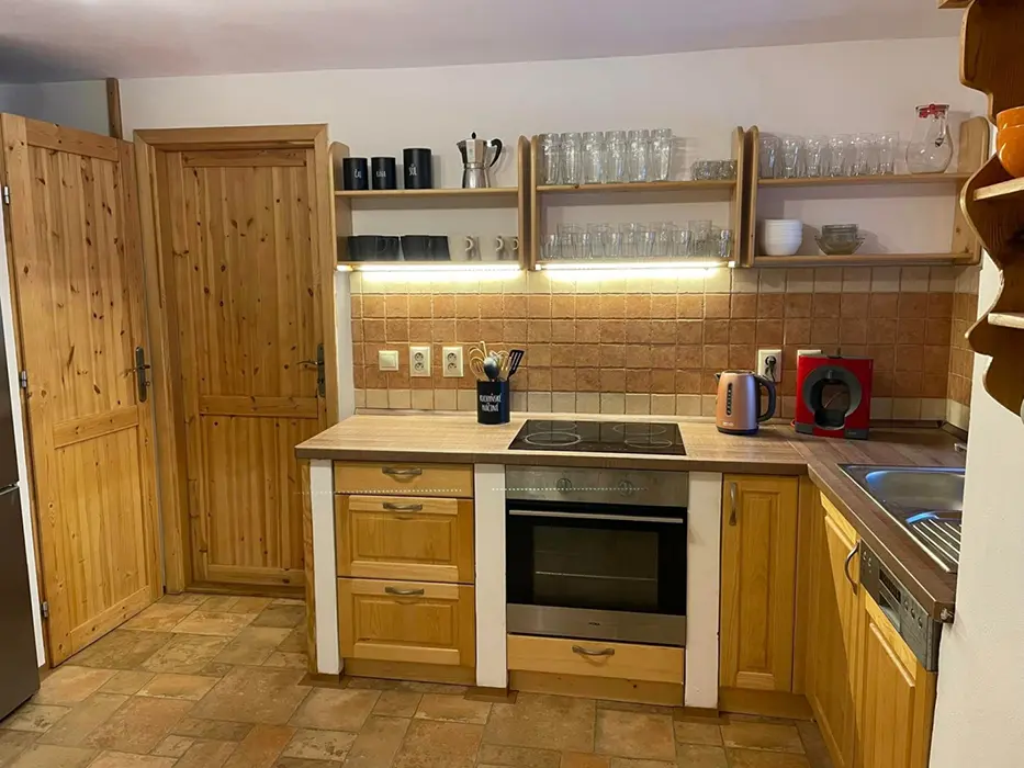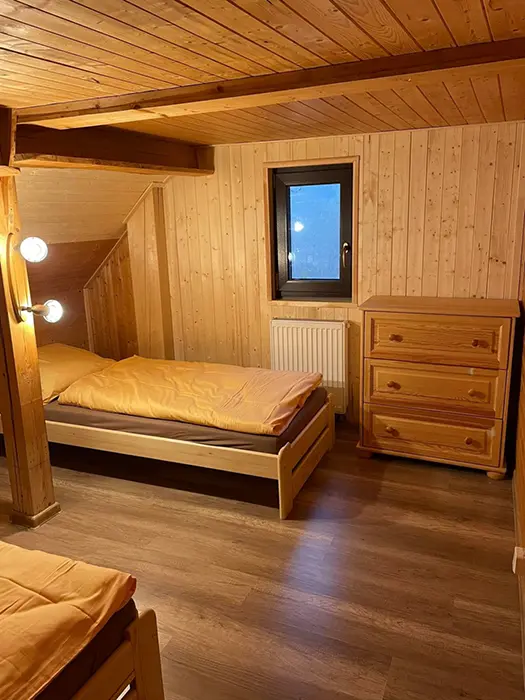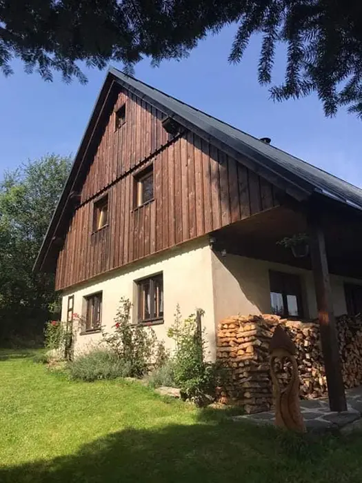 Velká světnice - posezení, možnost 2 přistýlek, jídelní stůl, kachlová krbová kamna, TV, rádio - spojený s kuchyní - sporák, lednice, varná konvice, mikrovlnka, myčka. 3 ložnice - 1x2, 1x3 1x5 lůžek. Soc. zařízení - koupelna se sprchovým koutem a vanou, 2x WC. Topení - kachlová kamna