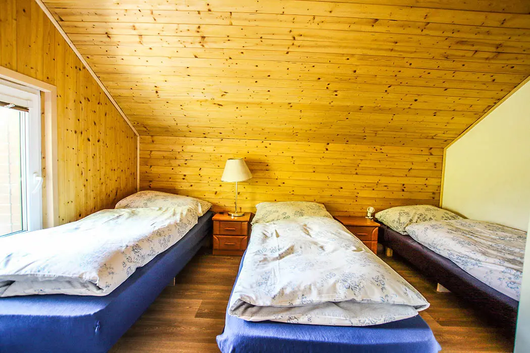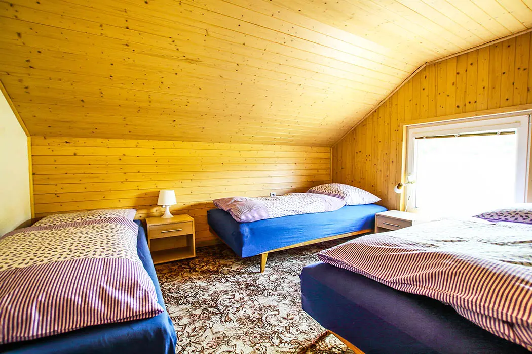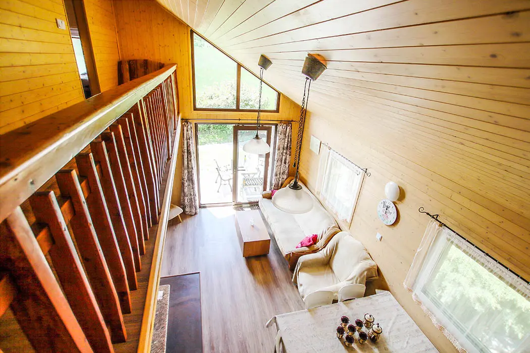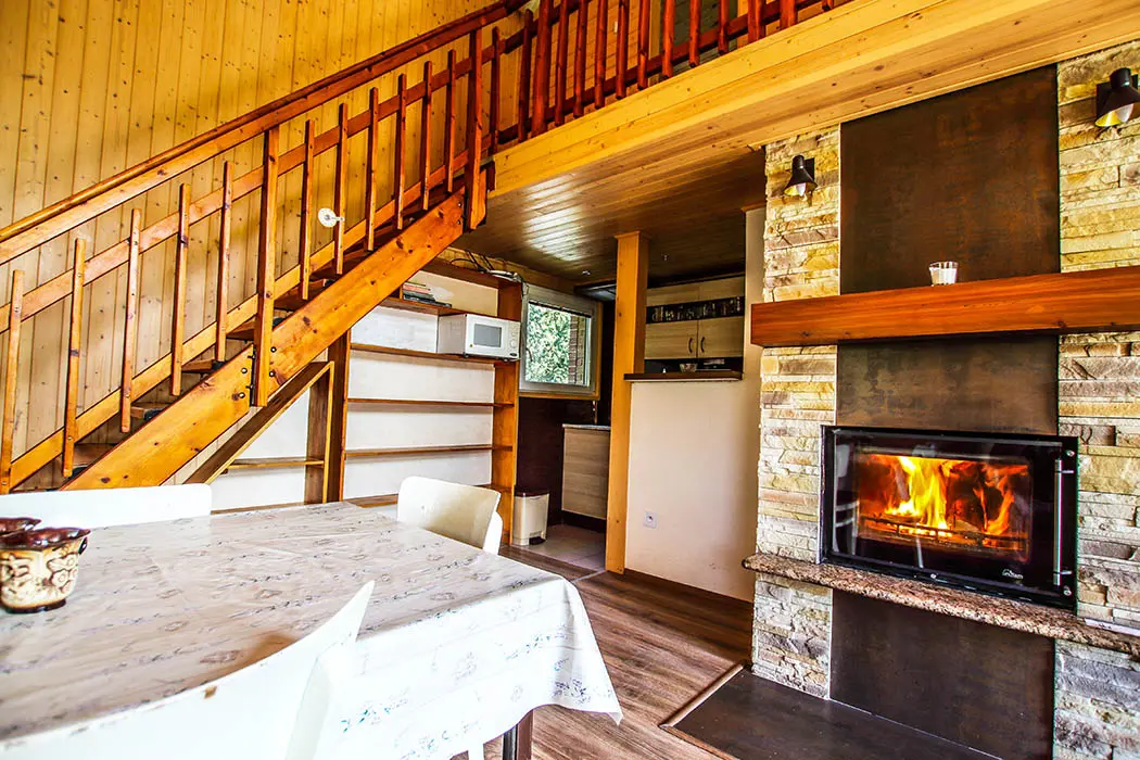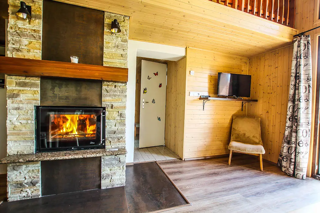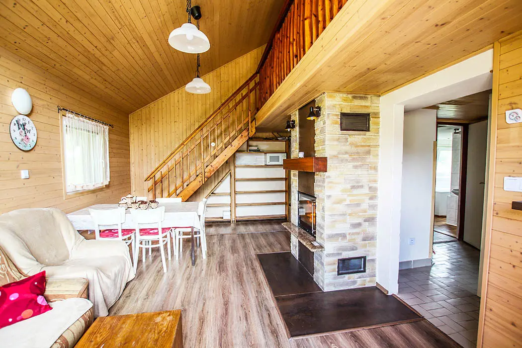 Přízemí - obytná část s posezením - stůl a židle, krbová kamna, TV, spojená s kuchyní - sklokeramická varná deska, trouba, mikrovlnka, varná konvice, lednice, nádobí. 3 ložnice - v přízemí 1x3, v patře 2x3 lůžka. Soc. zařízení - sprchový kout, umyvadlo, pračka, WC. V místnosti s vířivkou je další sprcha. Topení - krbová kamna s horkovzdušným vytápěním s rozvody do ostatních pokojů