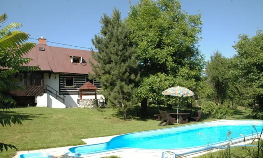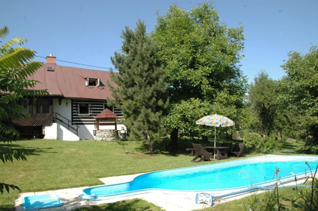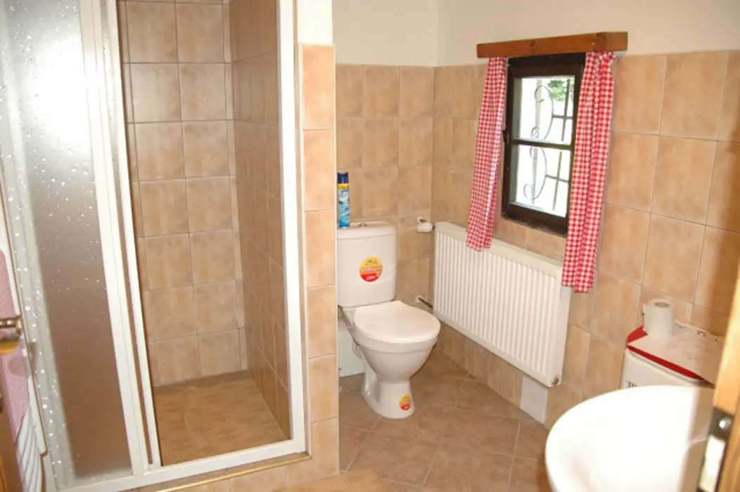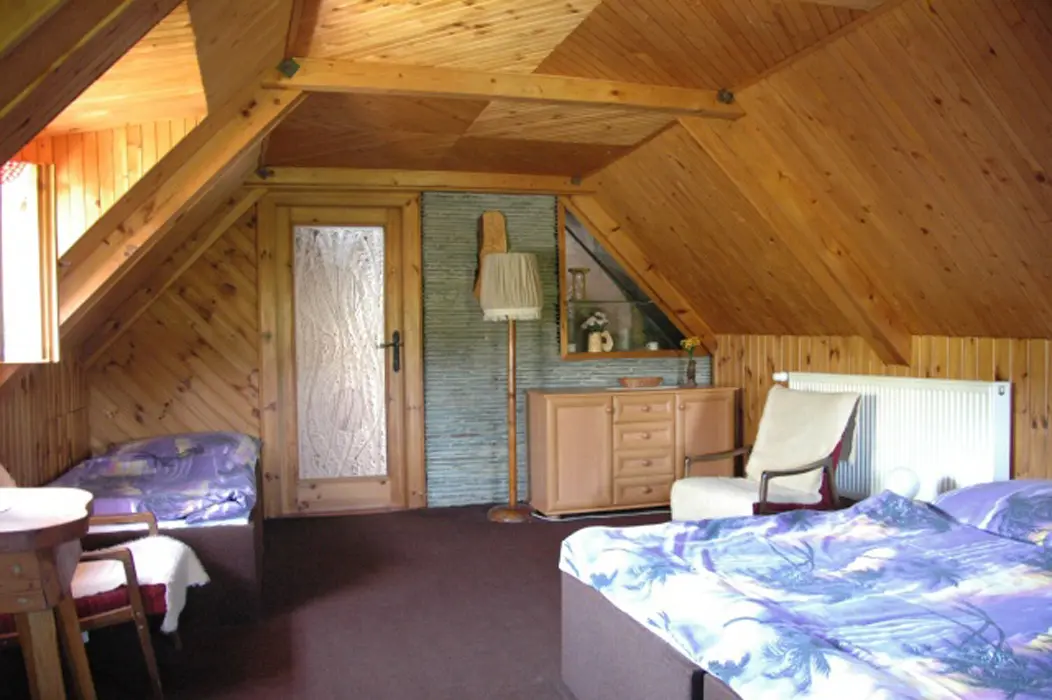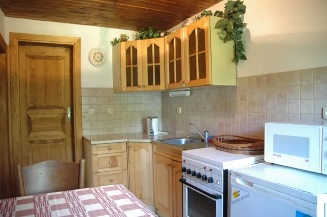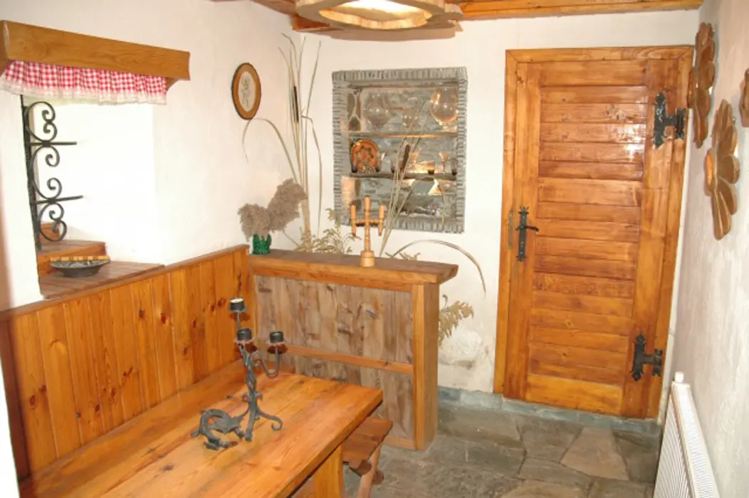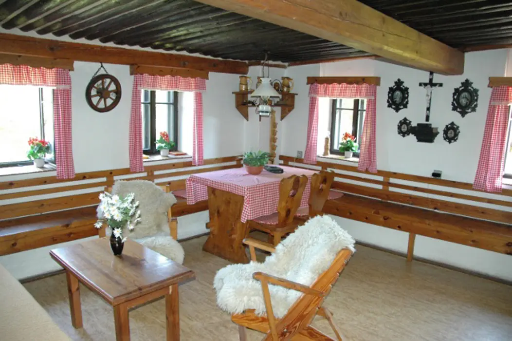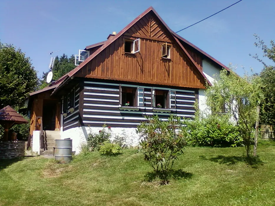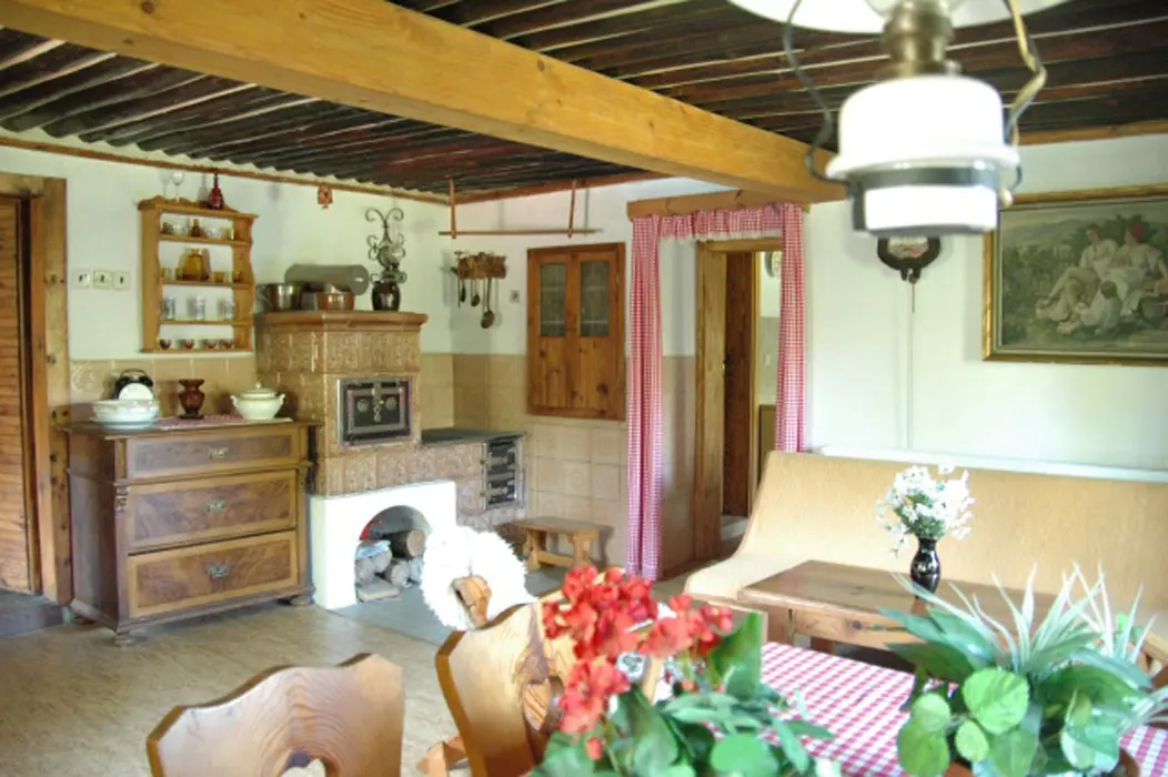 V přízemí - v chodbě krb, obývací pokoj s posezením, TV+SAT, rádio. Kuchyně - kachlová kamna, sporák s troubou, mikrovlnka, lednice, varná konvice, nádobí, jídelní kout. V patře 2 ložnice 1x2, 1x4 lůžka. Koupelna - sprchový kout + WC + pračka, další samostatné WC. Topení - tepelné čerpadlo + kachlová kamna