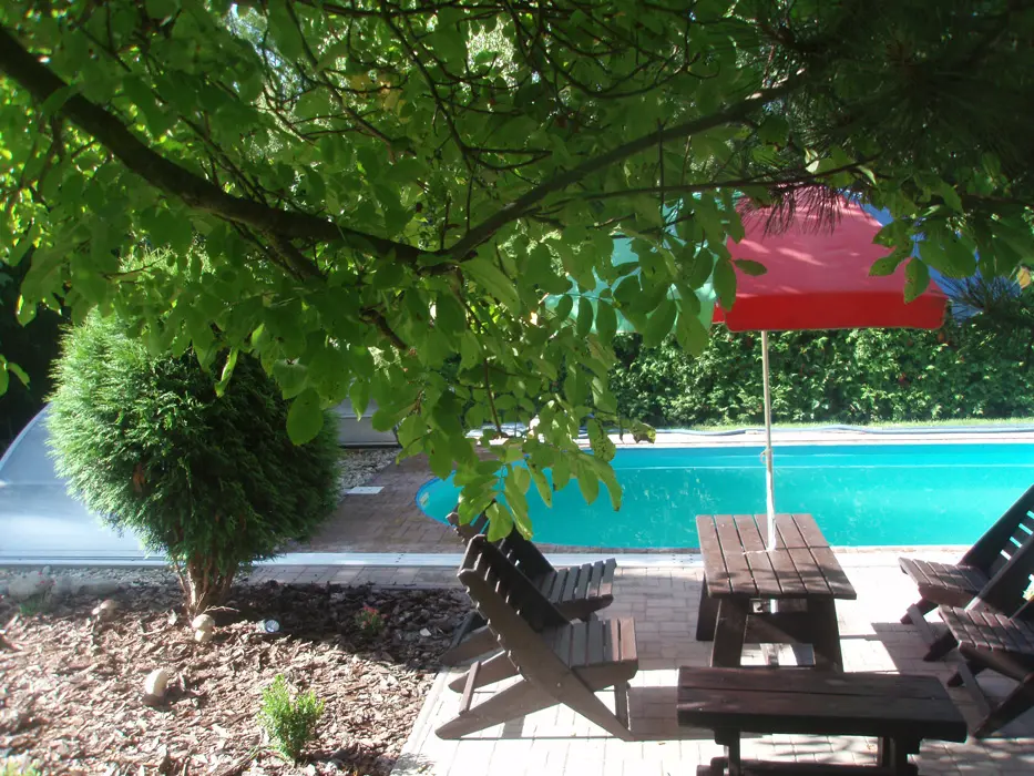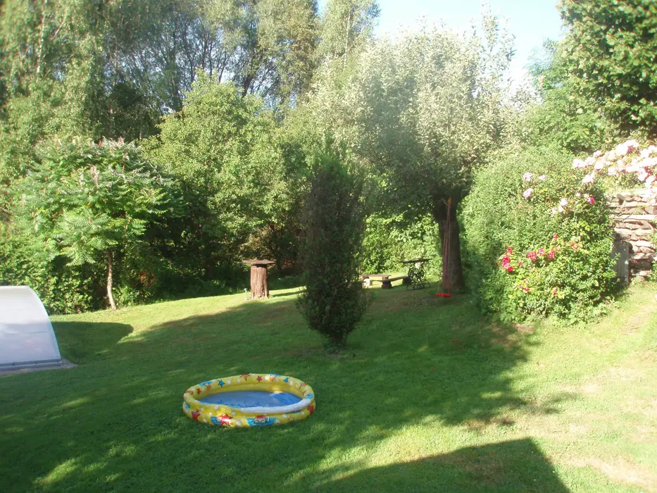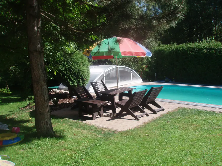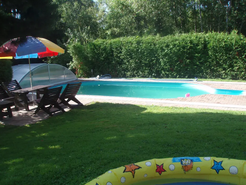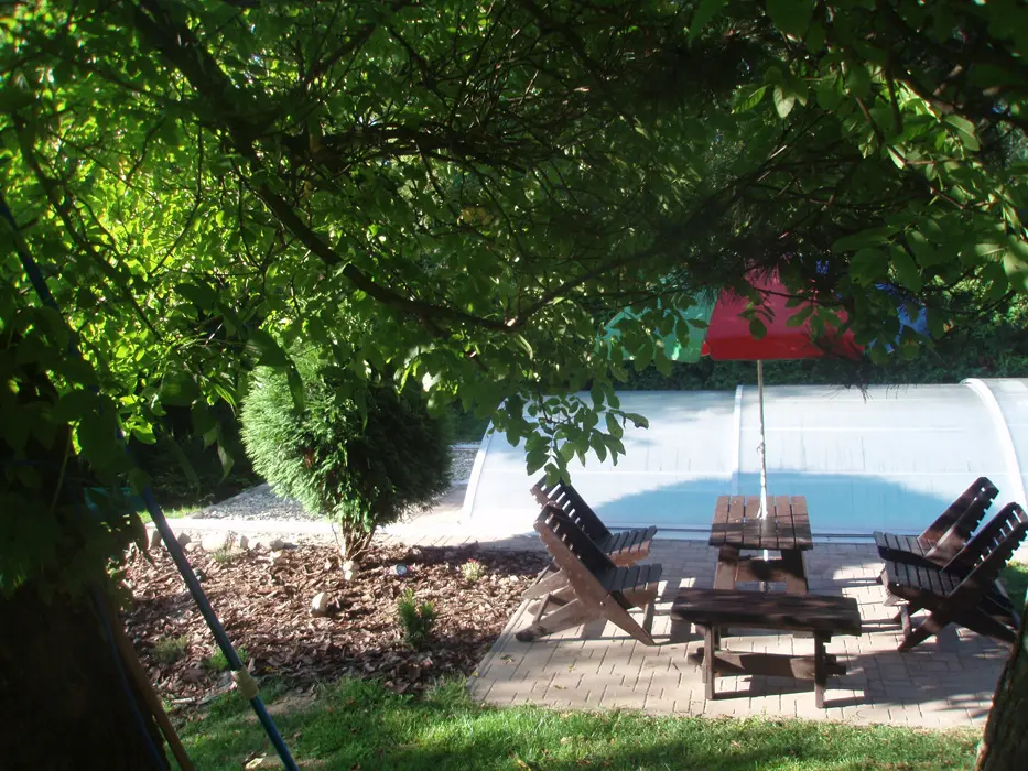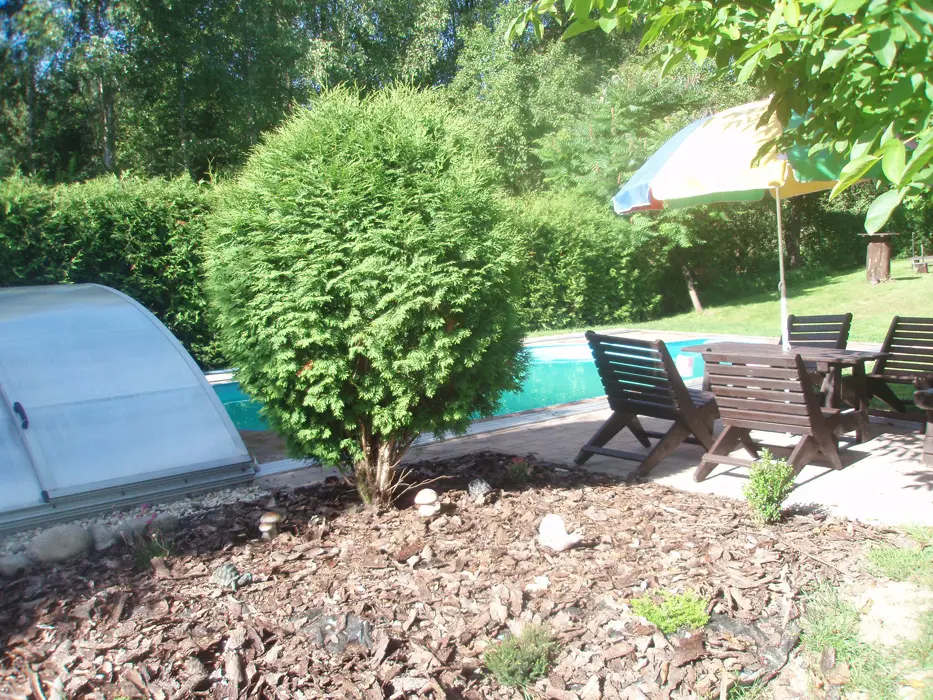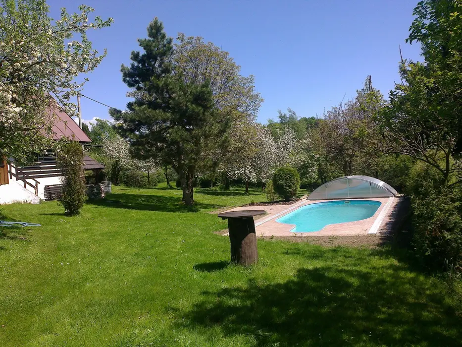 Pozemek je oplocen částečně živým plotem, zahradní nábytek se slunečníkem, zapuštěný bazén, ohniště a gril