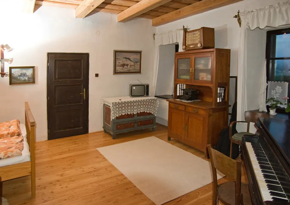 Apartmán pro 4 osoby – prostorný obývací pokoj s klavírem, posezením u BTV, 4 lůžka, plně vybavená kuchyně. Sprchový kout + WC. Topení plynové