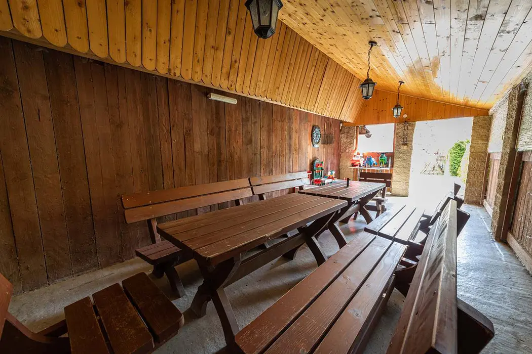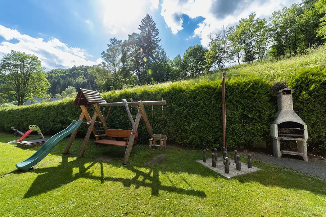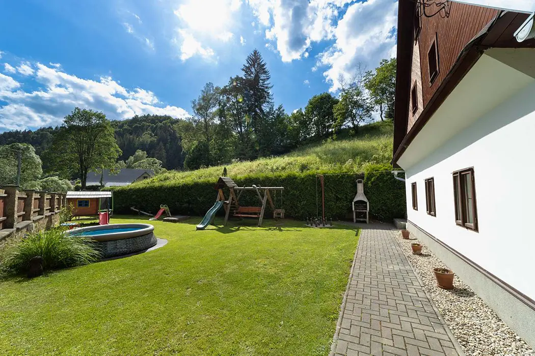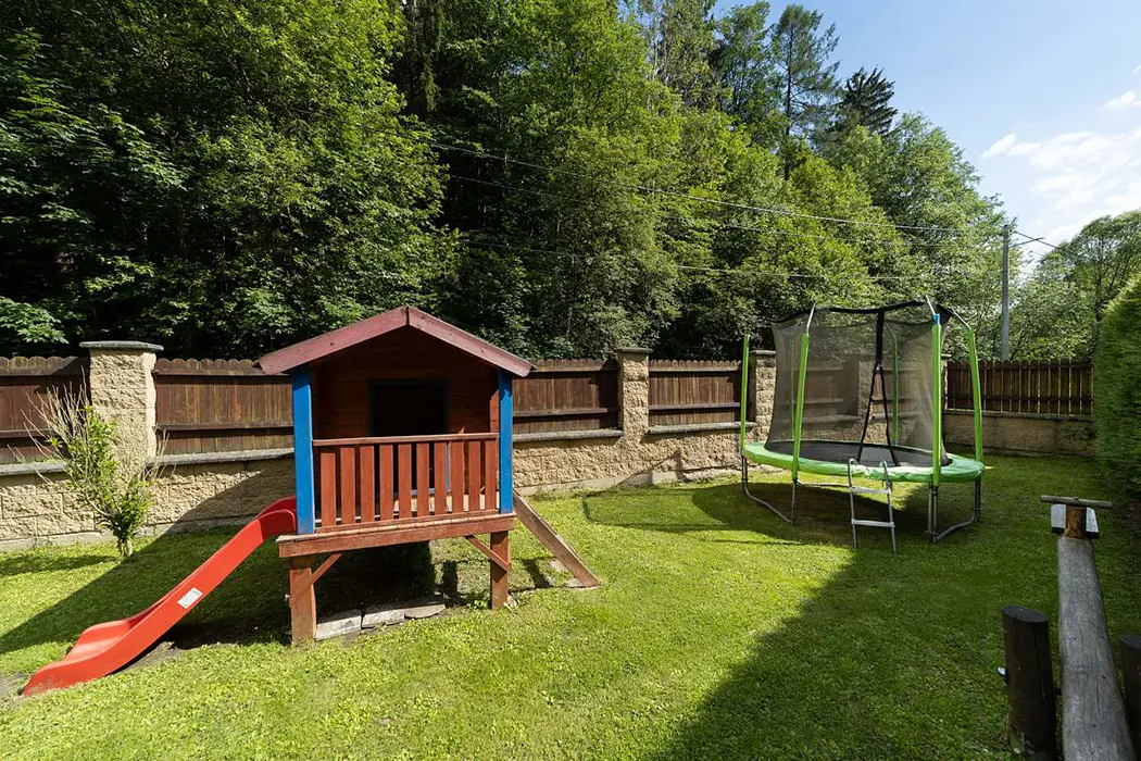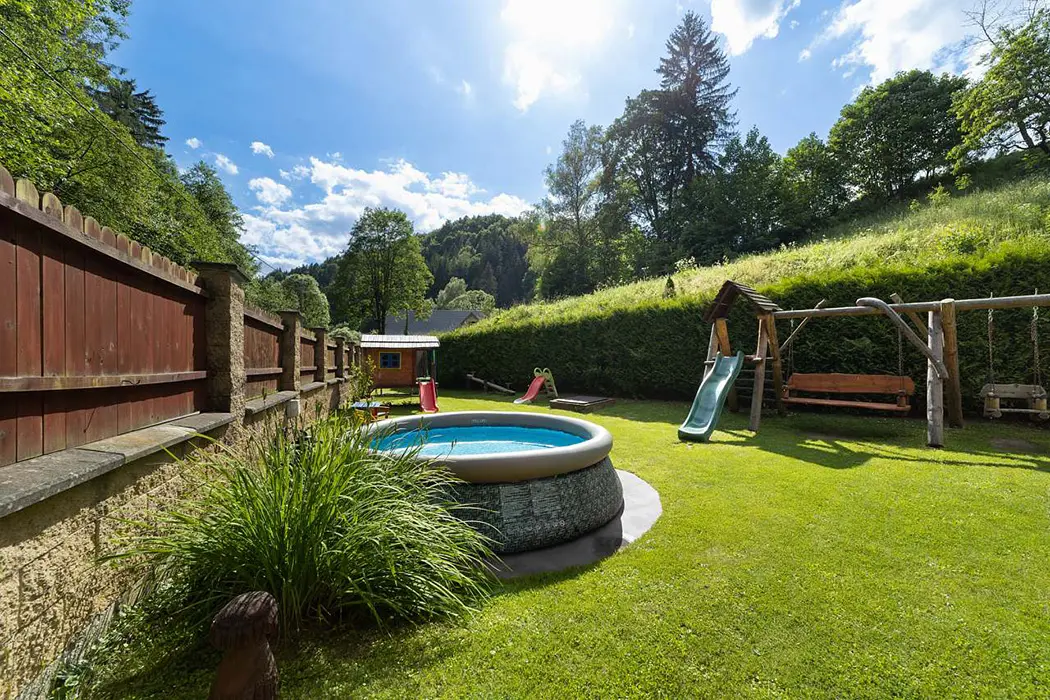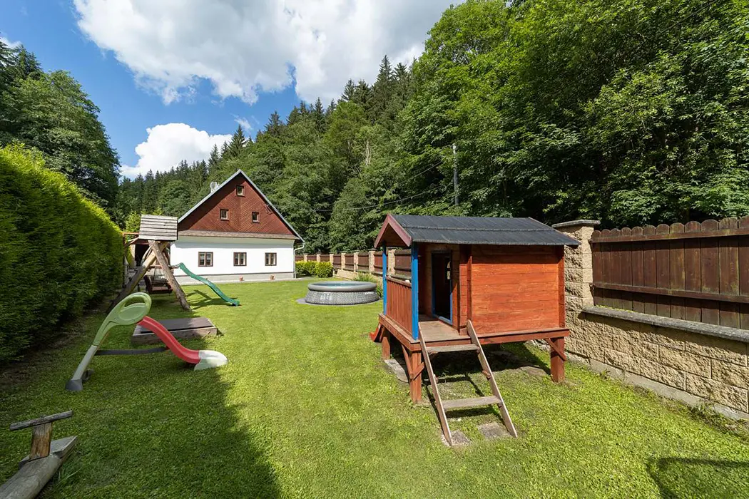 Zahrada je oddělena zděným plotem. Nadzemní kruhový bazén, průměr 4,6 m, houpačka, trampolína, ruské kuželky, el.šipky a prolézačky pro děti. 2x posezení jedno je na zastřešené terase s udírnou a grilem pro 12 osob a je ho možno využívat celoročně. Vedle chalupy teče horský potok Staříč, za chalupou je les