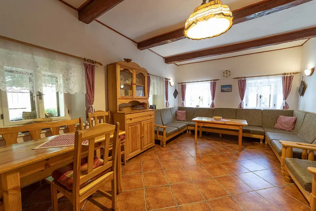 Obývací pokoj vybaven sedací soupravou, TV, kabelová televize UPC, DVD a posezení u krbu. Samostatná kuchyně - lednice, mrazák, mikrovlnka, el. sporák, varná konvice, myčka nádobí, topinkovač, fritéza a základní nádobí. V patře 4 ložnice 2x2, 1x3, 1x4 lůžka, jedna je průchozí. 2x koupelna - první s vanou, 2x umyvadlo, WC, automatická pračka, druhá koupelna se sprchou, WC a sauna. Topení centrální elektrické + vytápění krbem