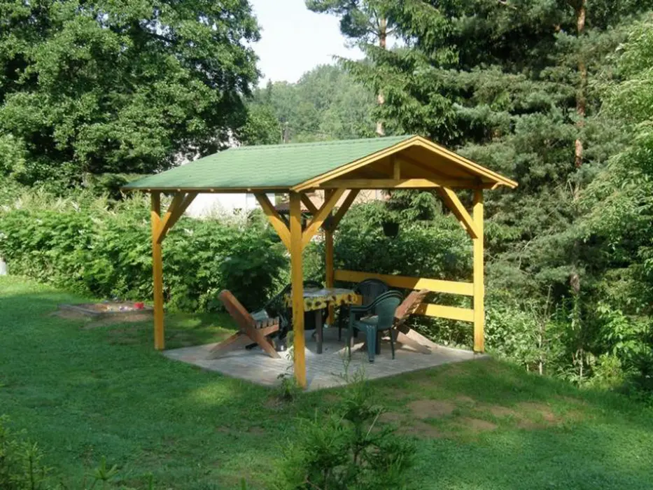 Venkovní ohniště s posezením, pískoviště pro děti, krytá pergola, zahradní nábytek