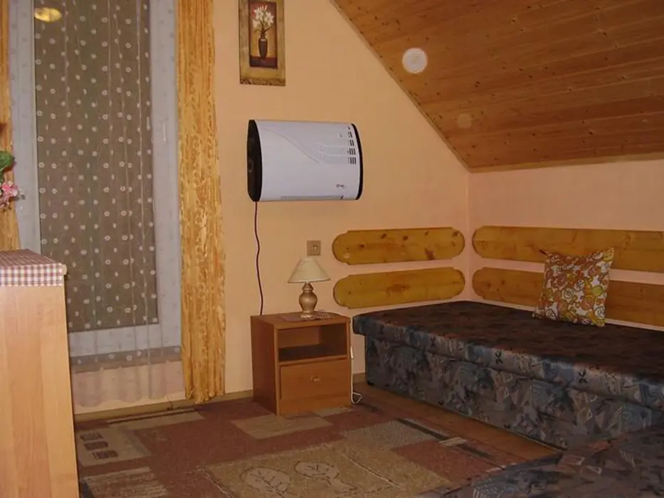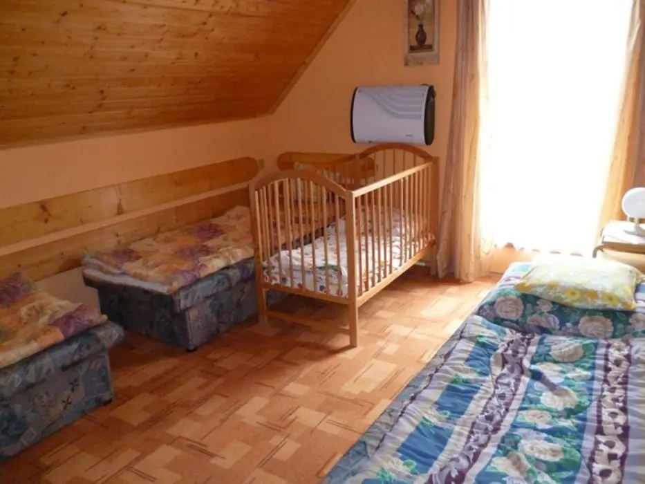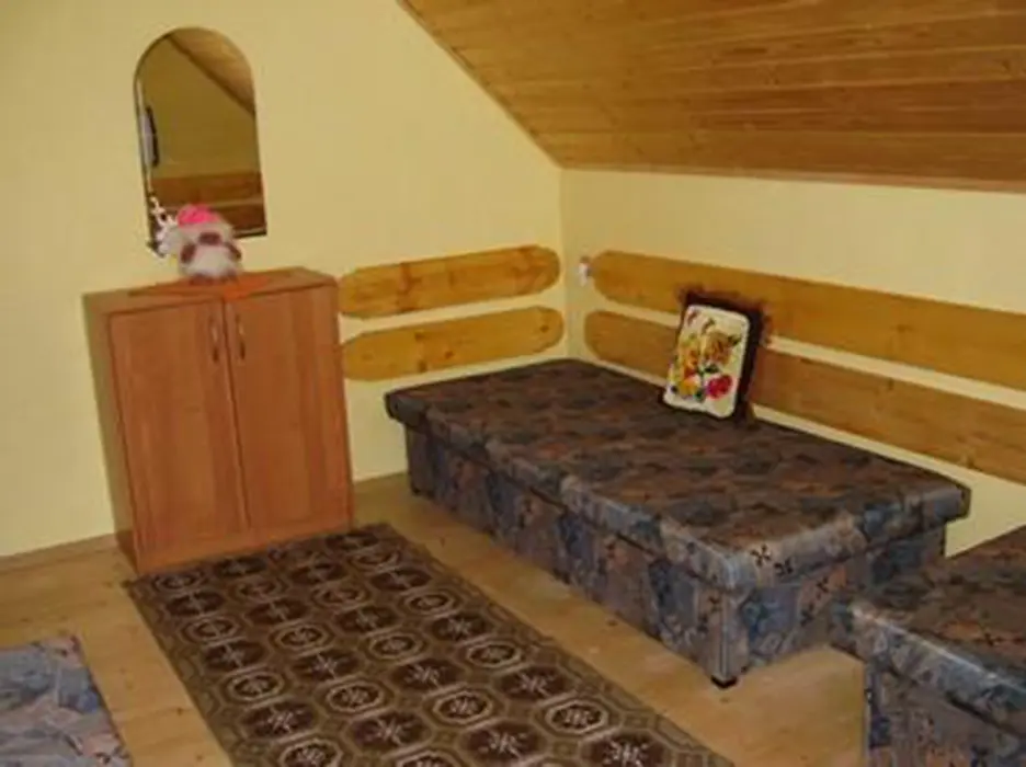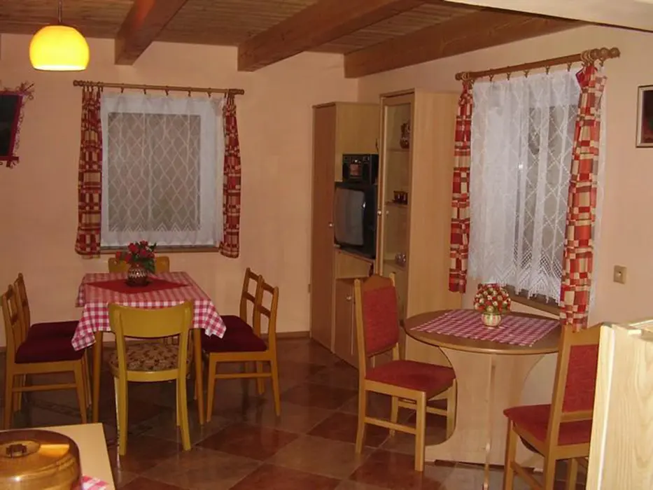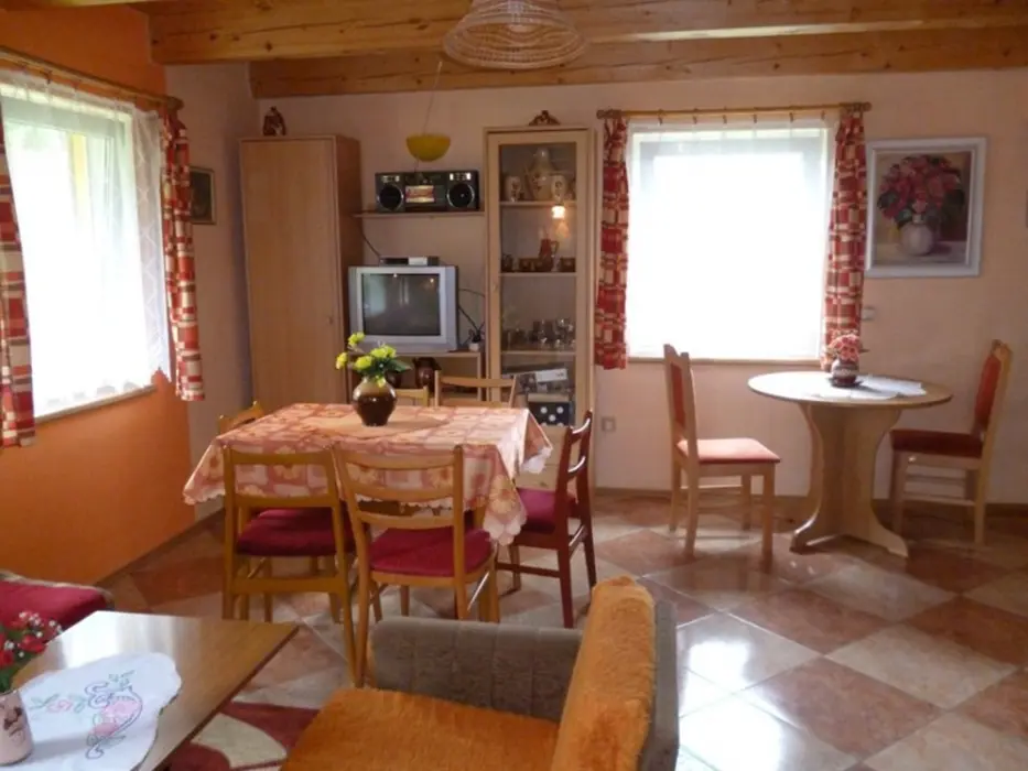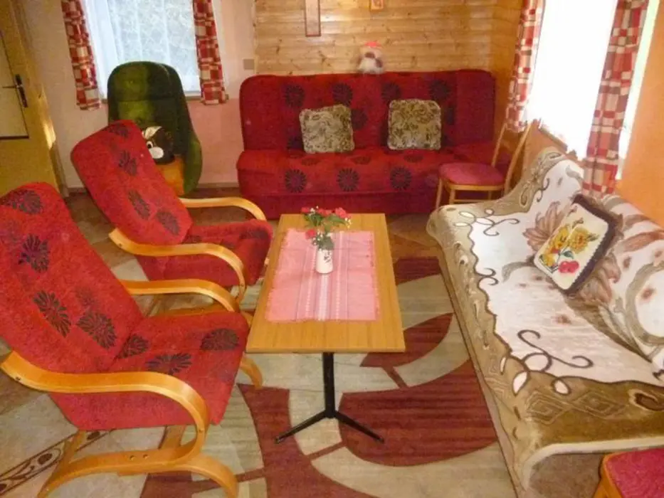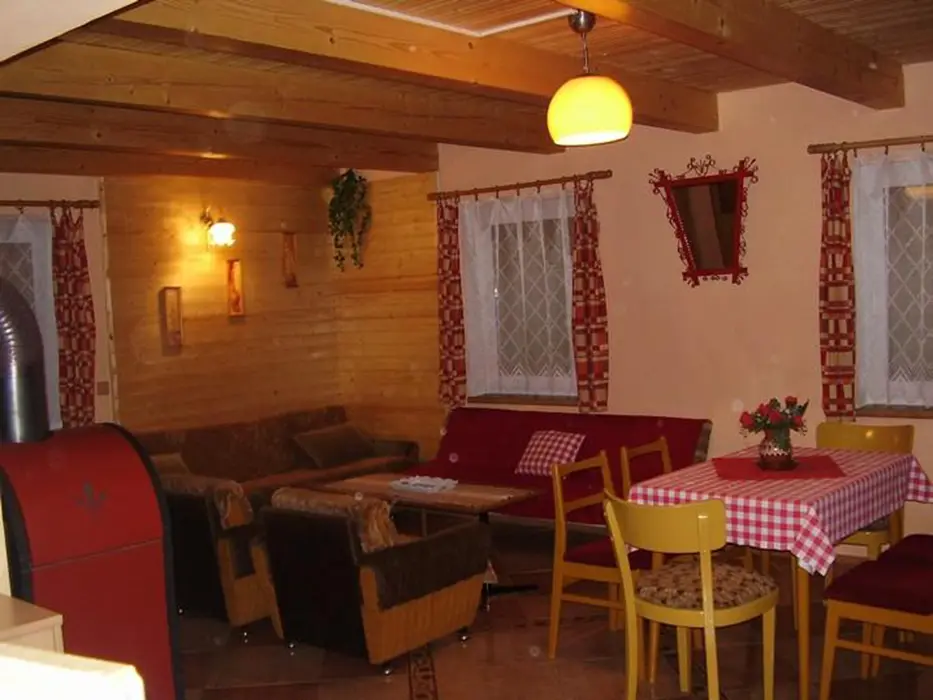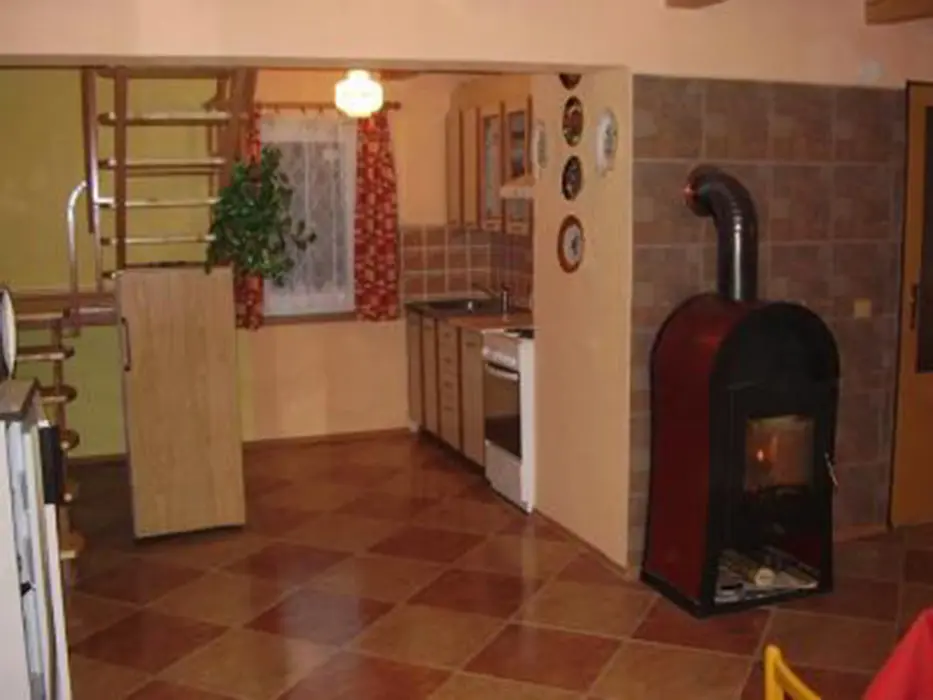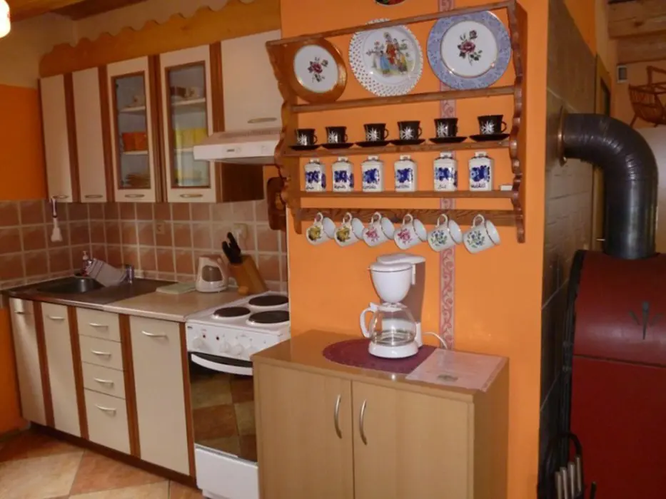 Obývací pokoj s posezením ( 2 sedací soupravy ) u krbových kamen, BTV. Samostatná kuchyně - el. sporák s troubou, lednice, varná konvice, mikrovlnka, základní nádobí. V patře 3 ložnice 1x2,2x3 lůžka. Koupelna se sprchou + WC. Topení el. přímotopy + tuhá paliva