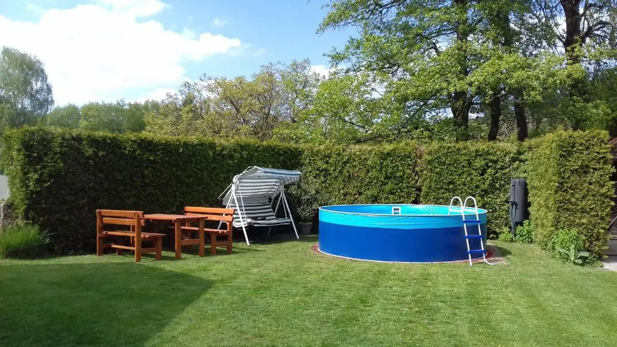 Přenosný gril, kruhový bazén o průměru 3,5 m, houpačka, úschovna kol