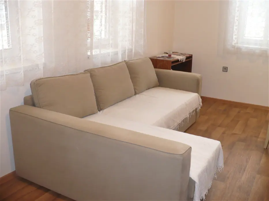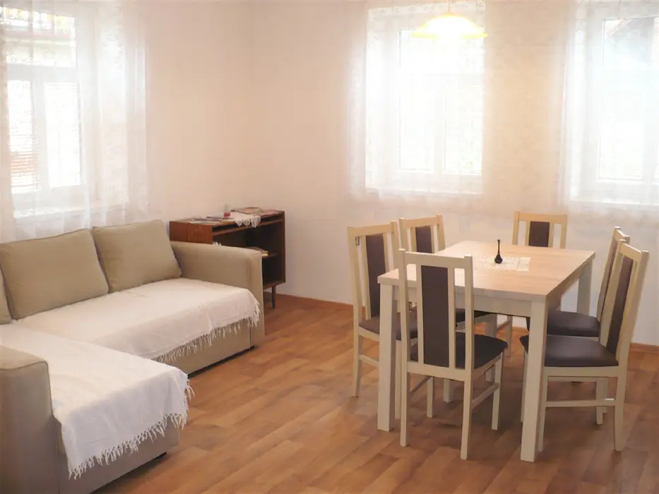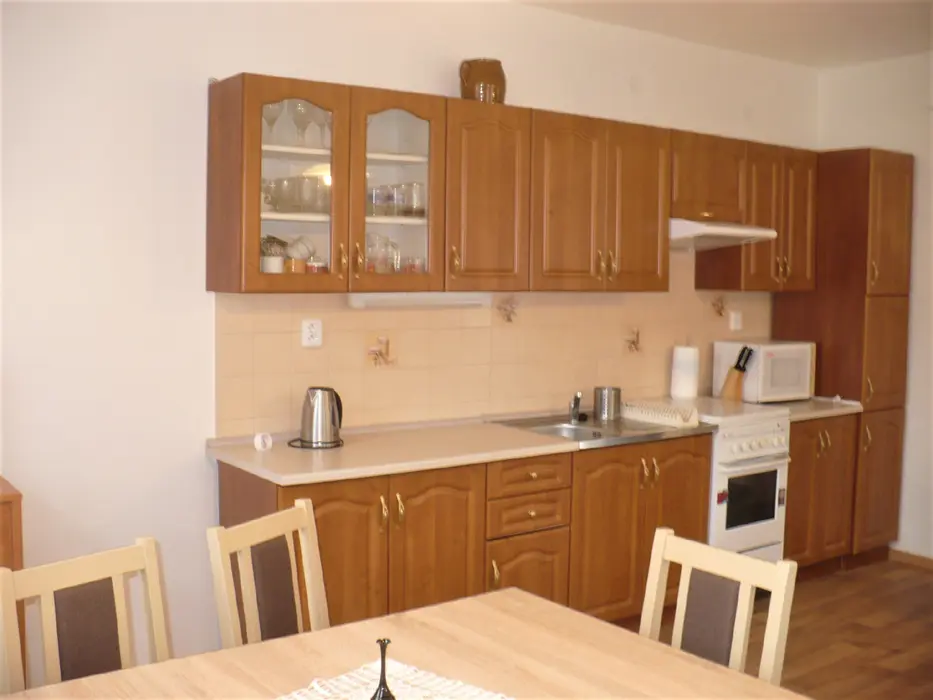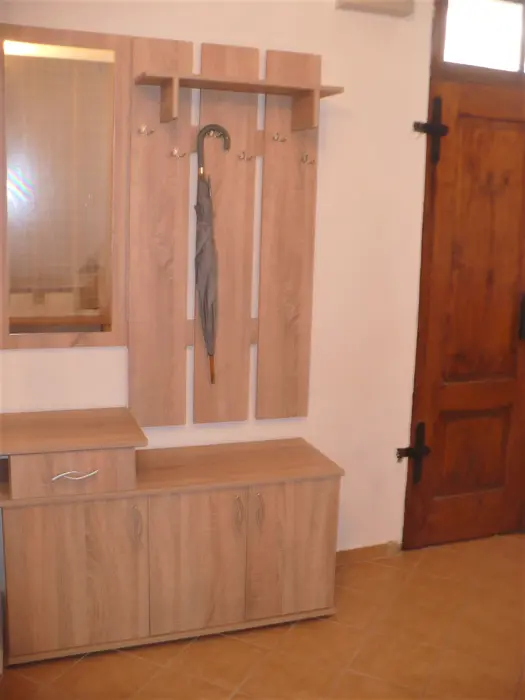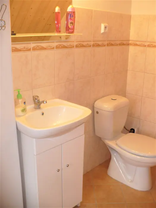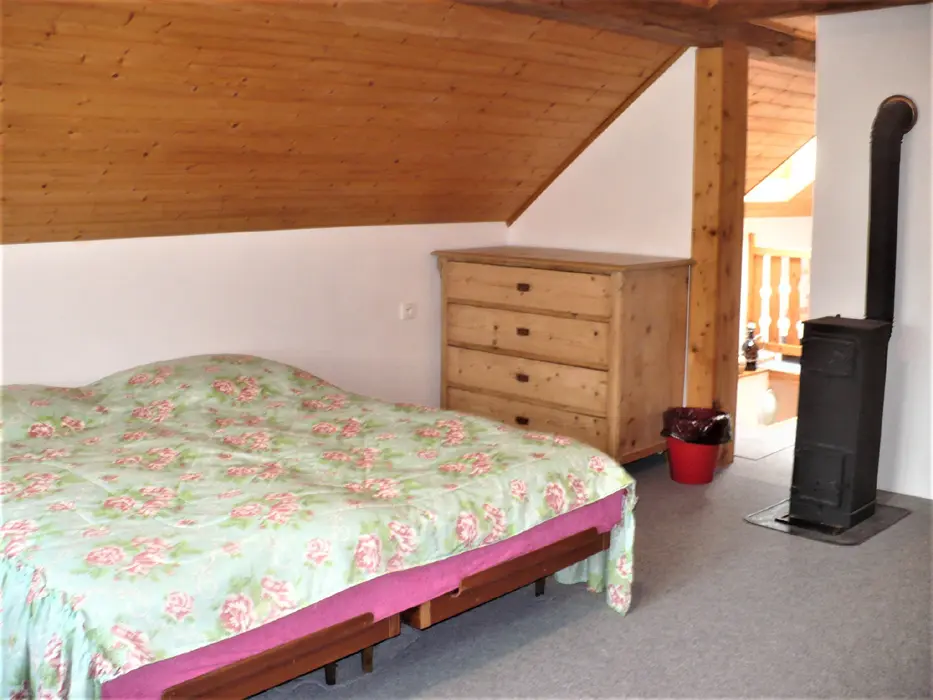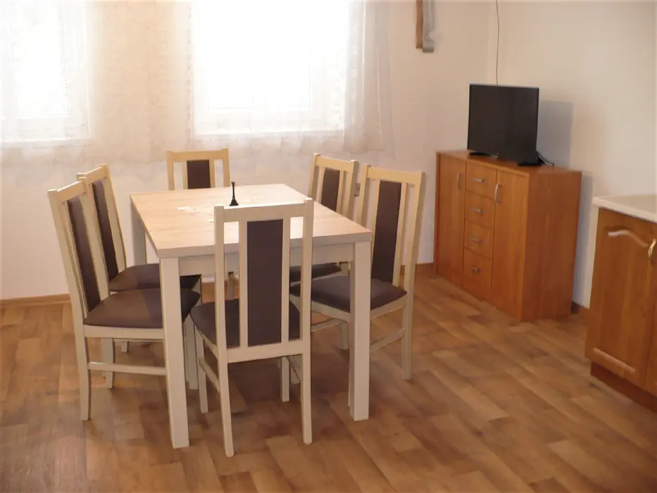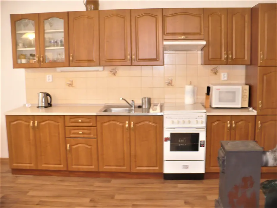 Obytná místnost s rohovou sedačkou a jídelním stolem pro 6 osob, spojeno s kuchyní - plynový sporák s el. troubou, mikrovlnná trouba, varná konvice, lednice s mrazákem. 2 ložnice - v přízemí 1x2, v patře 1x4 lůžka. Sociální zařízení - přízemí - koupelna se sprchovým koutem, umyvadlem a WC, druhé WC v patře. Topení - tuhá paliva