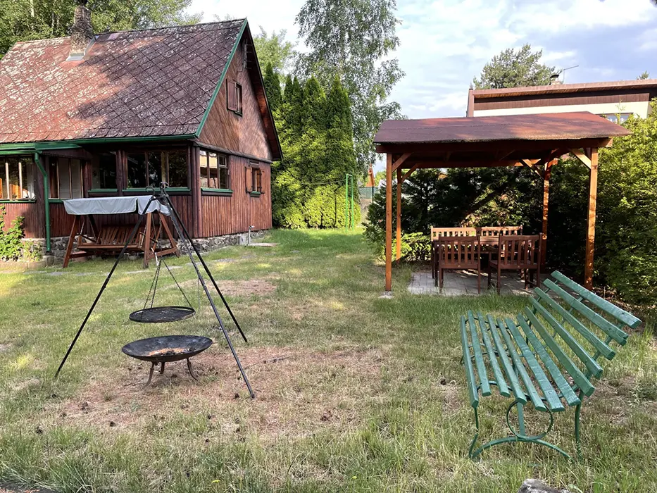 Venkovní kryté posezení, ohniště, uzamykatelný zahradní domek pro kola