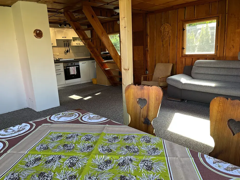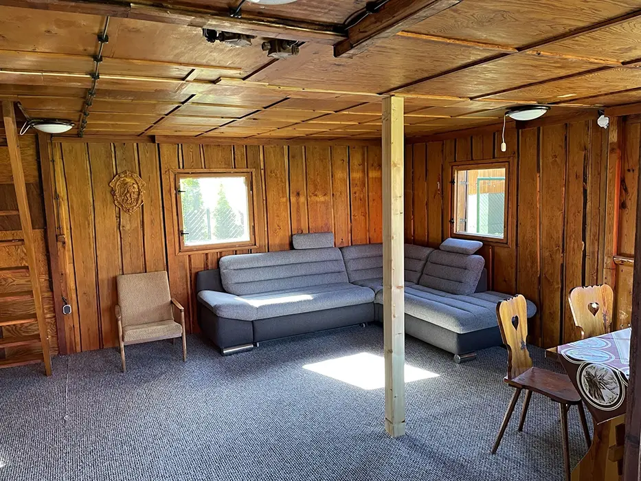 Obývací pokoj - velká rozkládací pohovka - 2 přistýlky, jídelní stůl a židle, spojený s kuchyní - el. trouba, indukční varná deska, lednice, mikrovlnka, varná konvice, nádobí. V patře 1 ložnice 1x3 lůžka. Soc. zařízení - sprchový kout, umyvadlo, WC v koupelně