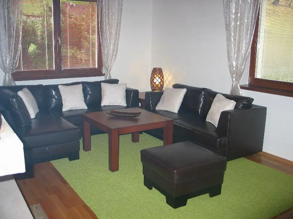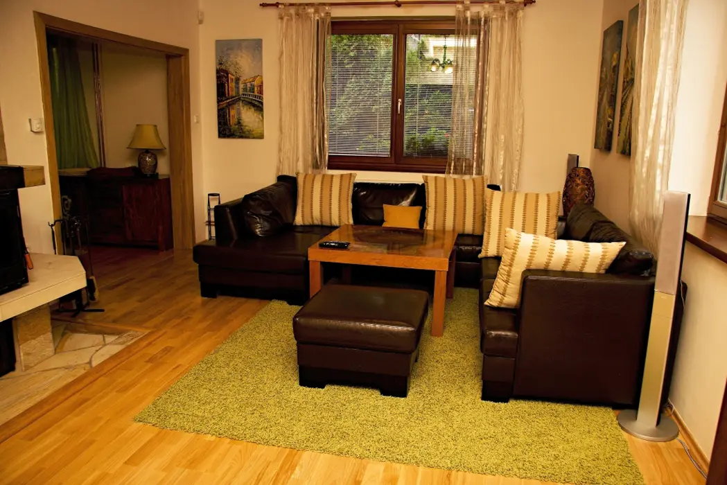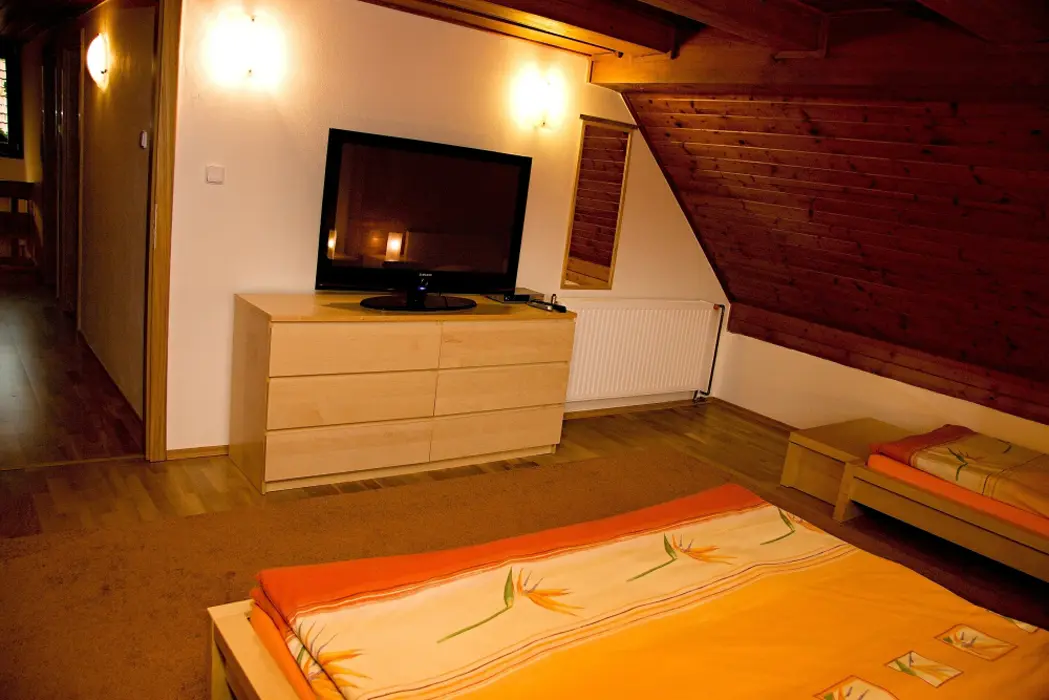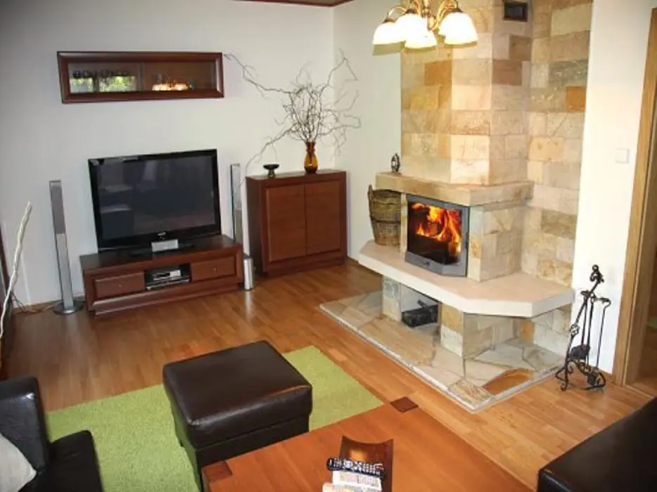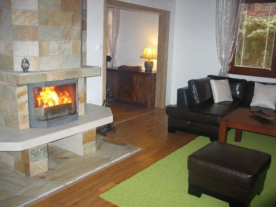 Obývací pokoj - samostatný, krb, TV, SAT, DVD - domácí kino. Kuchyně - sklokeramická deska, el.trouba, lednička, mikrovlnná trouba, myčka, rychlovarná konvice, kávovar, jídelna. 3 ložnice - 2x2, 1x4, každá s LCD. Sociální zařízení - koupelna s masážním sprchovým panelem, 2x samostatné WC. Topení - krb s rozvodem, podlahové, přímotopy.