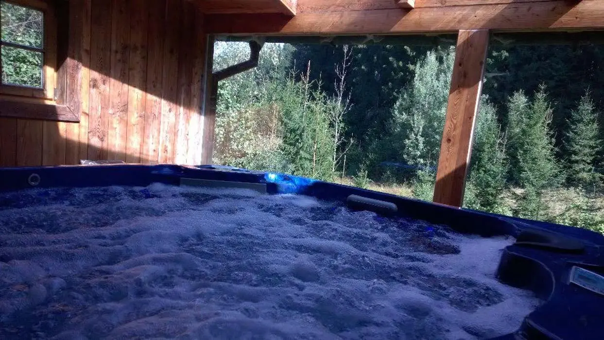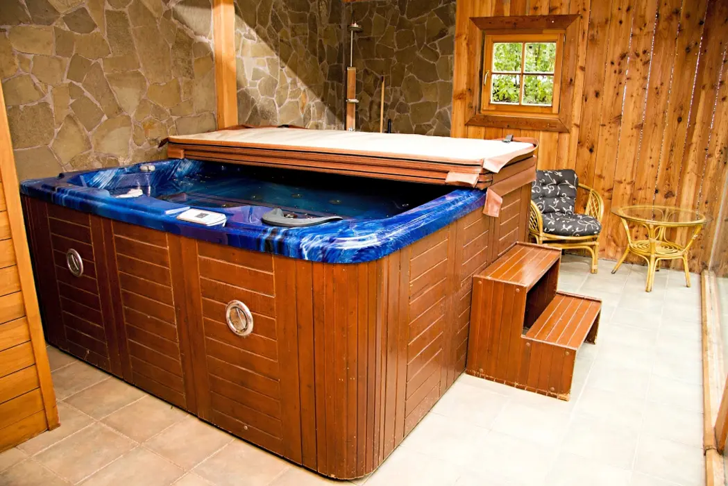 VNITŘNÍ MASÁŽNÍ VÍŘIVKA. Samostatná prosklená wellness místnost s masážním bazénem SPA pro 5 osob (84 masážních trysek, barevné podsvícení), infrasaunou a posezením