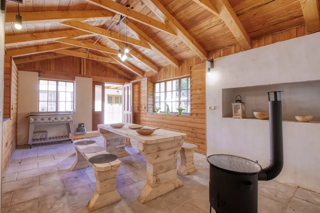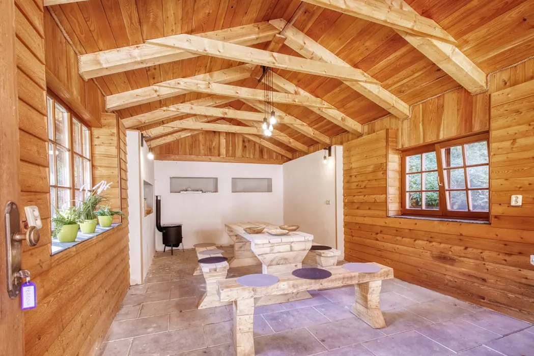 Krytá venkovní terasa s posezením, gril, pískoviště, houpačky a skluzavka, samostatná wellness budova - vířivka pro 9 osob, finská sauna pro 8 osob, posezení, sprcha, WC