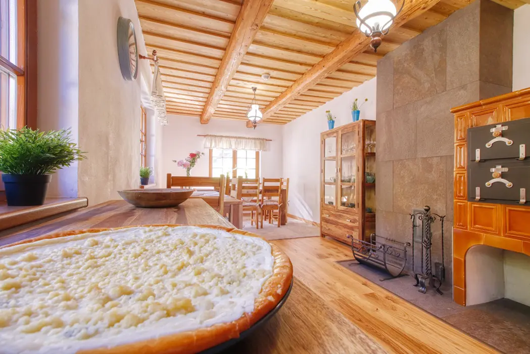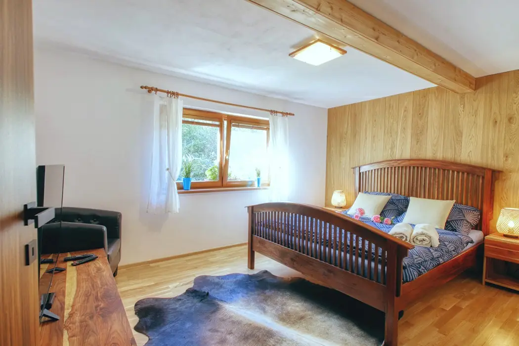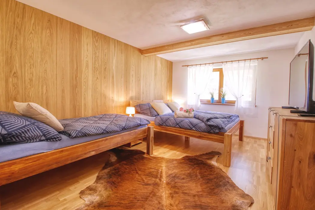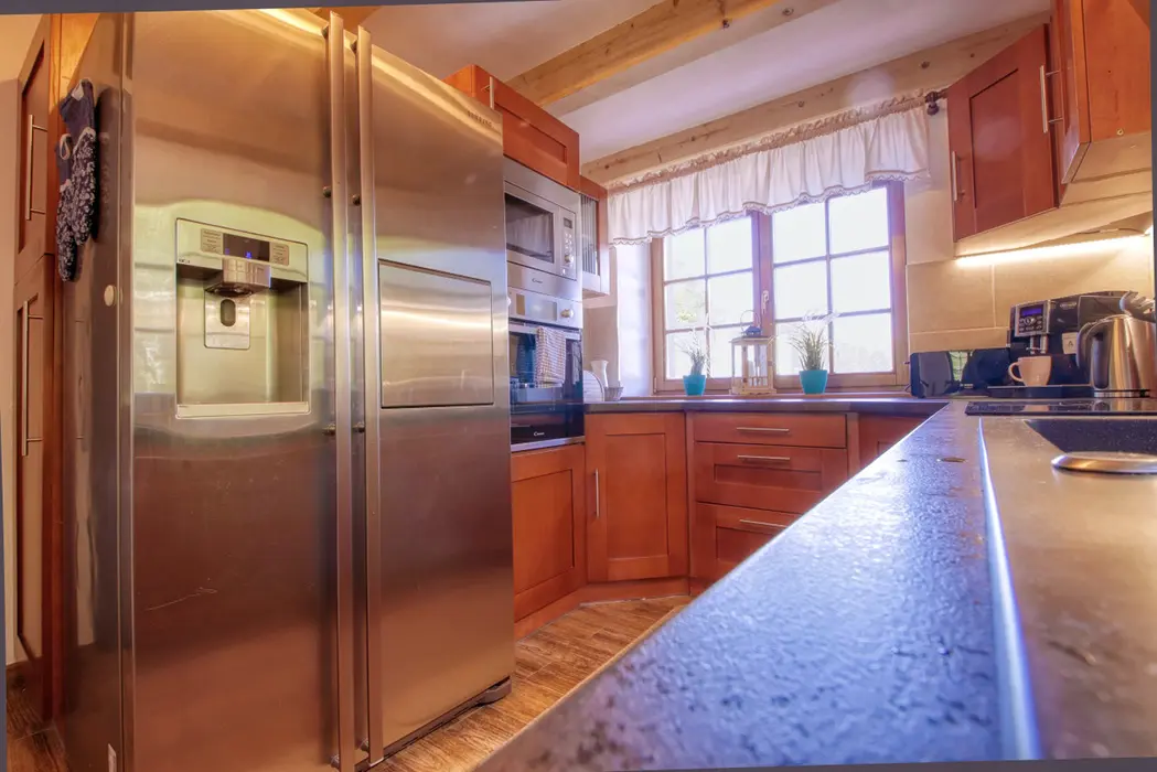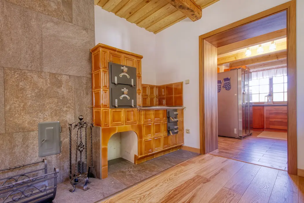 V přízemí - prostorná obytná část - krb, sedací souprava, LCDTV, plně vybavená kuchyně - sporák se sklokeramickou deskou, trouba, americká lednice, mrazák, myčka, mikrovlnná trouba, kávovar, nádobí, jídelna s kachlovými kamny. V patře 5 ložnic - 2x3, 3x2 lůžka, v každé TV. Sociální zařízení - 2x koupelna se sprchovým koutem, 3x samostatné WC. Topení - krb na tuhá paliva, elektrické a podlahové topení