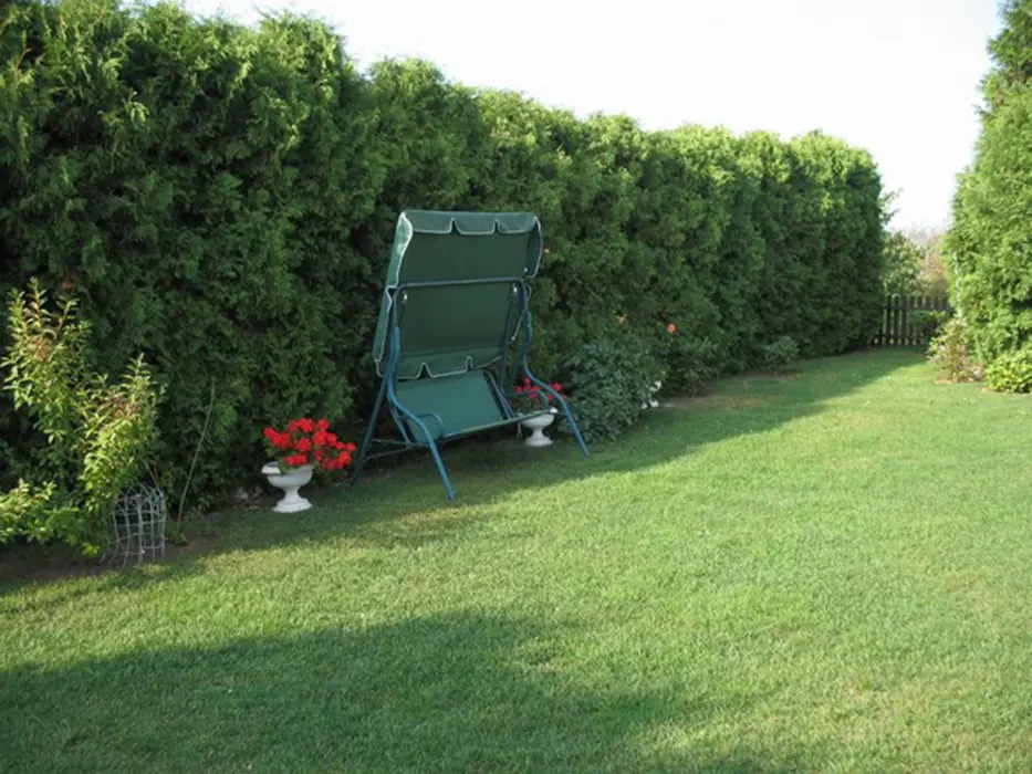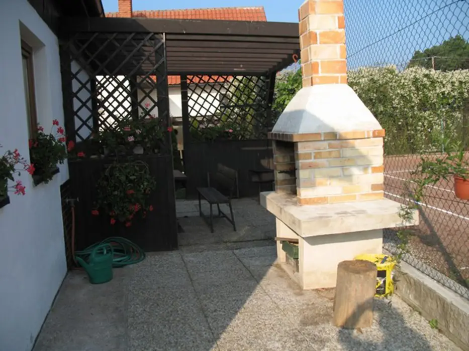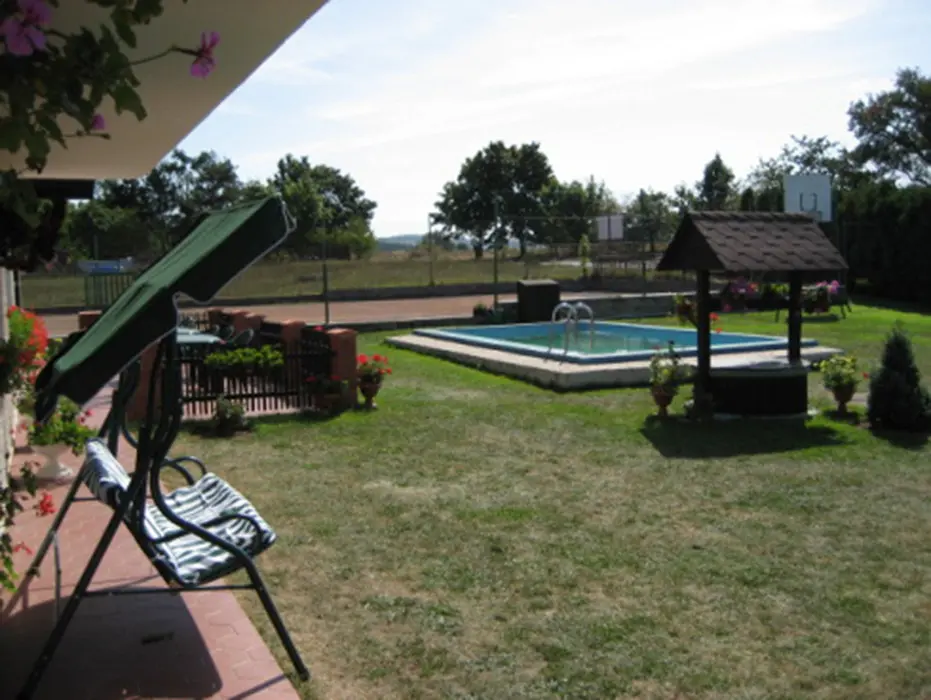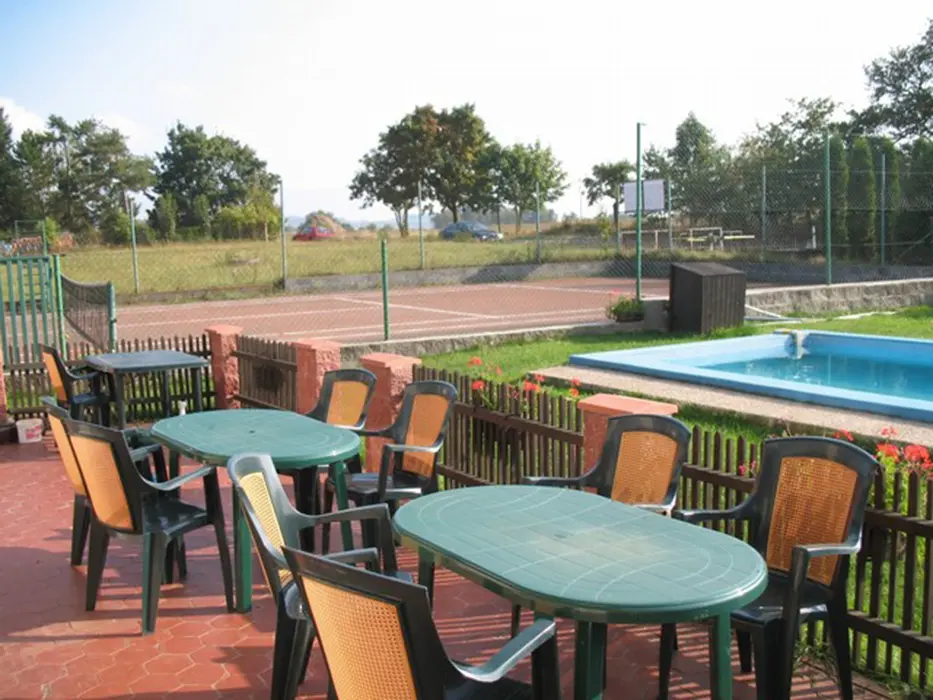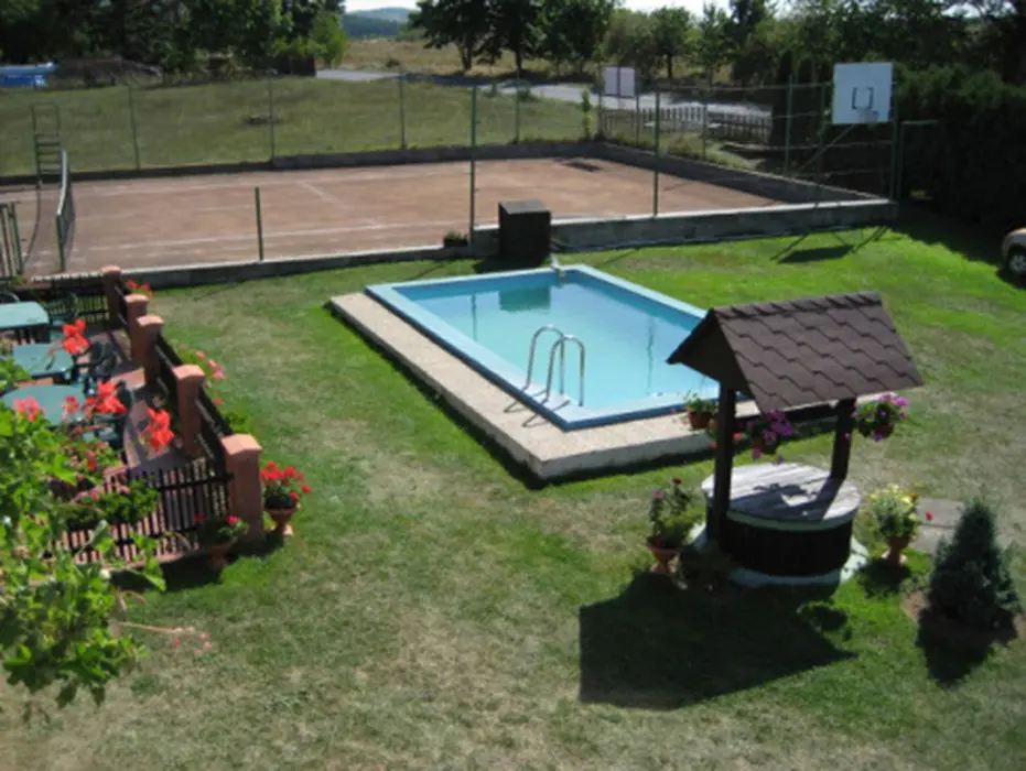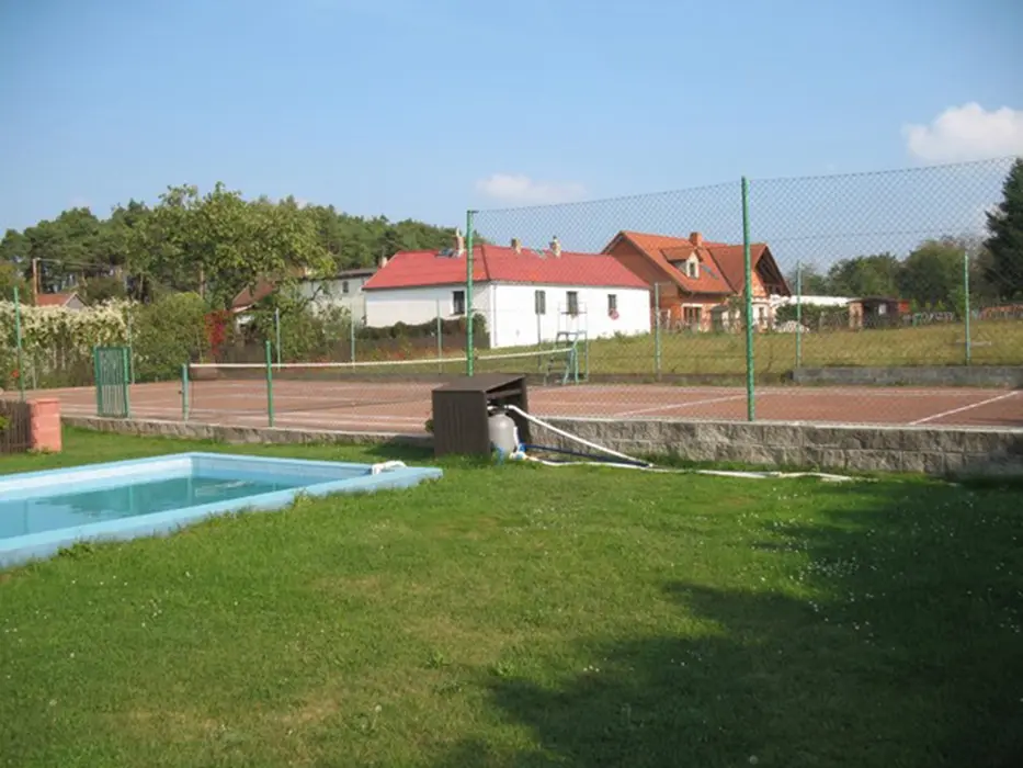 Bazén (7x3x1,4 m) s filtrací, venkovní posezení (zahradní nábytek), krb, basketbalový koš, houpačku pro děti a tenisový kurt, pískoviště, uzamykatelný prostor pro kola