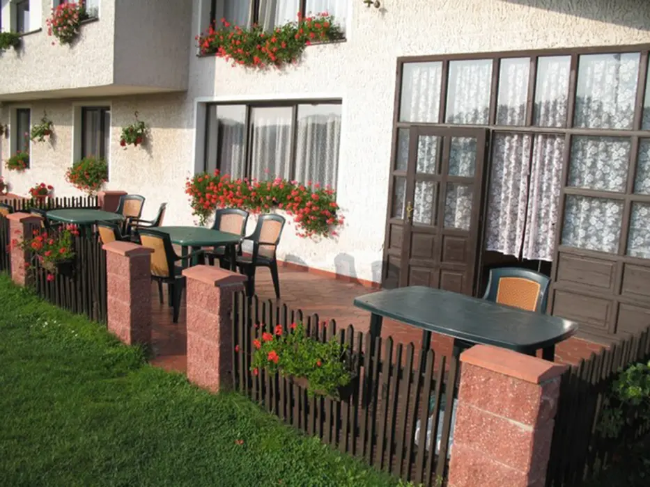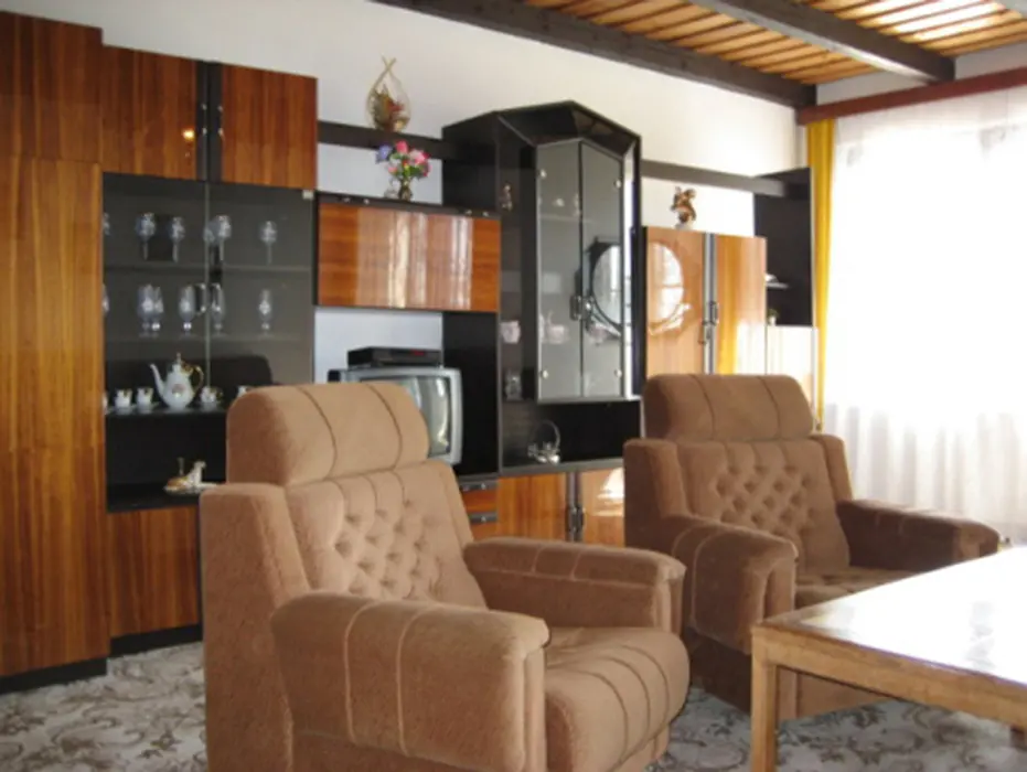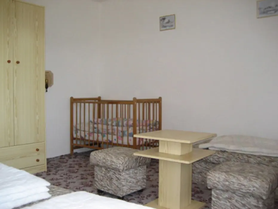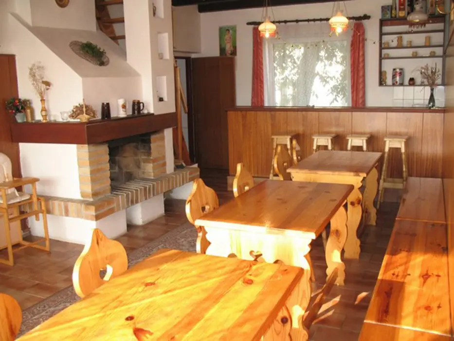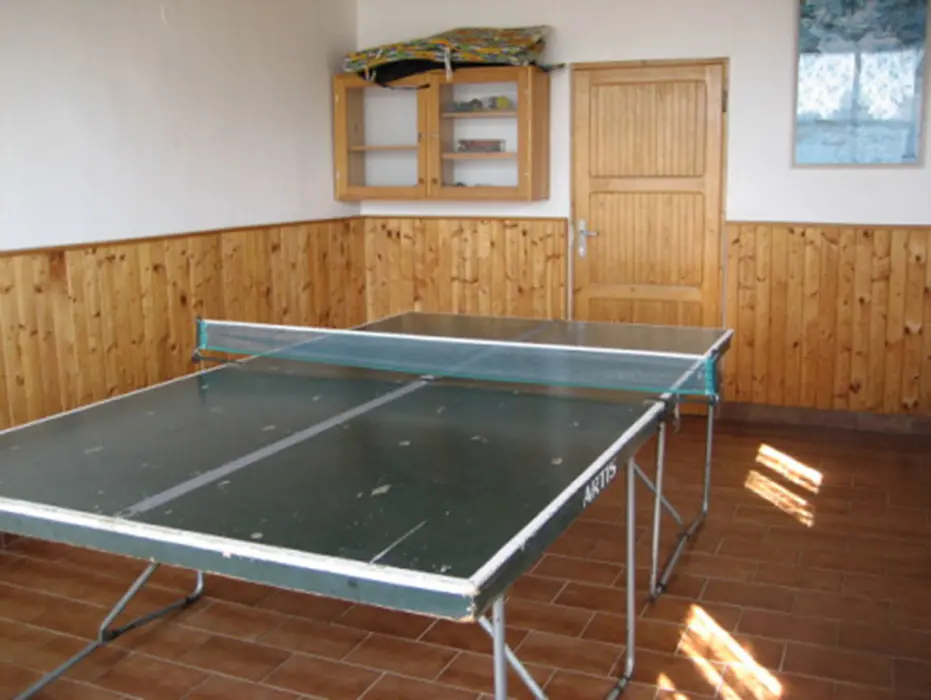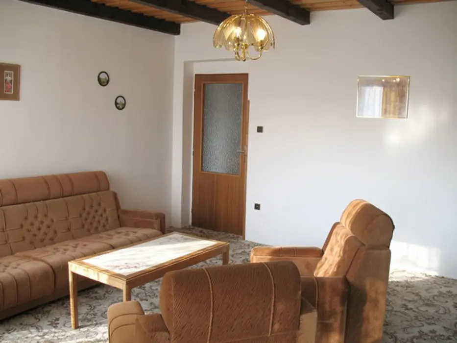 Přízemí: společenská místnost - spojená s kuchyní, bar, barové židličky, lednice, rádio, krb, 3x stůl, 3x lavice, 8x židle, dětská židlička. V prvním patře obývací pokoj - gauč, 2x křeslo, konferenční stolek, TV + SAT. 6 ložnic - v přízemí 2x2 lůžka, 1x3 + postýlka pro kojence, v patře 3x2 lůžka. Sociální zařízení - v přízemí - 2x umyvadlo, 2x WC, sprcha, v patře - vana se sprchou, WC, umyvadlo, bojler, pračka. Topení - tuhá paliva, krb, elektřina