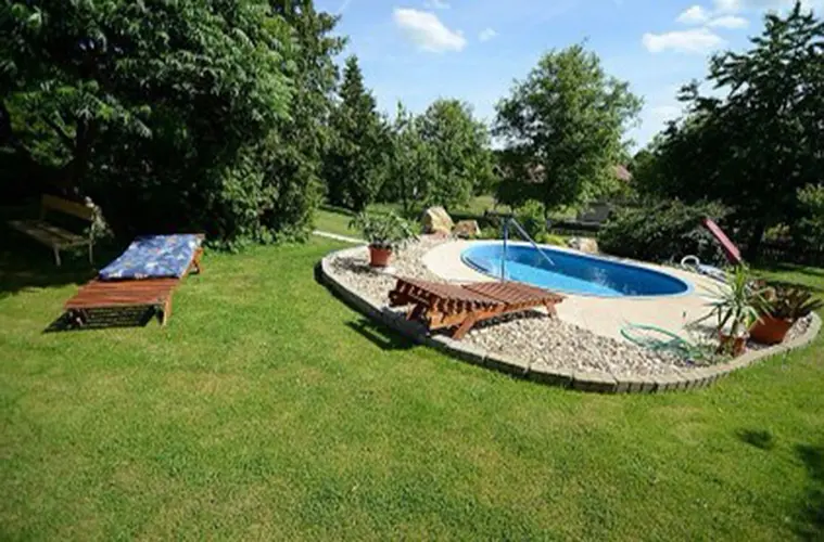 U chaty posezení, další u ohniště, zapuštěný bazén 3 x 3 m, pro děti pískoviště.