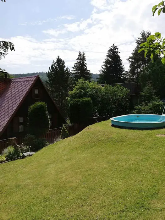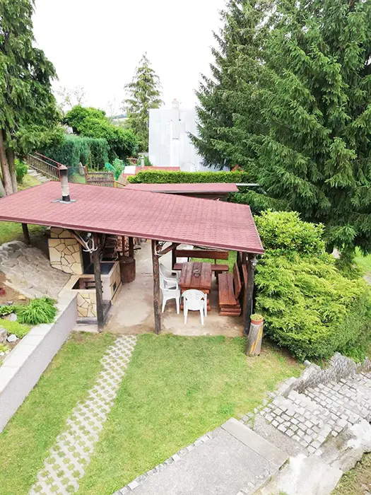 Kryté venkovní posezení, udírna, ohniště, bazén 4,2 x 2,8 x 1,2 m, travnaté hřiště, zahradní nábytek, houpačka