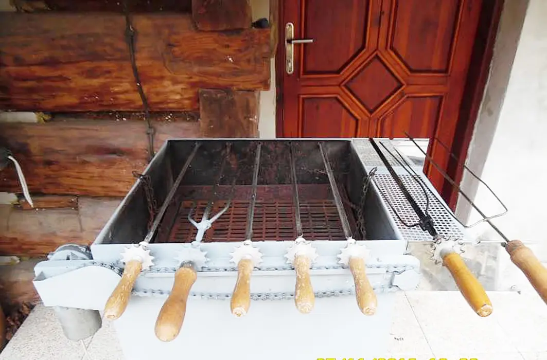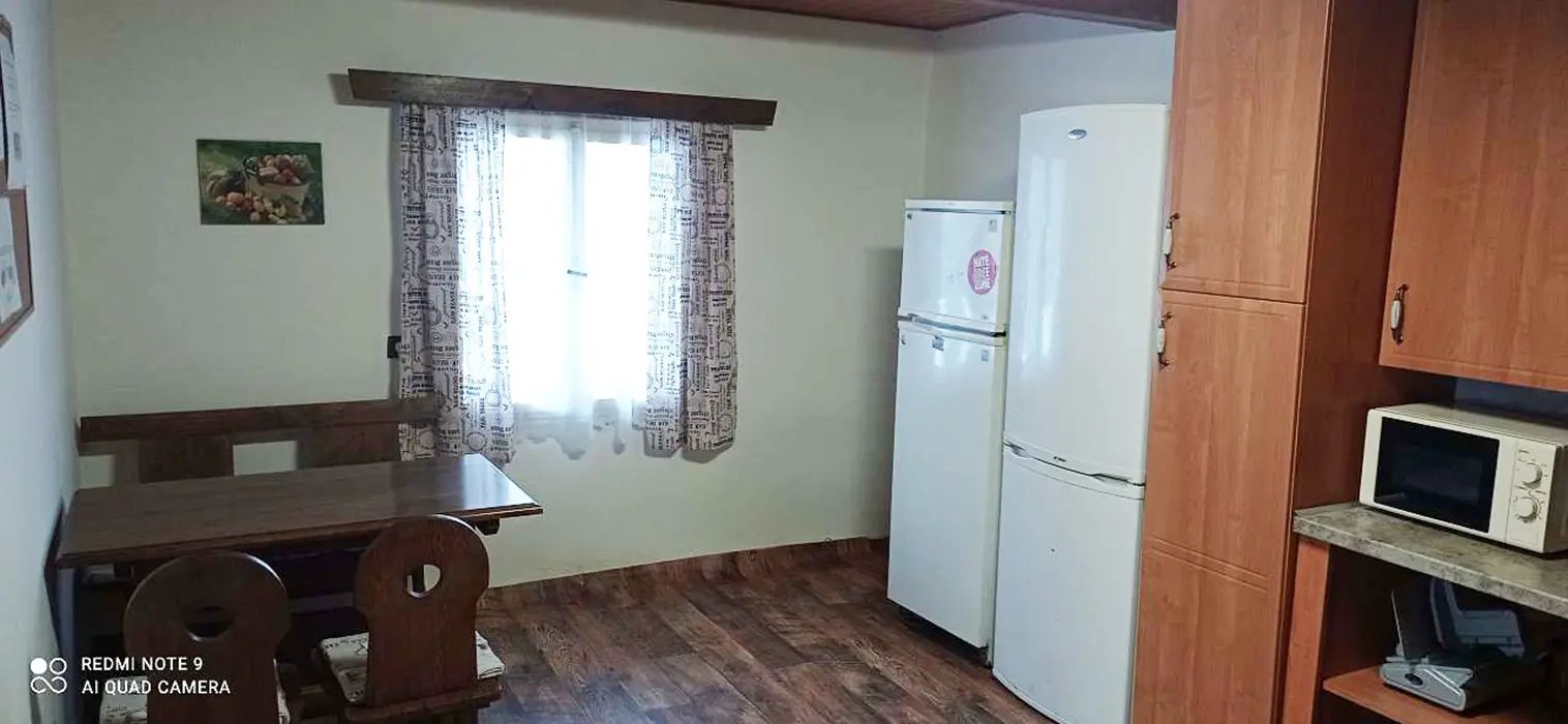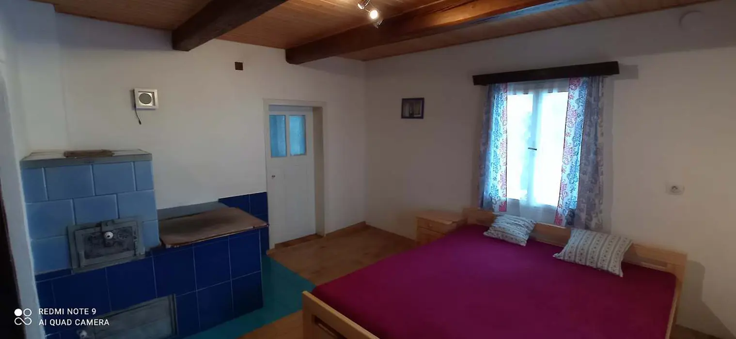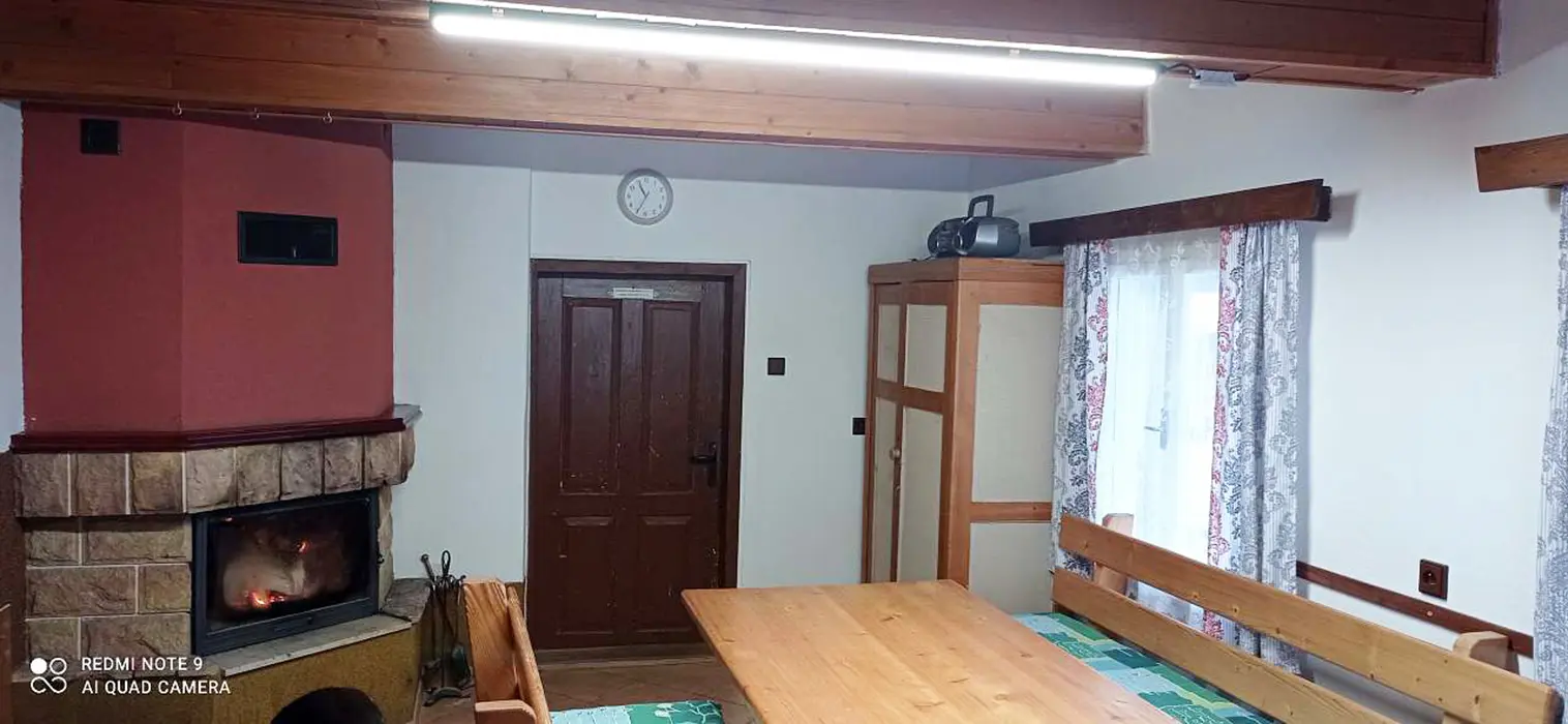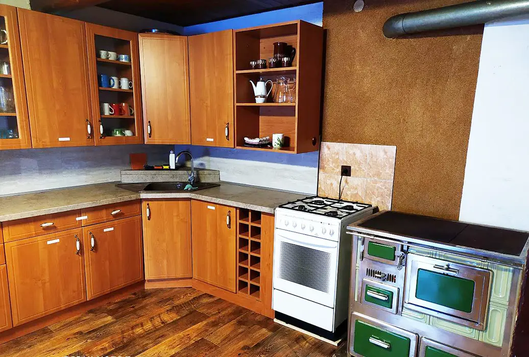 Obývací pokoj, kuchyně - sporák na PB láhve, lednice s mrazákem, varná konvice, toustovač, nádobí. 4 ložnice - v přízemí 2x2, v podkroví 1x5, 1x6 lůžek. Koupelna se sprchovým koutem + WC, další samostatné WC. Objekt se vytápí pomocí dvou krbů a starých kachlových kamen + možnost přitápění el. přímotopy, ohřev vody je zajištěn pomocí solárního systému + dohřev elektřinou