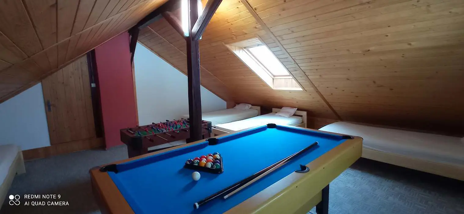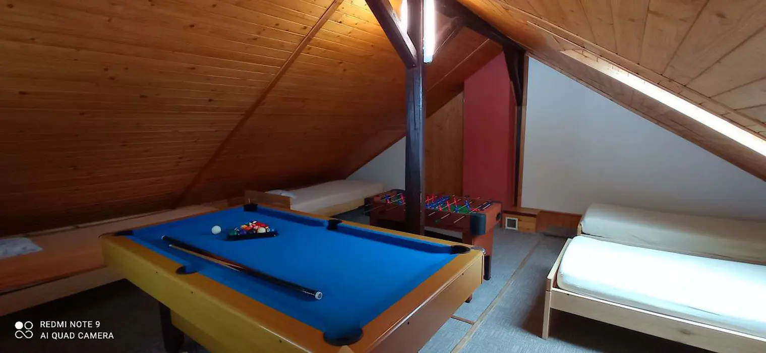 Ohniště s posezením, k dispozici gril, v uvnitř billiardový stůl a stolní fotbal