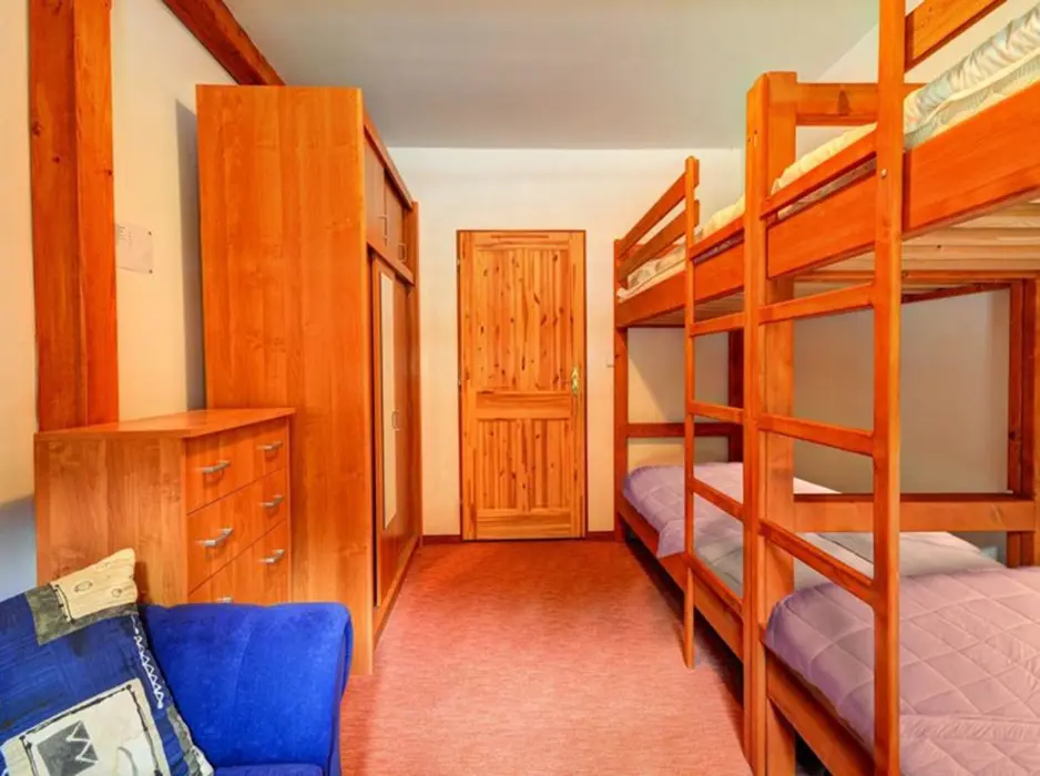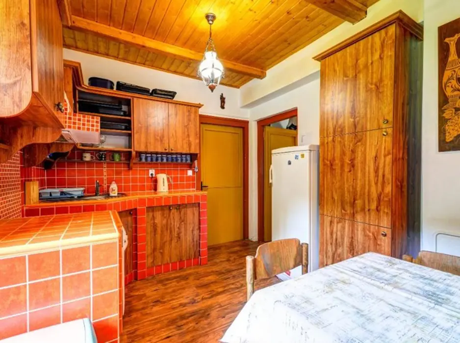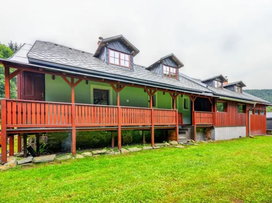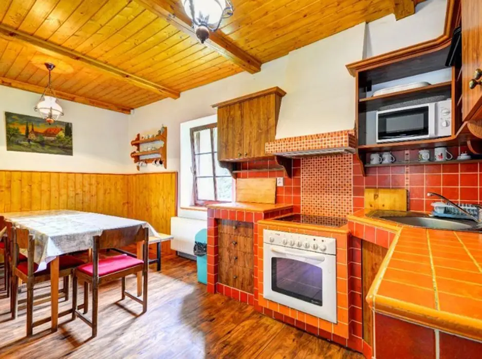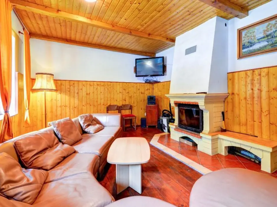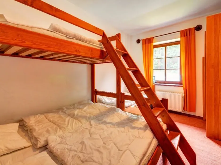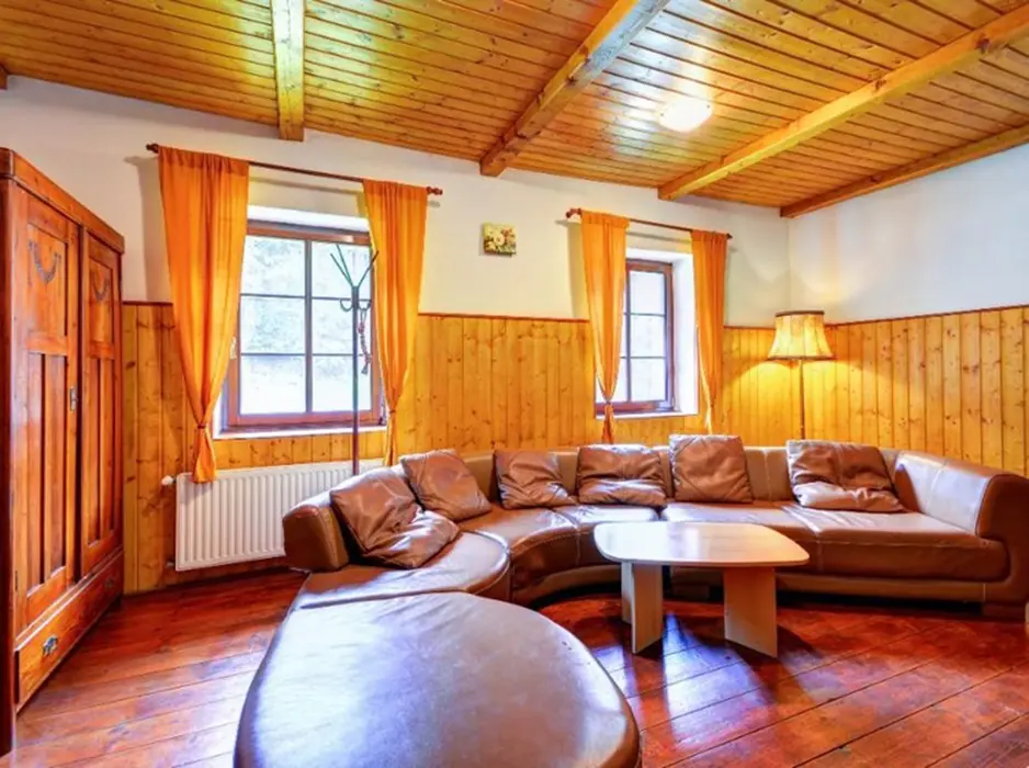 V přízemí: obývací pokoj s posezením, krb, plně vybavená kuchyně s jídelnou. 2 ložnice - 2x4 lůžka. Soc. zařízení - koupelna, 2x WC. Topení - centrální - elektrokotel + krb