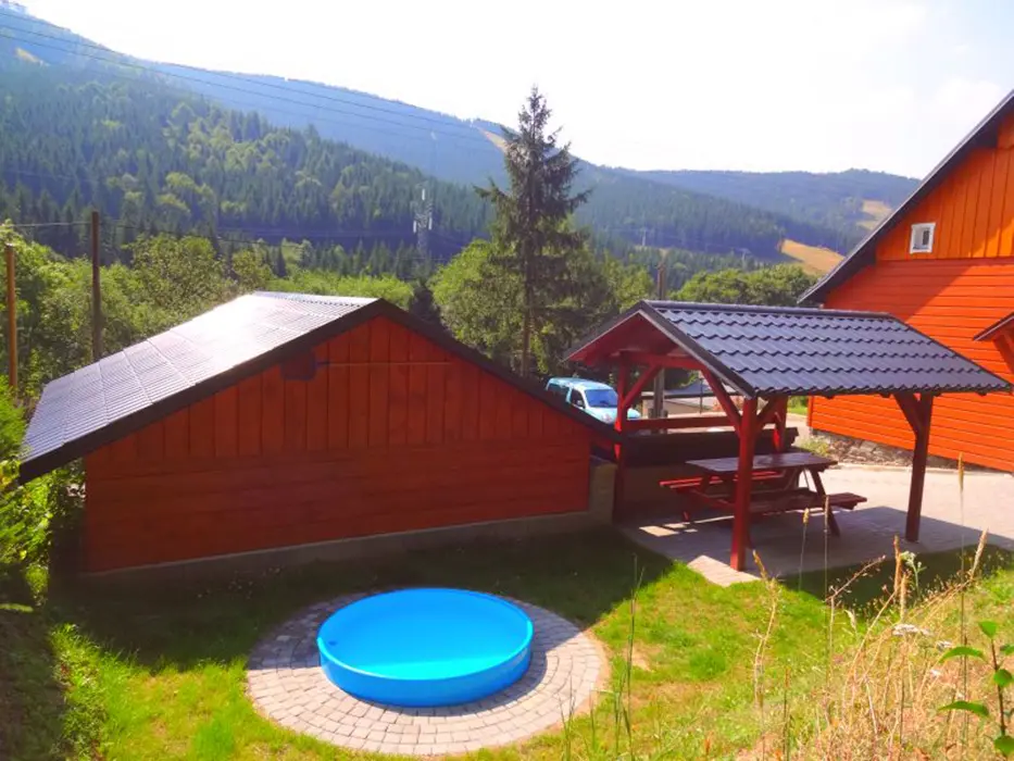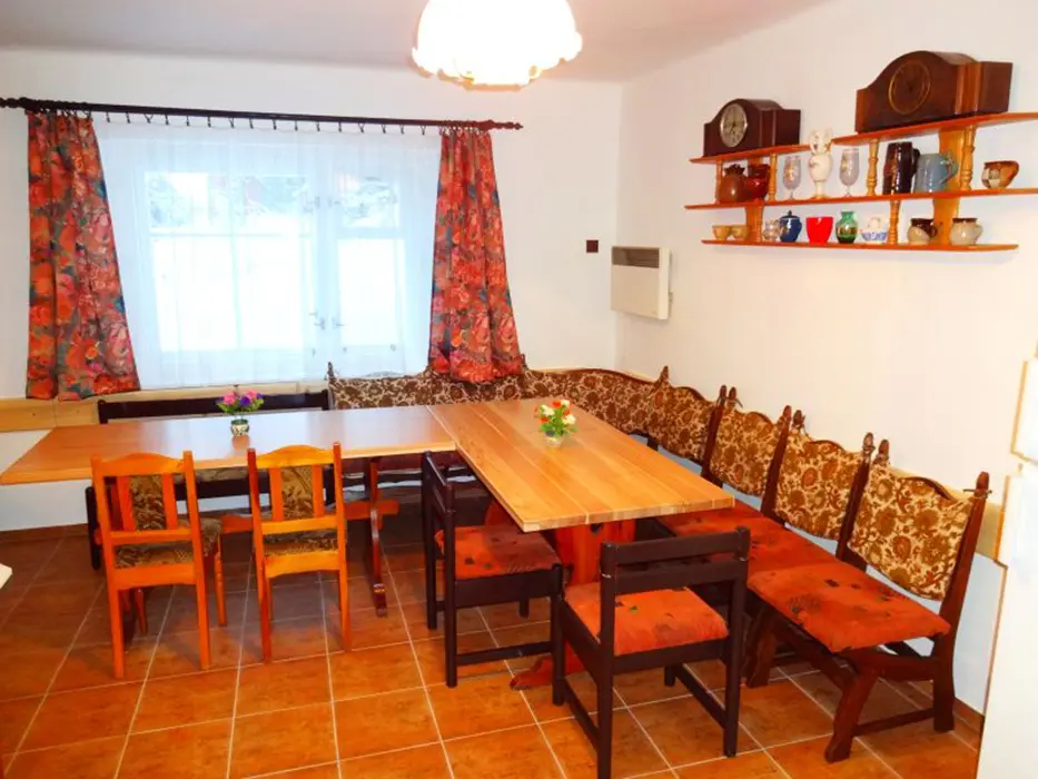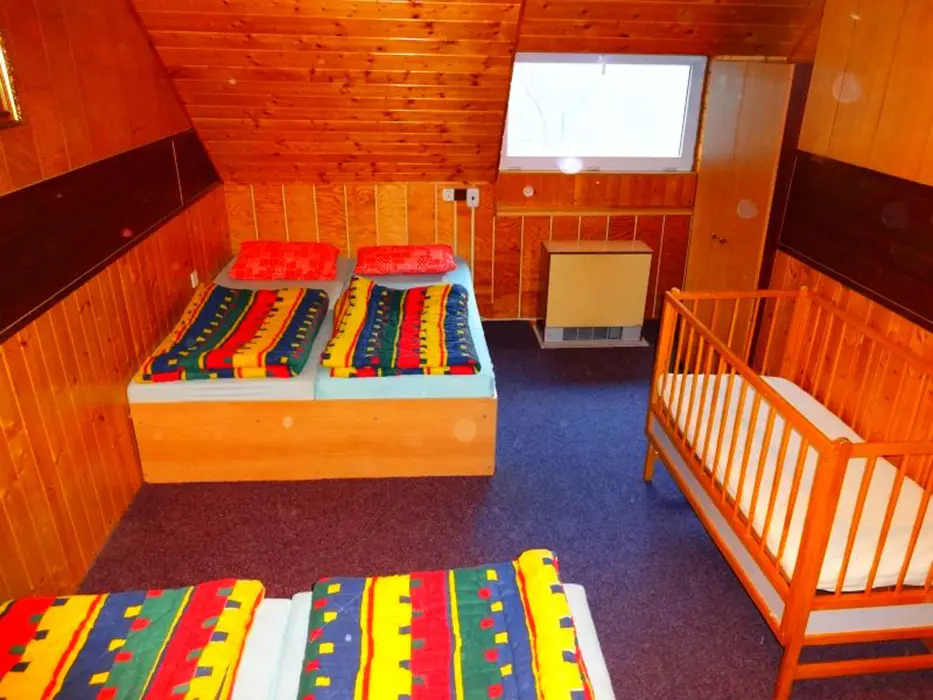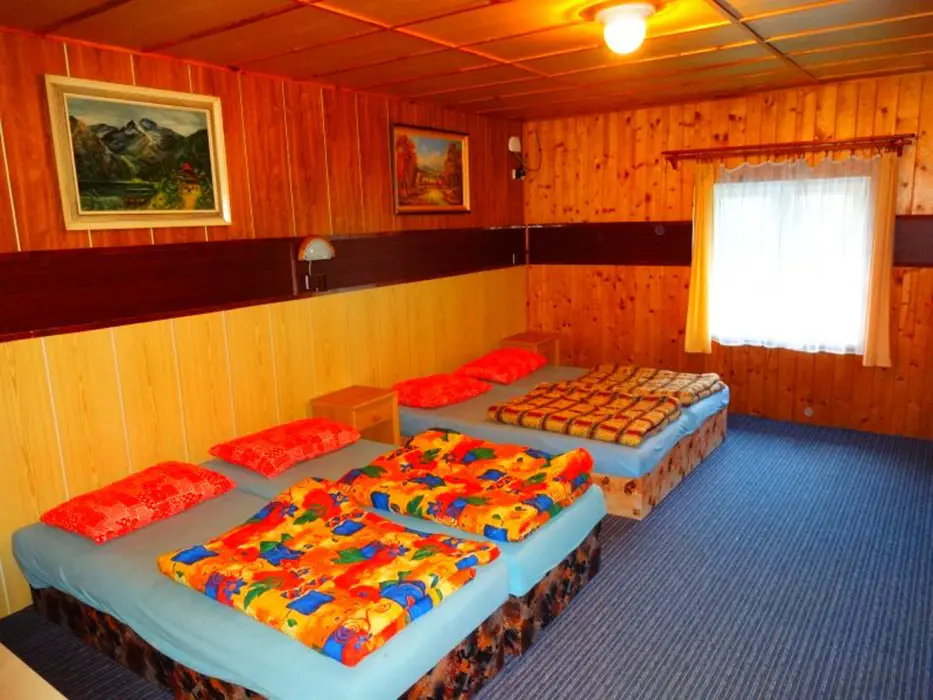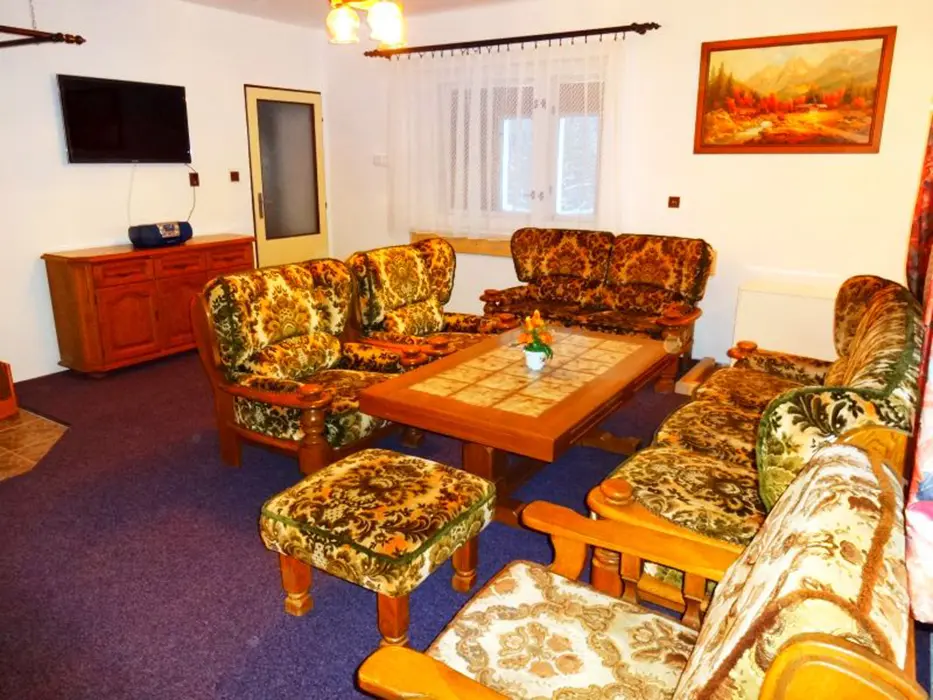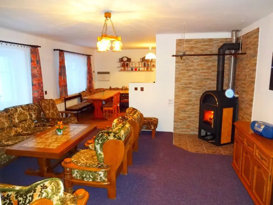V chatě je velký obývací pokoj spojený s kuchyní a jídelnou, sedací souprava, tv-lcd, wifi internet, lednice, mraznička, myčka nádobí, sklokeramická varná deska, mikr. trouba, var. konvice, toustovač, trouba, krbová kamna, vnitřní herna se stolním tenisem. 3 ložnice 3x4 lůžka, dětská postýlka. Koupelna se sprchovým koutem, 2x WC. Topení - el.topení (akumulačky). Stolní fotbal.