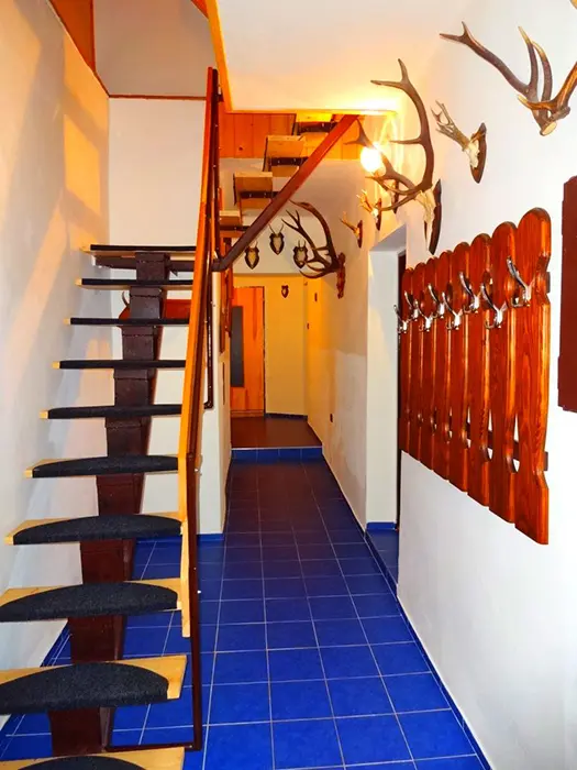 Prostorná chalupa, částečně s dřevěným obložením, dlažbou a mysliveckými prvky.