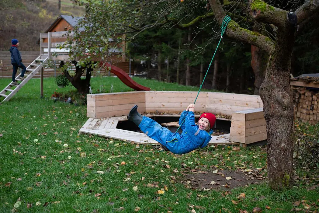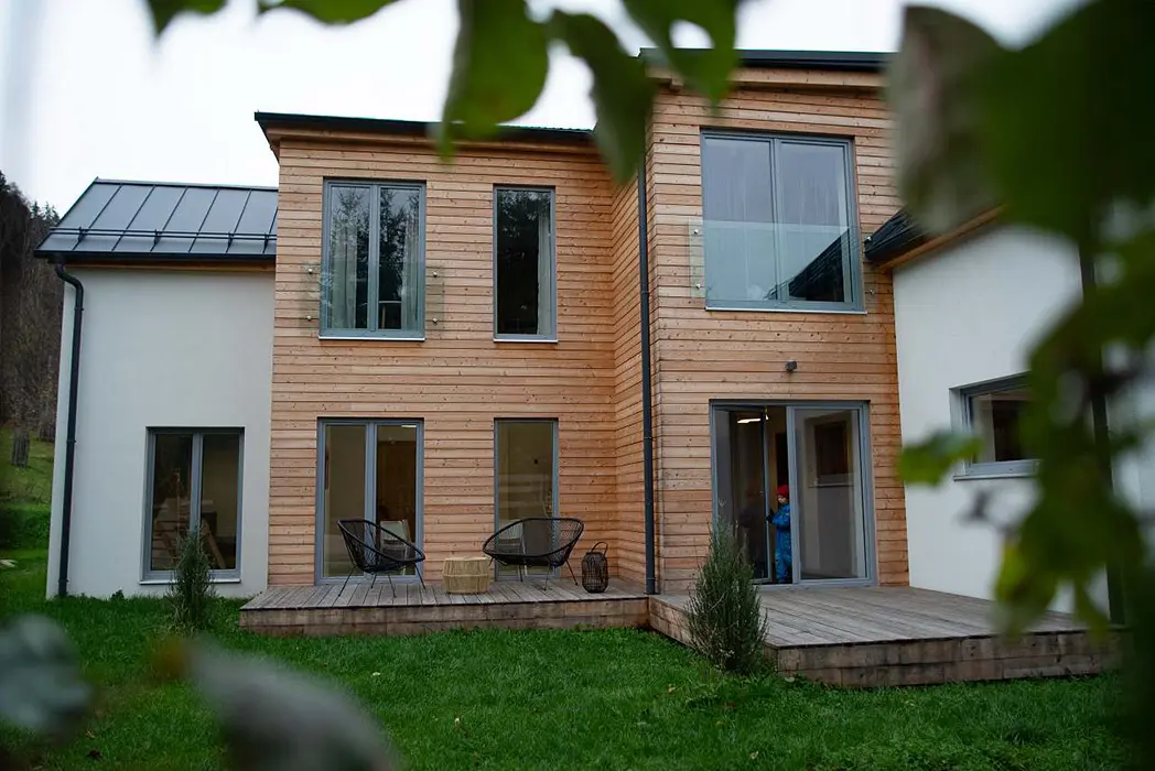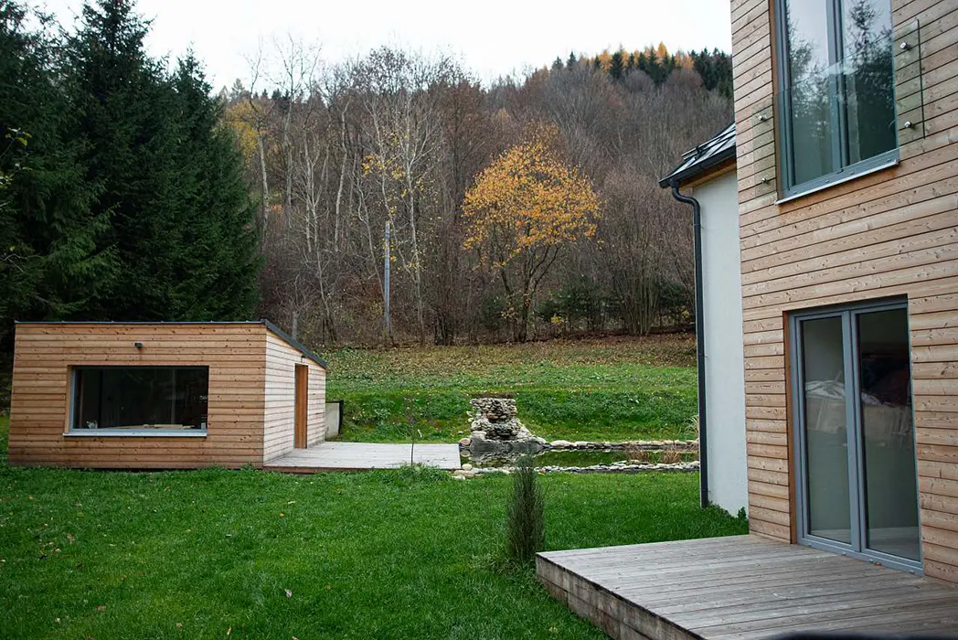 Na zahradě přírodní jezírko vhodné ke koupání a slouží i jako ochlazovací po sauně, pro děti - houpačky, domeček, skluzavka, veliké otevřené ohniště, v domečku na zahradě - sauna se sprchovým koutem + WC, 3 samostatné terasy s posezením a přístupem do domu přes francouzské otevírací nebo posuvné prosklené dveře