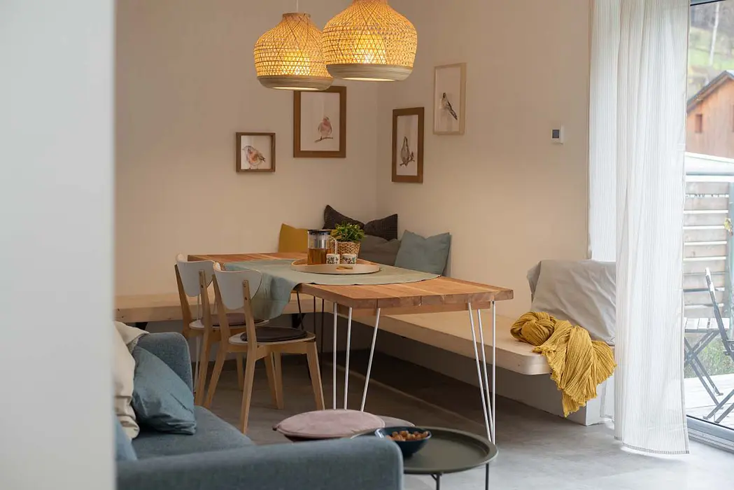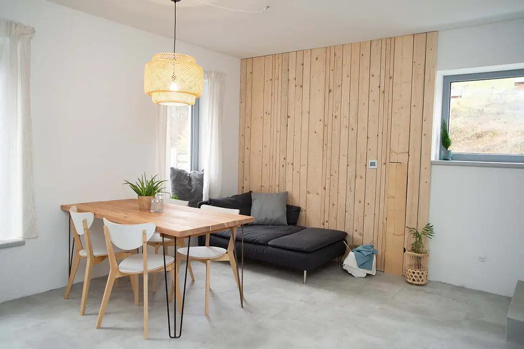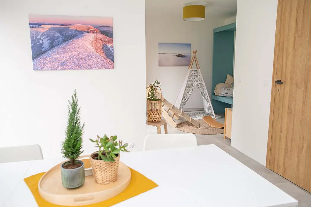 Objekt je řešen jako 3 samostatné jednotky. V přízemí - společné prostory: vstupní chodba, herna pro děti, společenská místnost, krbová kamna, myčka, kávovar, vinotéka, velký stůl a židle. Soc. zařízení - walk-in sprchový kout, přebalovací pult, WC. Topení - v koupelně podlahové topení + žebřík, el. přímotopy