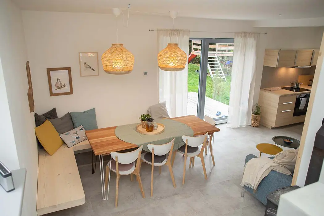 V přízemí - kuchyňská linka - myčka, el. sporák, lednice, nádobí, jídelní stůl a židle, v patře - 2 ložnice 2x4 lůžka. Soc. zařízení - koupelna se sprchovým koutem, WC. Topení - v koupelně podlahové topení + žebřík, el. přímotopy