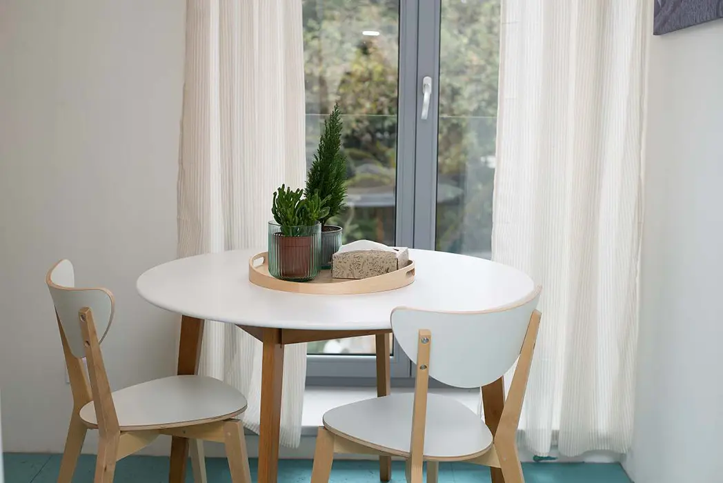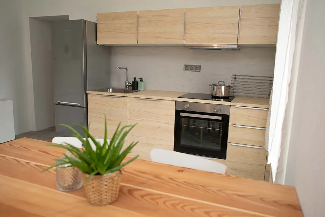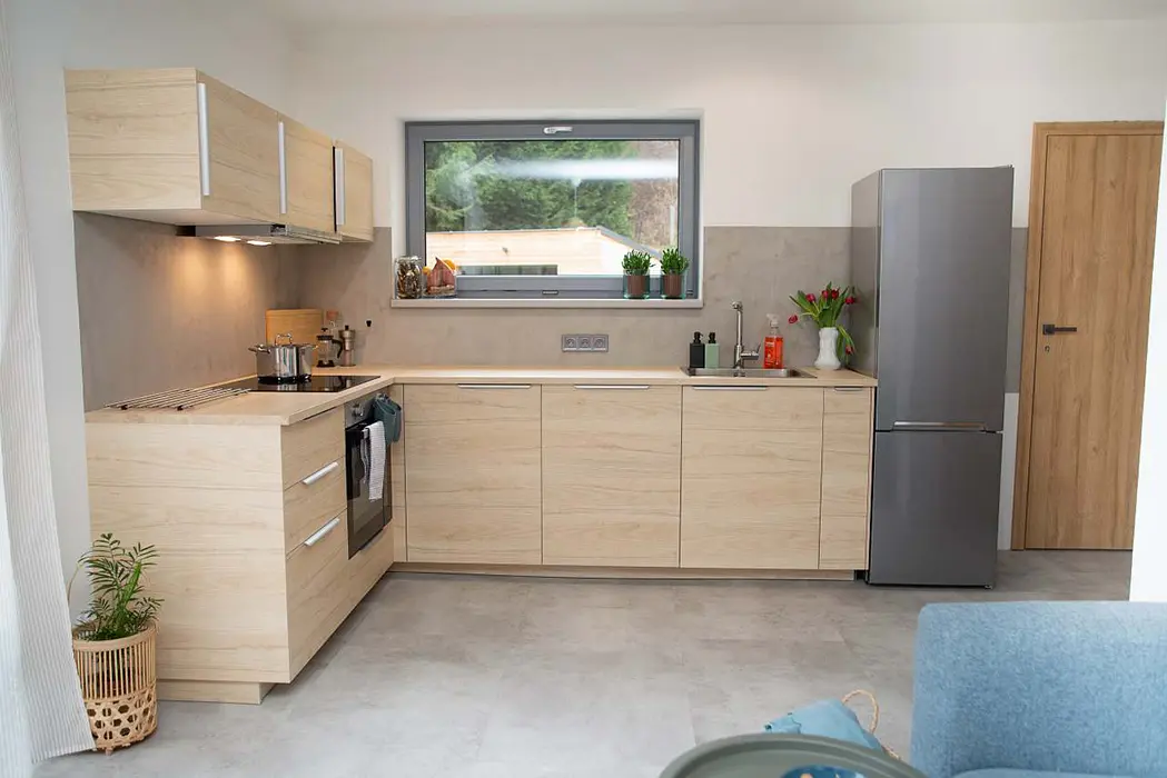V přízemí - prostorná kuchyně - jídelní stůl a židle, myčka, el. sklokeramická deska, trouba, lednice, nádobí, v patře - 2 ložnice 1x3, 1x2 + dětská postel. Soc. zařízení - koupelna s vanou, WC. Topení - v koupelně podlahové topení + žebřík, el. přímotopy