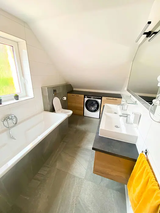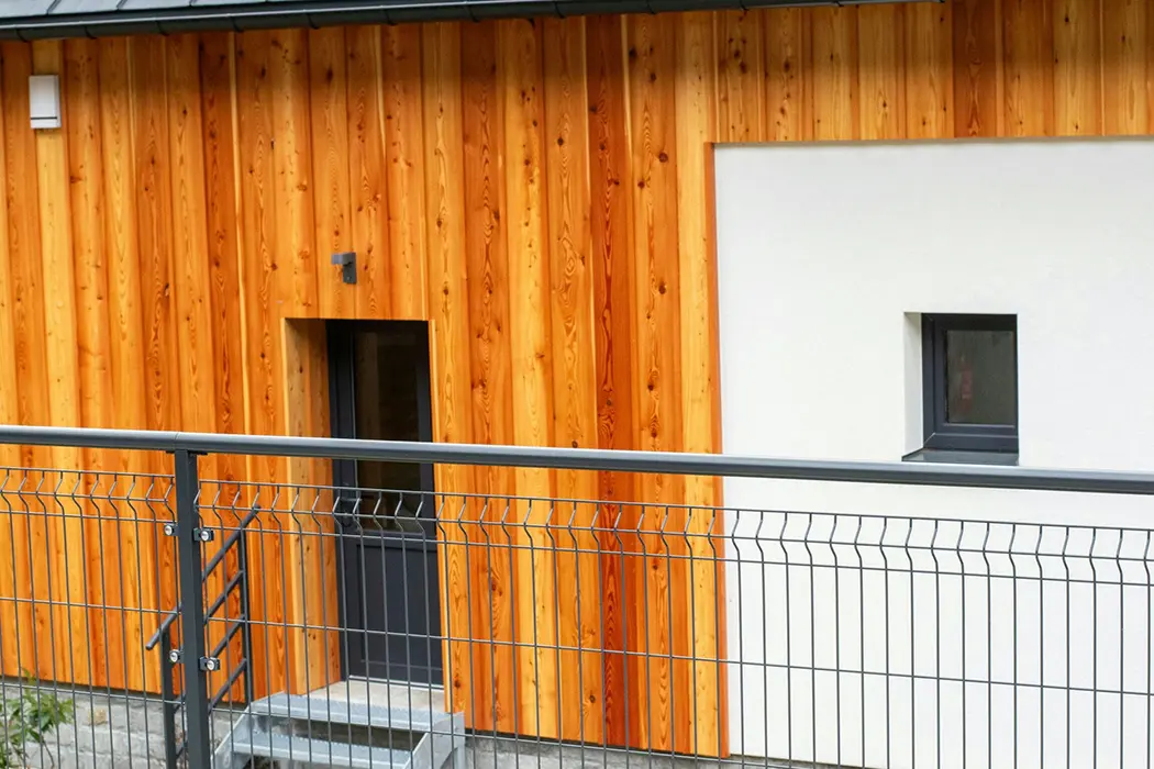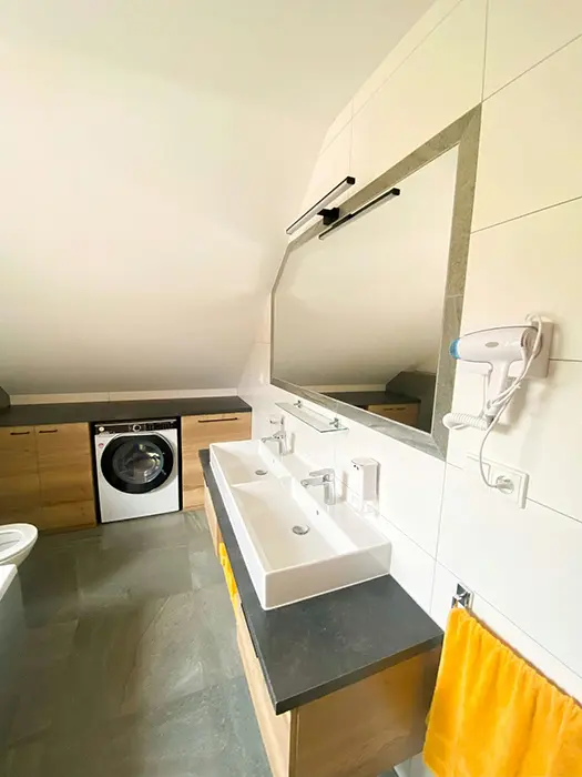 Prostorný oplocený pozemek cca 1300 m2, houpačky, stolní tenis, trampolína, společný zahradní krb na opékání, pro každou polovinu je v suterénu vlastní wellness s vířivkou a saunou, lyžárna s vysoušečem obuvi, místnost na úschovnu kol a kočárků