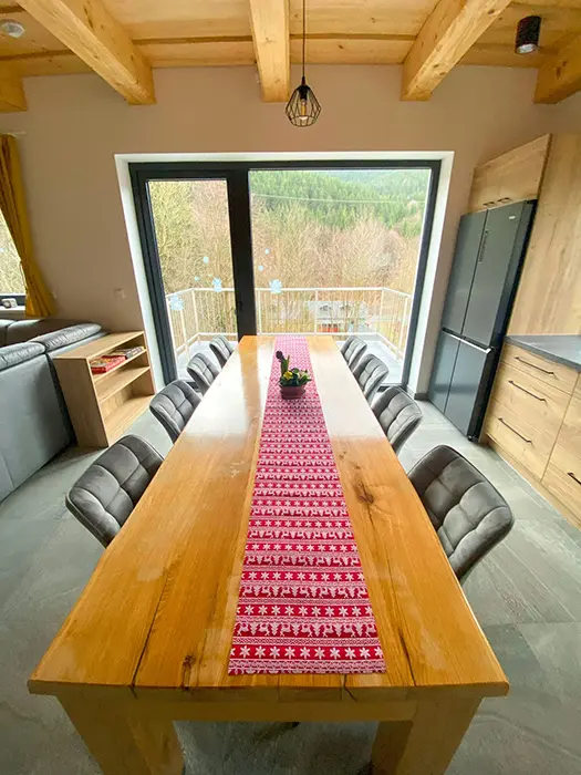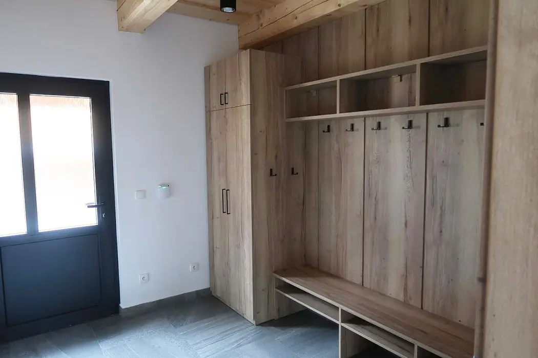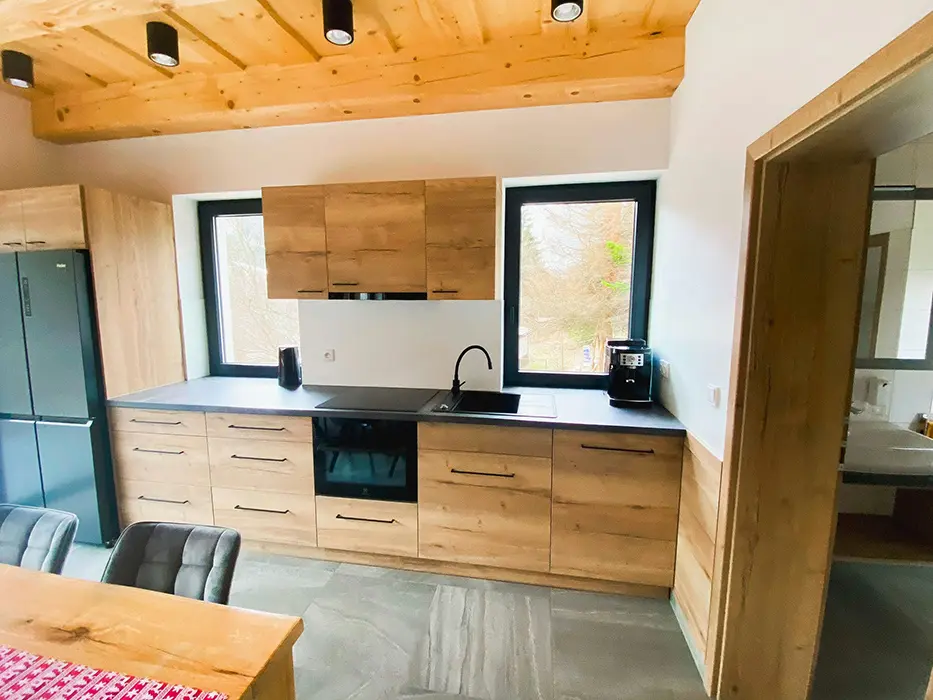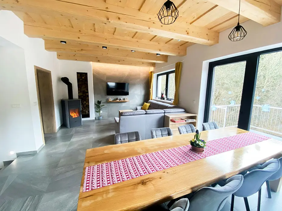 Chata je rozdělena na dvě stejné, zrcadlově otočené poloviny - každá pro 9 osob. V suterénu - wellness + sauna, přízemí - vstupní chodba, obytná část - sedací souprava, velký stůl a židle, LCDTV, krbová kamna, vstup na terasu - posezení, plně vybavená kuchyně - myčka, indukce, trouba s mikrovlnkou, digestoř, americká lednice, kávovar, toustovač, nádobí. V patře - 2 ložnice - 1x4, 1x5 lůžek. Soc. zařízení - 3 koupelny - 2x sprchový kout, 1x vana, 3x WC ( 2x WC jsou samostatné, 1x koupelně). Topení - v celém objektu podlahové napojené na elektrokotel a na krb z výměníkem