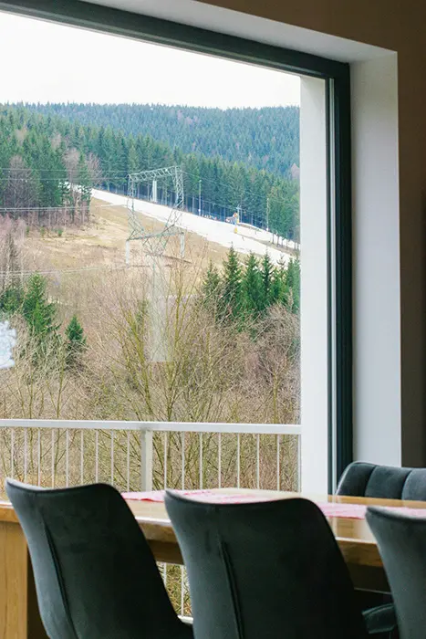 22 km Šumperk, 9,5 km Červenohorské sedlo, Kouty nad Desnou - v těsné blízkosti lyžařského areálu - cca 400 m s výhledem na lanovku, chata je rozdělena na 2 shodné poloviny - každá má svůj vchod