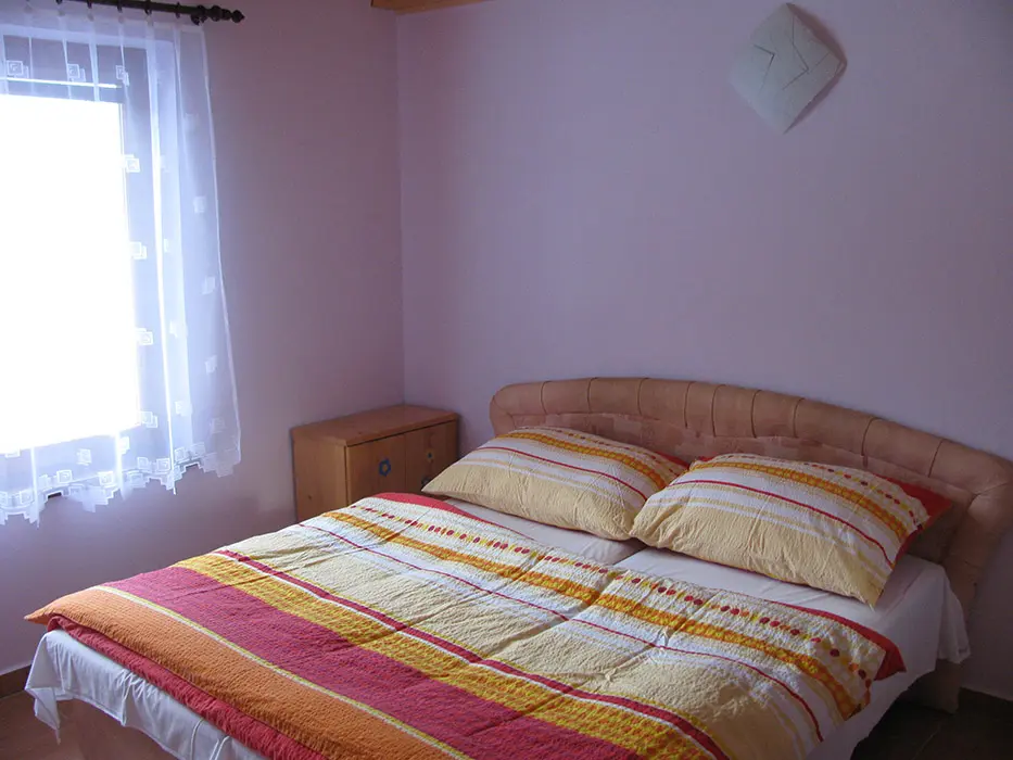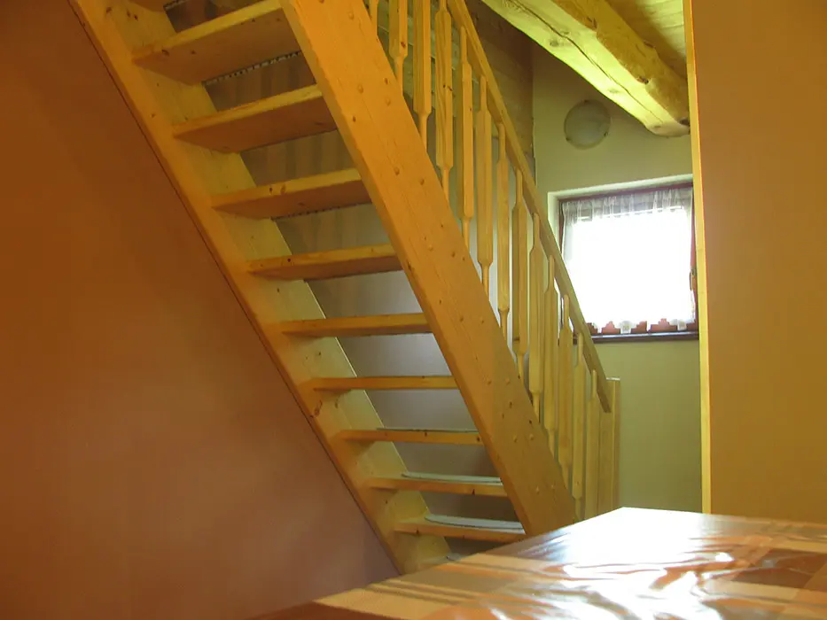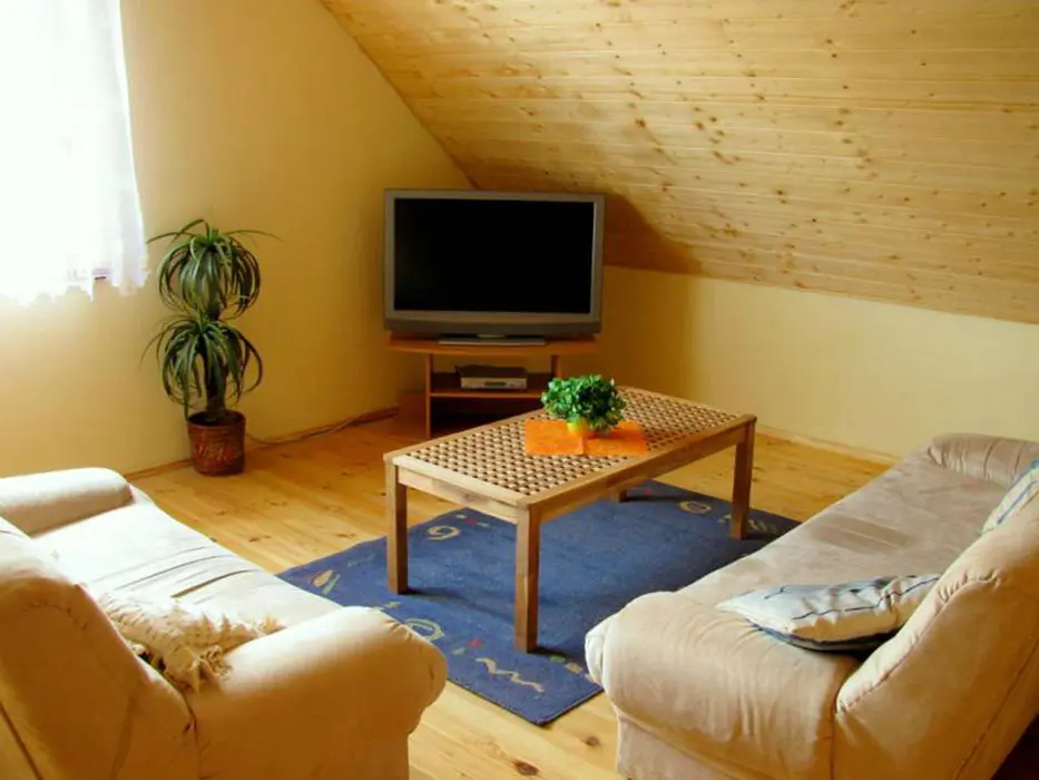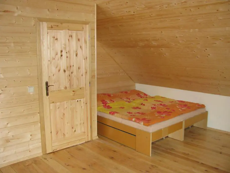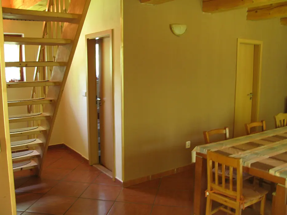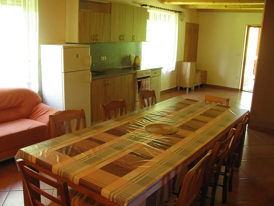 Obývací pokoj s posezením spojený s kuchyní. Kuchyně - lednice, plynový sporák, mikrovlnná trouba, rychlovarná konvice, jídelní stůl, židle. 3 ložnice 3x4 lůžka. Sociální zařízení - v přízemí 2x koupelna, sprchový kout, 2x WC. Topení krbová kamna.