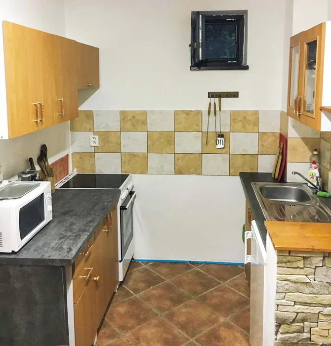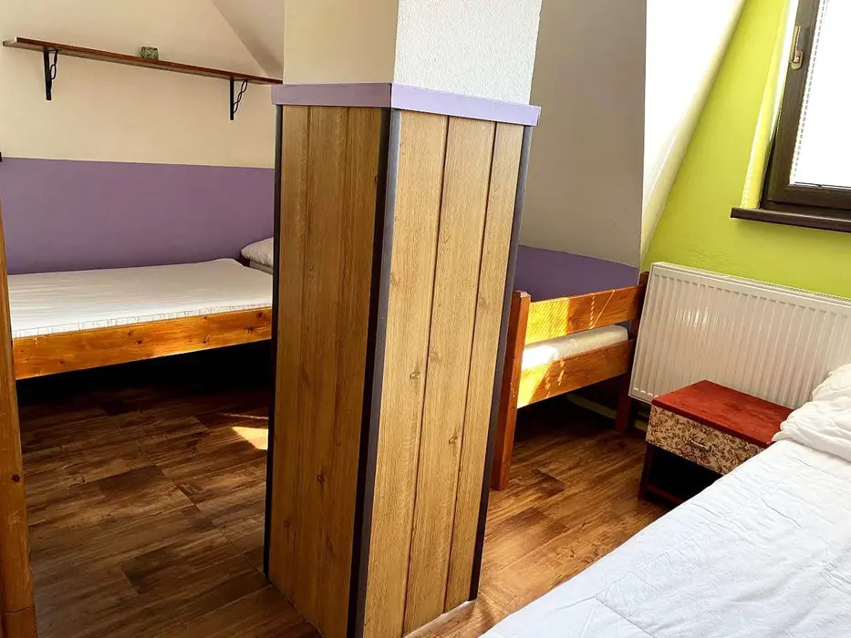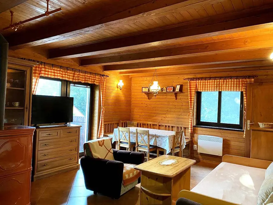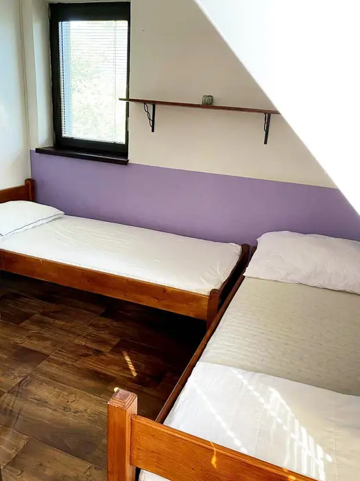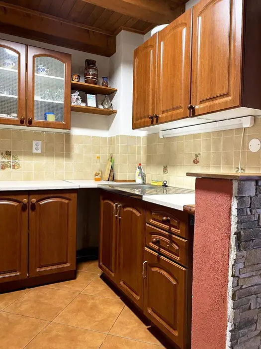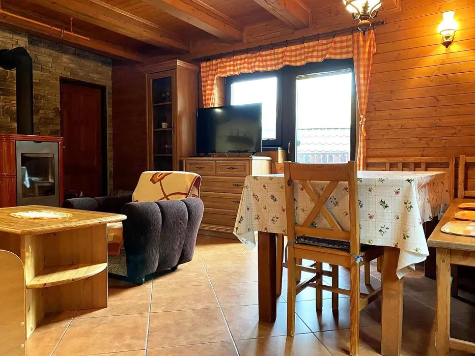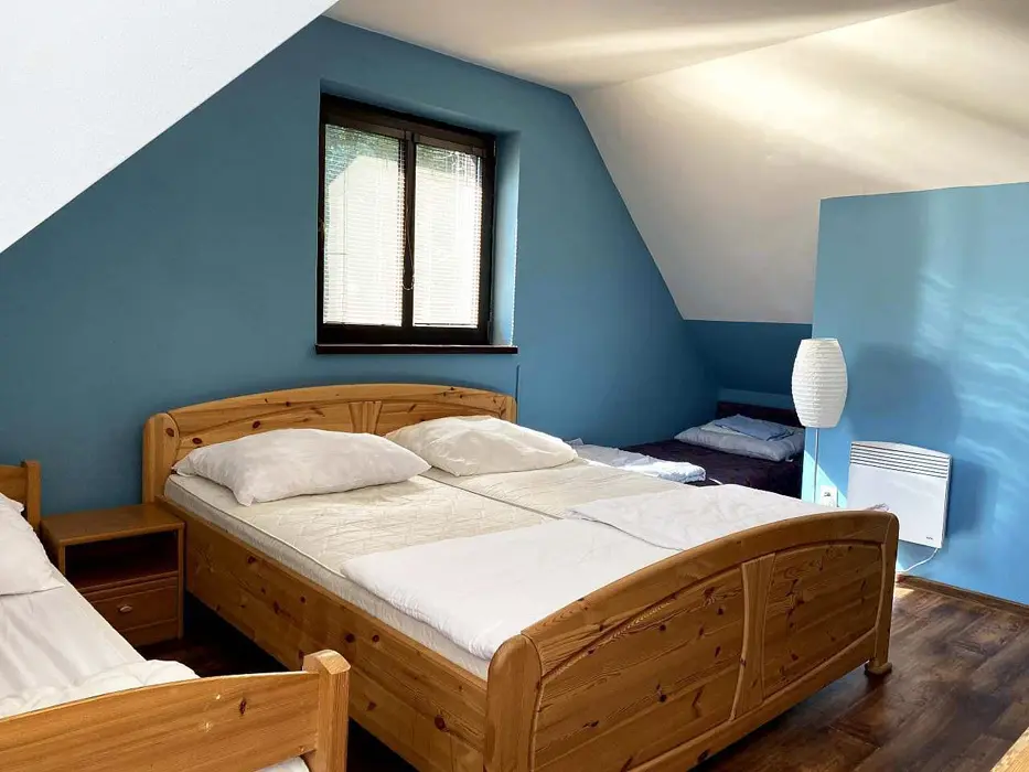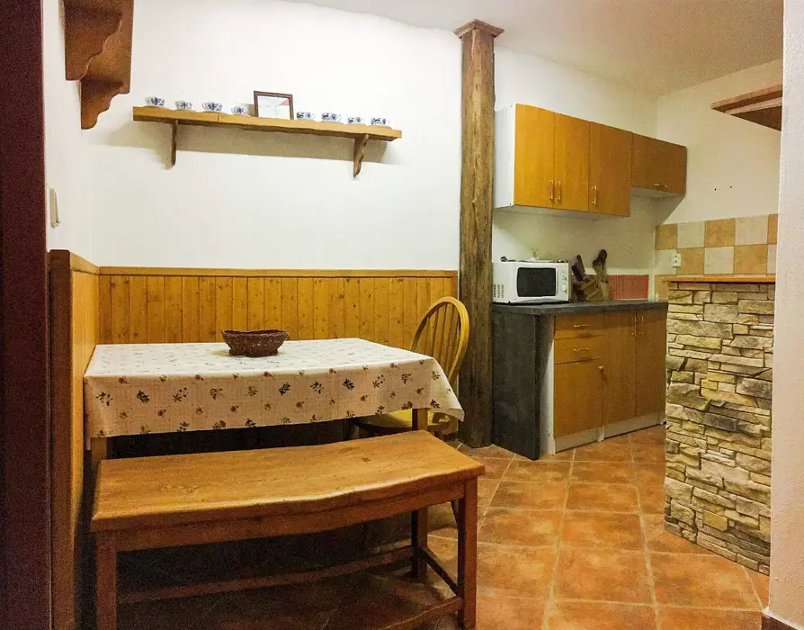 Chata je řešená jako 2 samostatné části - každá: v přízemí - vlastní vchod, obytná kuchyně, TV - el. sporák, lednice, varná konvice, mikrovlnka, nádobí, jídelní stůl a židle. 2 ložnice - 1x2, 1x3 lůžka. Soc. zařízení - sprcha, WC. V patře - vlastní vchod - obytná kuchyně s posezením, krbová kamna, TV, vybavení kuchyně - el. sporák, lednice, varná konvice, mikrovlnka, nádobí, jídelní stůl a židle. 2 ložnice - 1x3, 1x4 lůžka. Soc. zařízení - sprcha, WC. Topení - krbová kamna, el. přímotopy