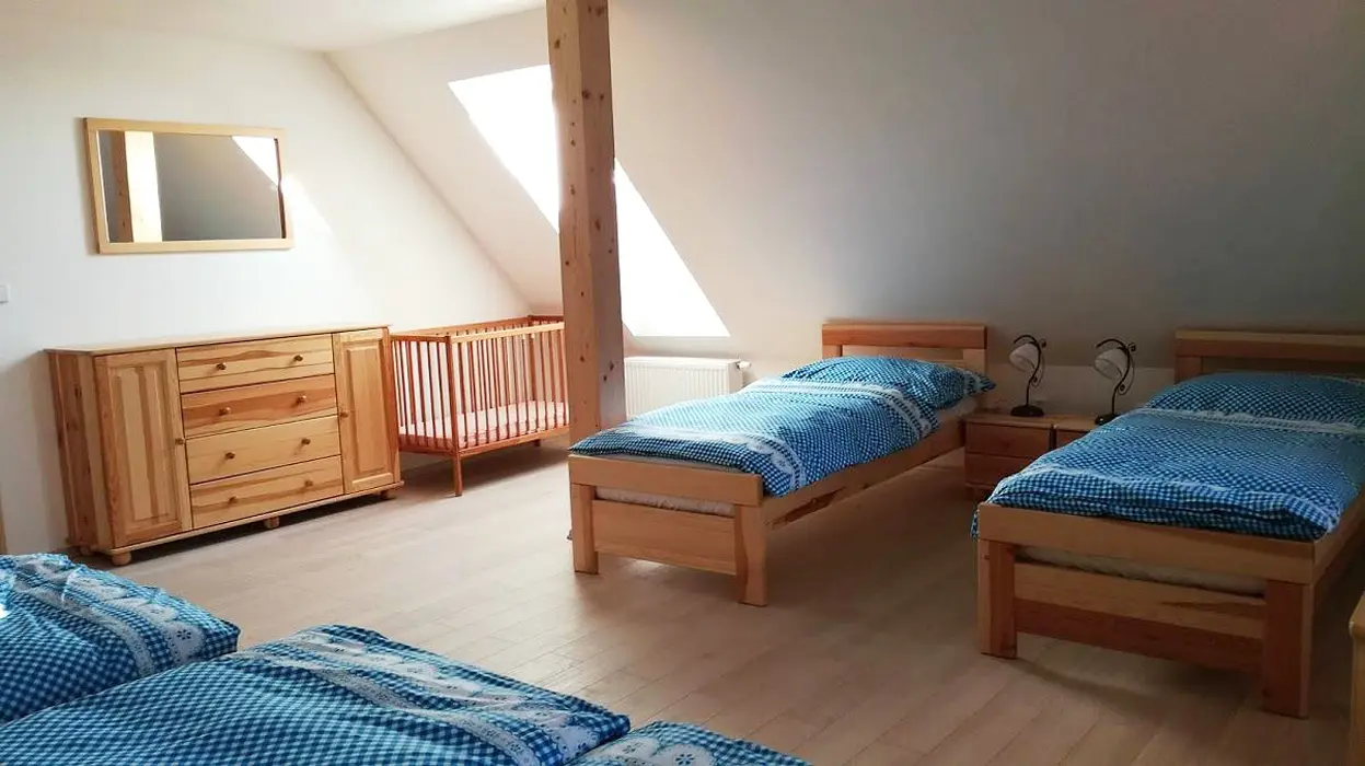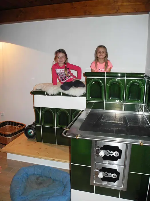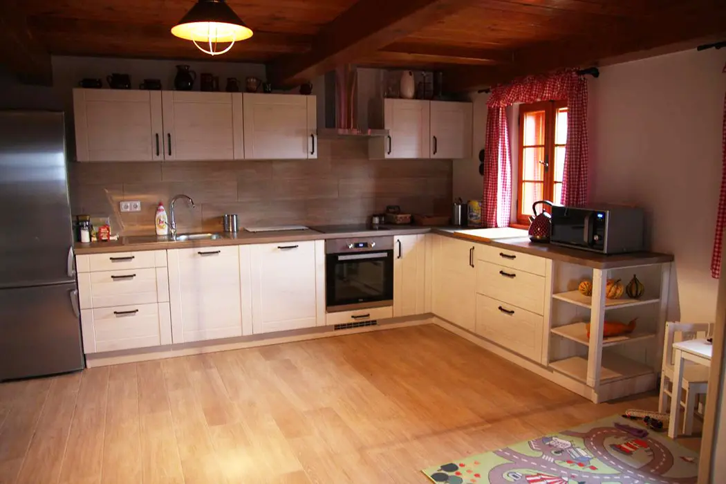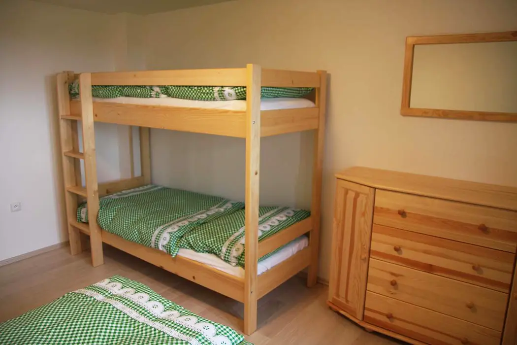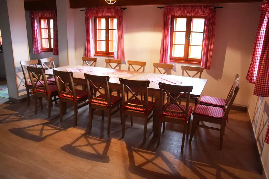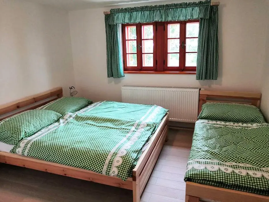 Společenská místnost s posezením pro 14 osob s kachlovými kamny a s dětským koutkem je propojená s kuchyní. Je zde televize, pohovka, společenské hry, turistické letáky, fotbálek. Kuchyně vybavena : lednice s mrazákem + lednice (na chodbě), myčka, sporák se sklokeramickou deskou a troubou, mikrovlnná trouba, rychlovarná konvice, kávovar na mletou kávu a kávové pody ESE, mixér, tyčový mixér, sendvičovač a základní nádobí. 4 ložnice : 1x3, 1x4 a 2x5 + 1. 3x sociální zařízení. V přízemí 1x koupelna se sprchovým koutem, umyvadlem, pračkou a sušičkou, WC zvlášť + druhá koupelna u sauny - sprchový kout a WC. Třetí koupelna je v patře se sprchovým koutem a dvojumyvadlem + 2x samostatné WC. Topení ústřední + kachlová kamna.
