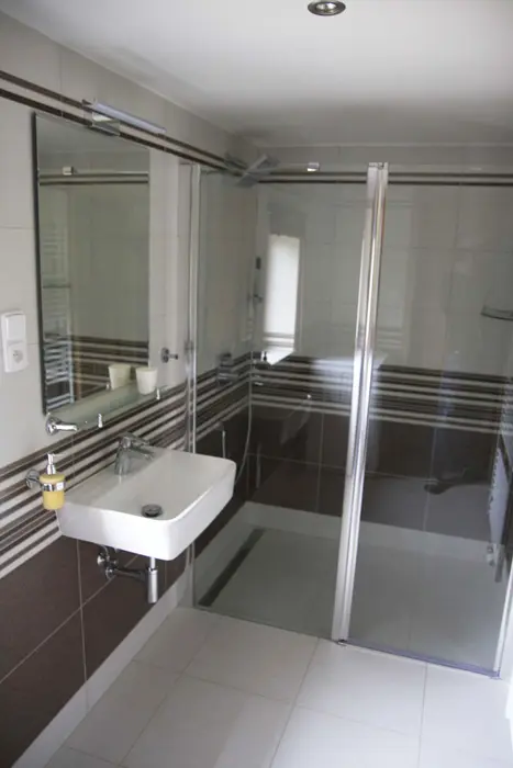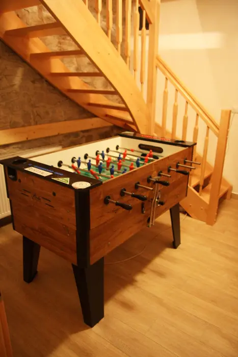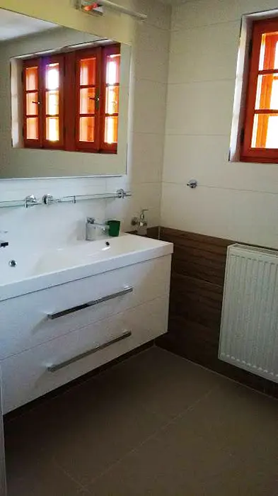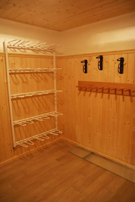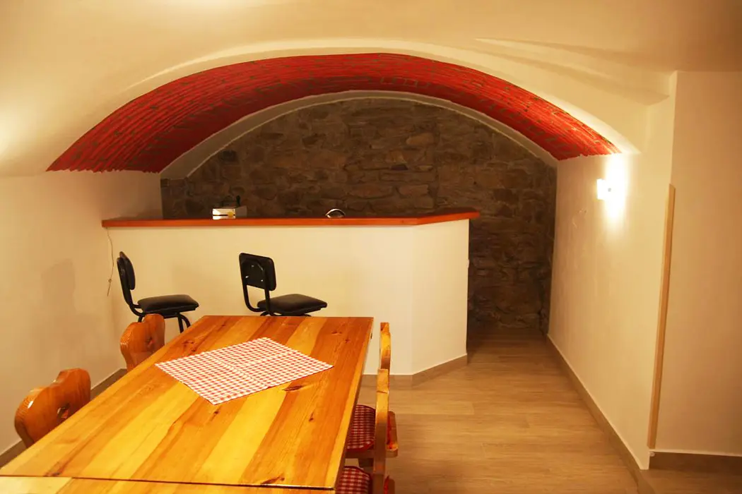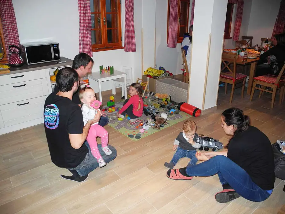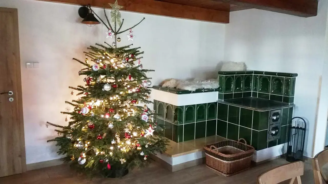 Společenská místnost s posezením pro 14 osob s kachlovými kamny a s dětským koutkem je propojená s kuchyní. Je zde televize, pohovka, společenské hry, turistické letáky, fotbálek. Kuchyně vybavena : lednice s mrazákem + lednice (na chodbě), myčka, sporák se sklokeramickou deskou a troubou, mikrovlnná trouba, rychlovarná konvice, kávovar na mletou kávu a kávové pody ESE, mixér, tyčový mixér, sendvičovač a základní nádobí. 4 ložnice : 1x3, 1x4 a 2x5 + 1. 3x sociální zařízení. V přízemí 1x koupelna se sprchovým koutem, umyvadlem, pračkou a sušičkou, WC zvlášť + druhá koupelna u sauny - sprchový kout a WC. Třetí koupelna je v patře se sprchovým koutem a dvojumyvadlem + 2x samostatné WC. Topení ústřední + kachlová kamna.